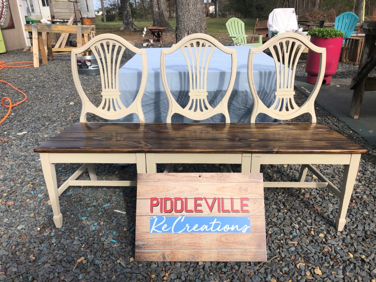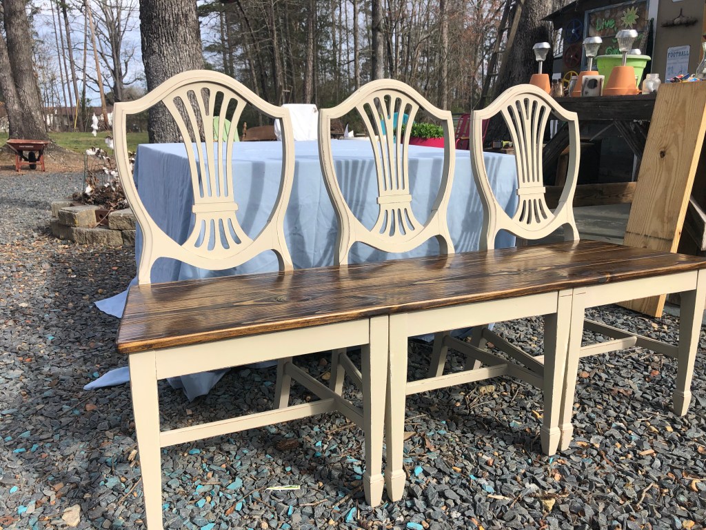 Beautiful bench using 3 older dining room chairs. Chairs are attached together and the seat of the bench is formed using shiplap boards. Chairs were chalk painted and distressed in a light tan and the bench was stained dark walnut and finished with gloss polyurethane.