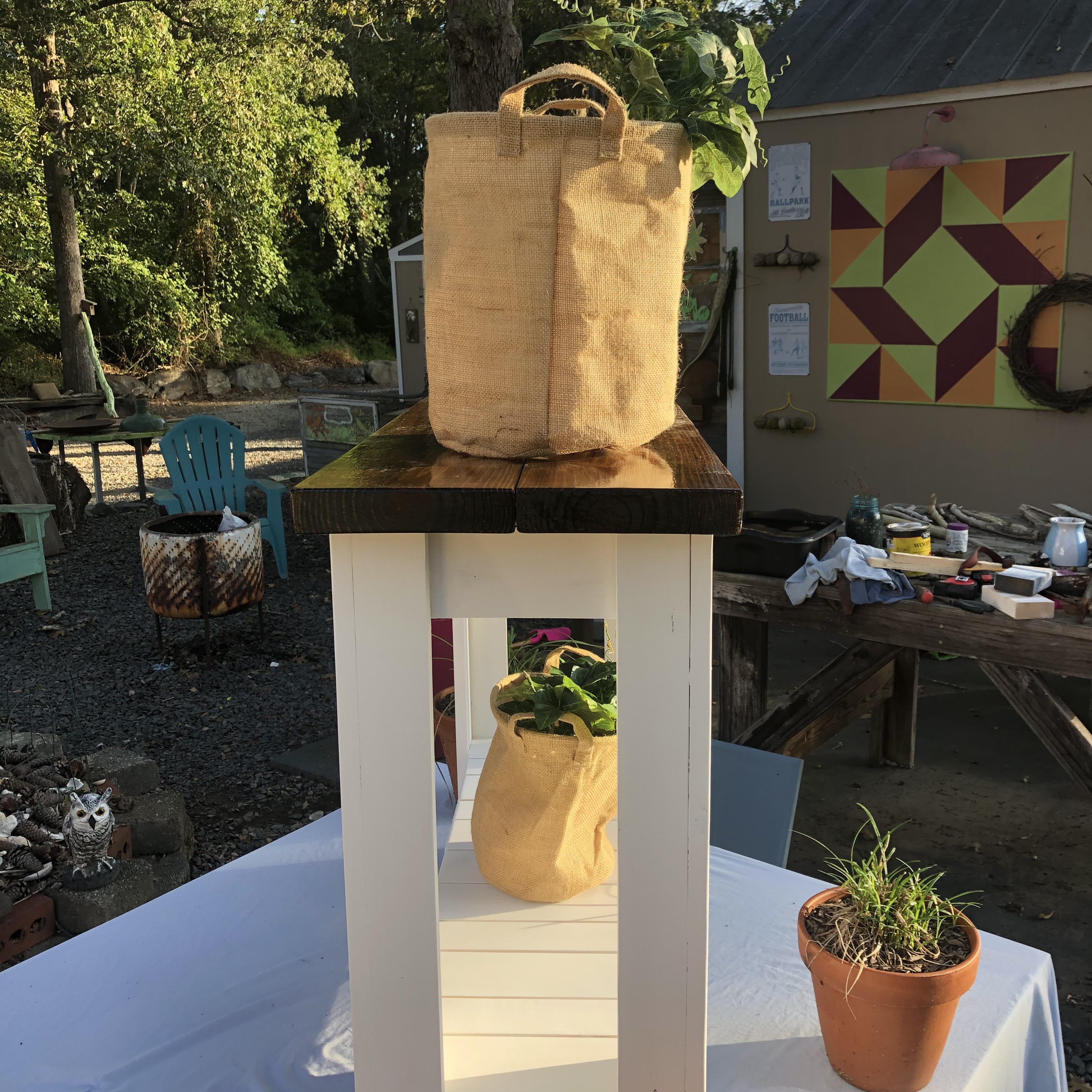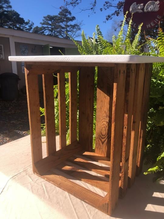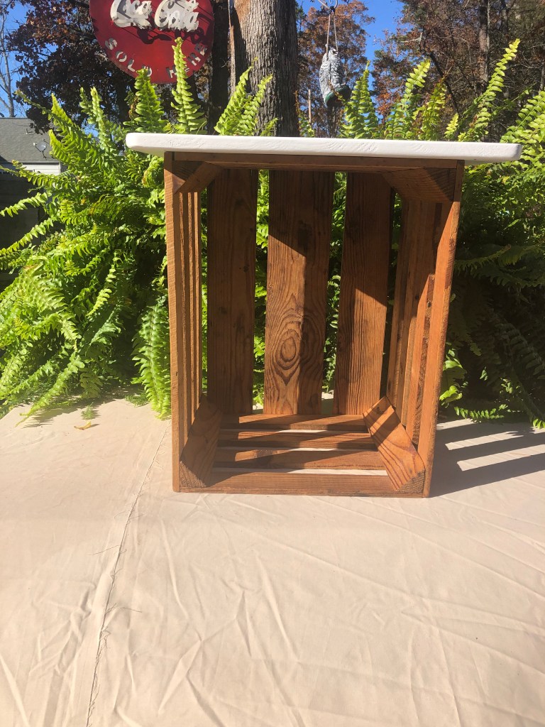 Apple crate side table utilizes an apple crate as its base with a pine wood top. Pinewood top is painted white – this can be customized. Top measures 19″ x 16″. Crate is 15″ wide and 12″ deep. Works great for additional storage space or work space in a living room, child’s room, or bathroom.