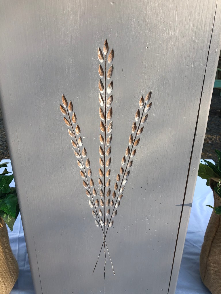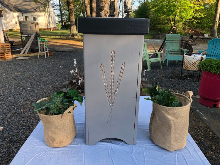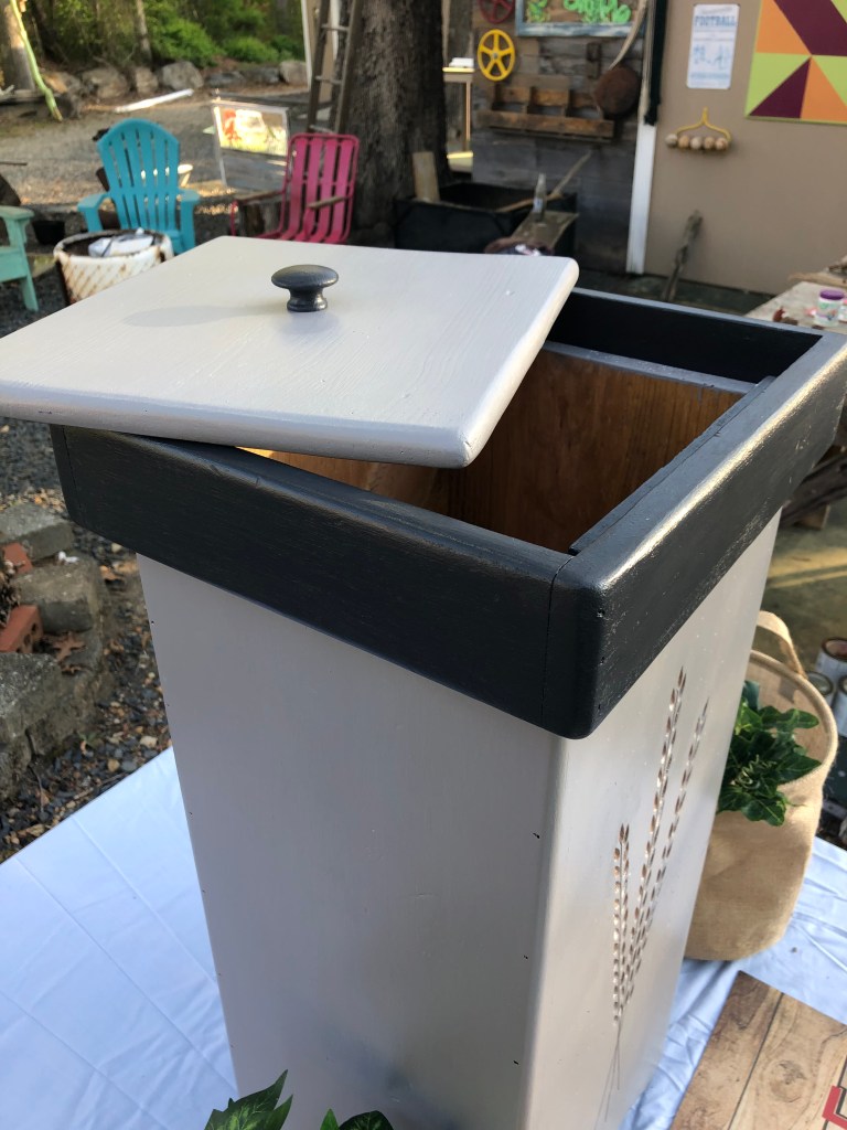 Old wooden storage container has been painted manatee gray with a navy blue rim to hold the top. Front of container has been decorated with a three wheat design to add to the appearance. Unit could be used in a variety of ways to store many of your day to day items. Unit was being used to store dog/cat food to help hide and prevent a nuisance. Container can be used to store a variety of items as needed.