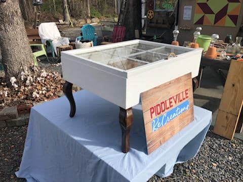 Utilizing an old window, shiplap, and used legs, we have created a unique Window Coffee Table for the dining or living room. Table frame is 6″ deep and the window is hinged to allow for magazines, books, remotes, etc inside the table. Window and table frame are painted white while the inside shiplap and legs are stained a deep walnut.