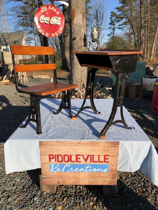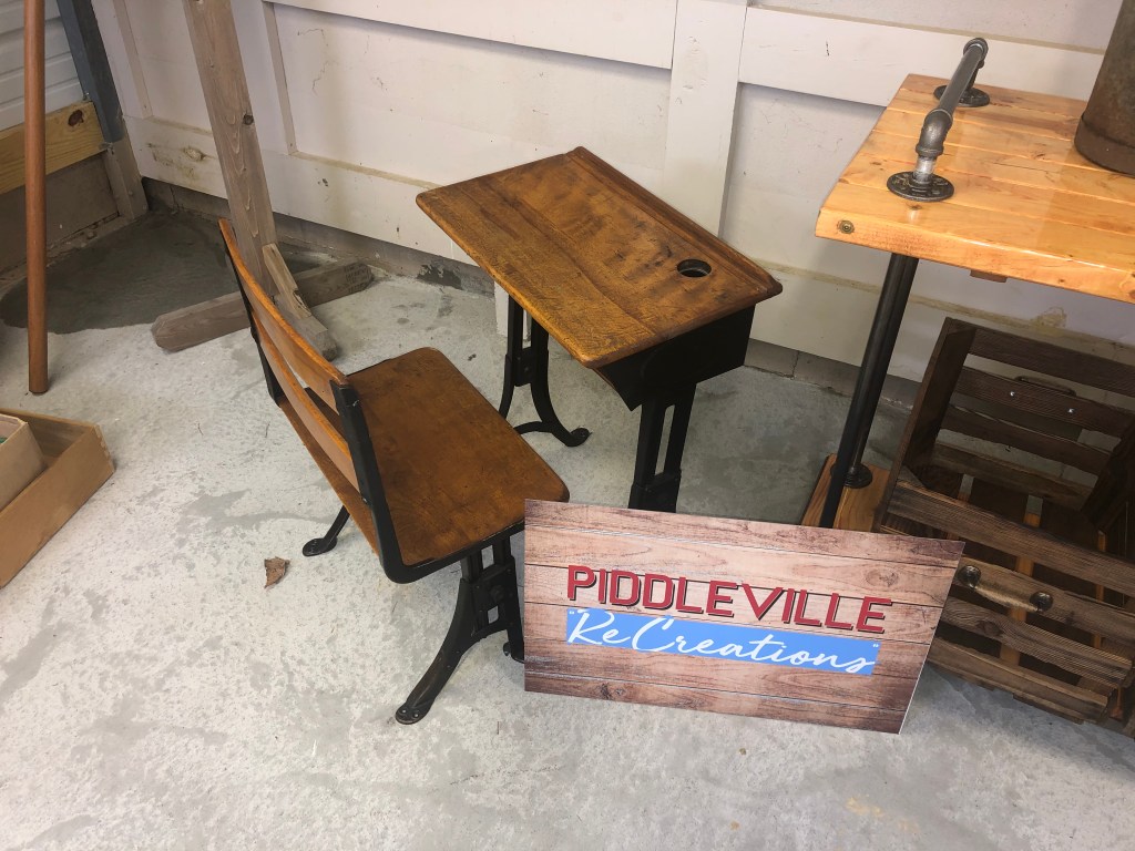 Back to the days when our school desks and chairs were bolted to the floor in rows we have a vintage desk and chair that brings back all those memories. Desk has the open slot under the top where books, pads, and pencils were stored. Great accent piece for any room.