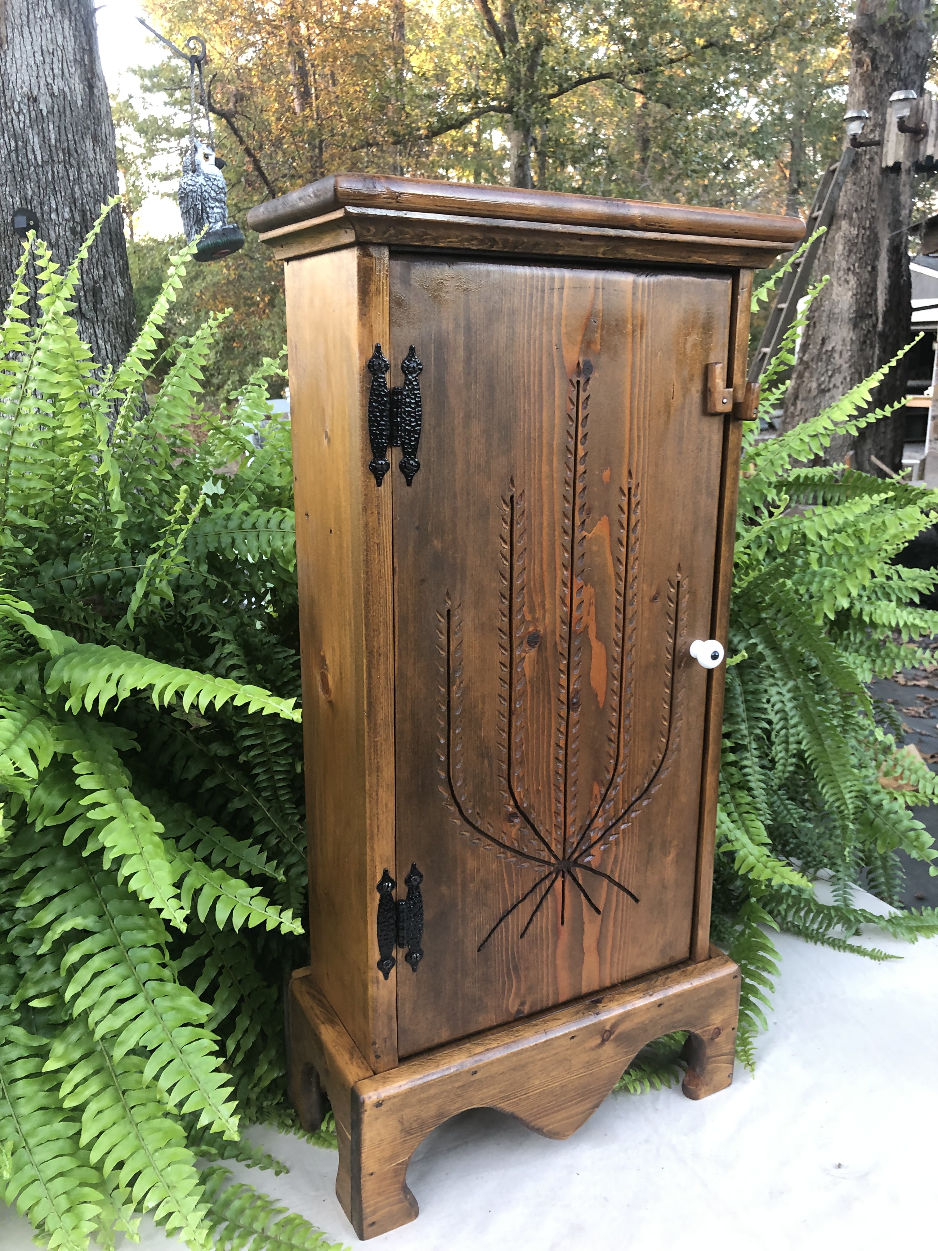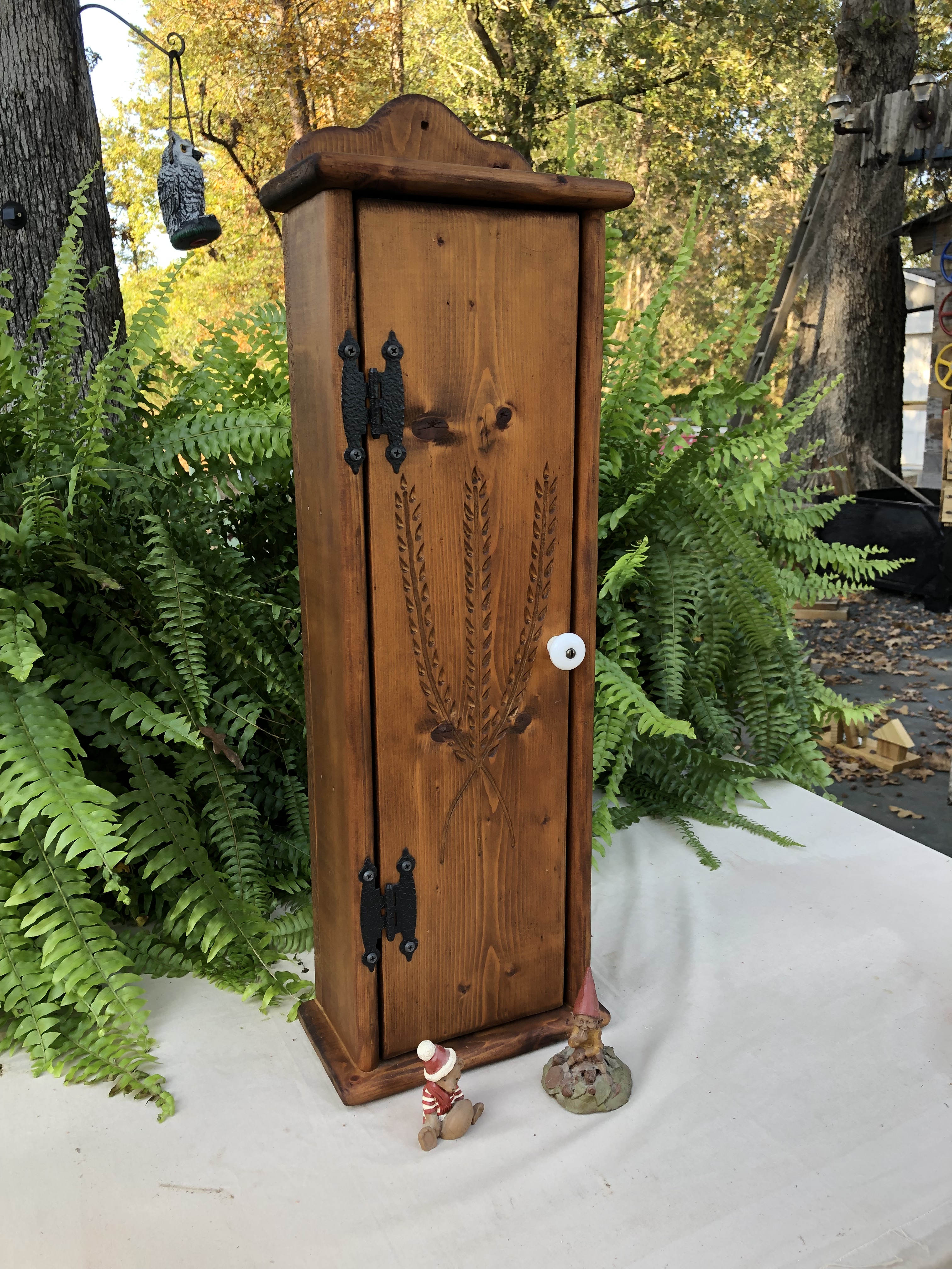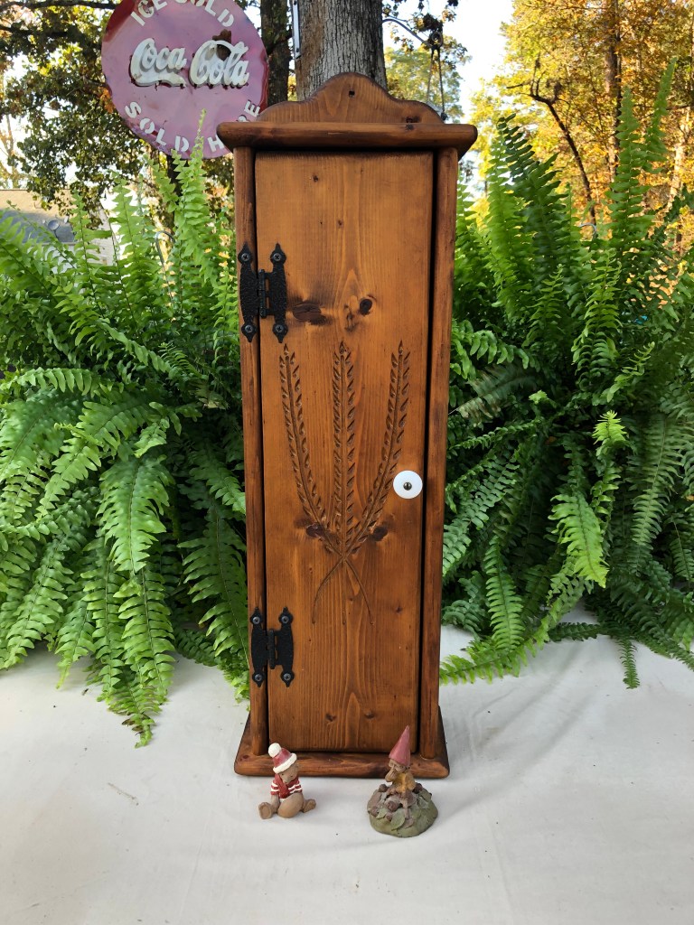 Unique handmade display cabinet designed to hold those smaller items around the house. Cabinet was built using one horizontal shelf and two vertical spaces for storage. Cabinet has a wood latch single door with the wheat design carved into the door. Cabinet is made from spruce pine with a walnut finish.