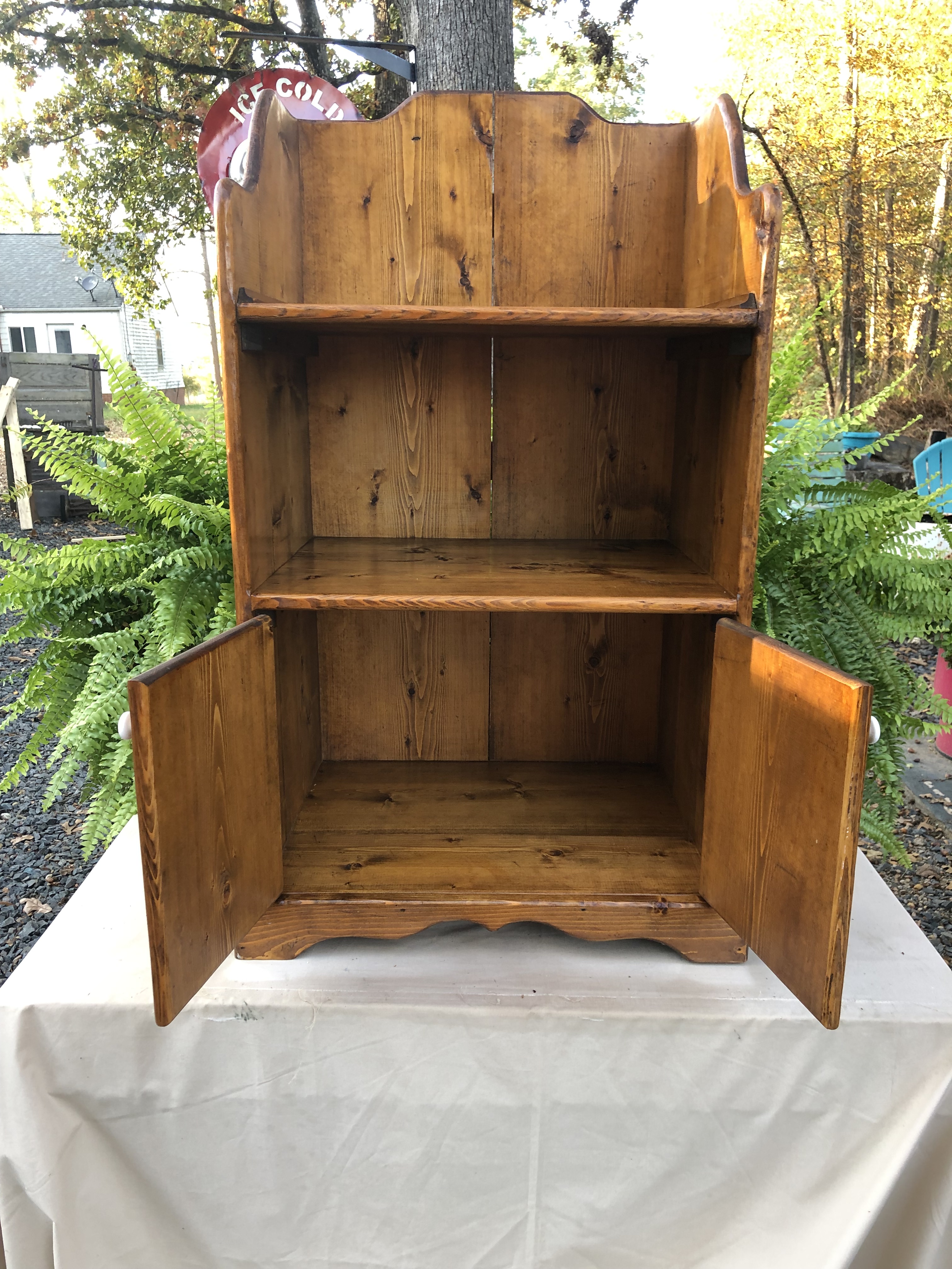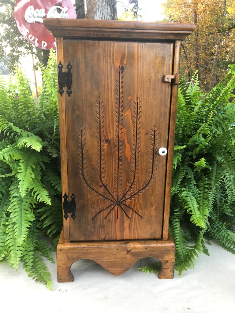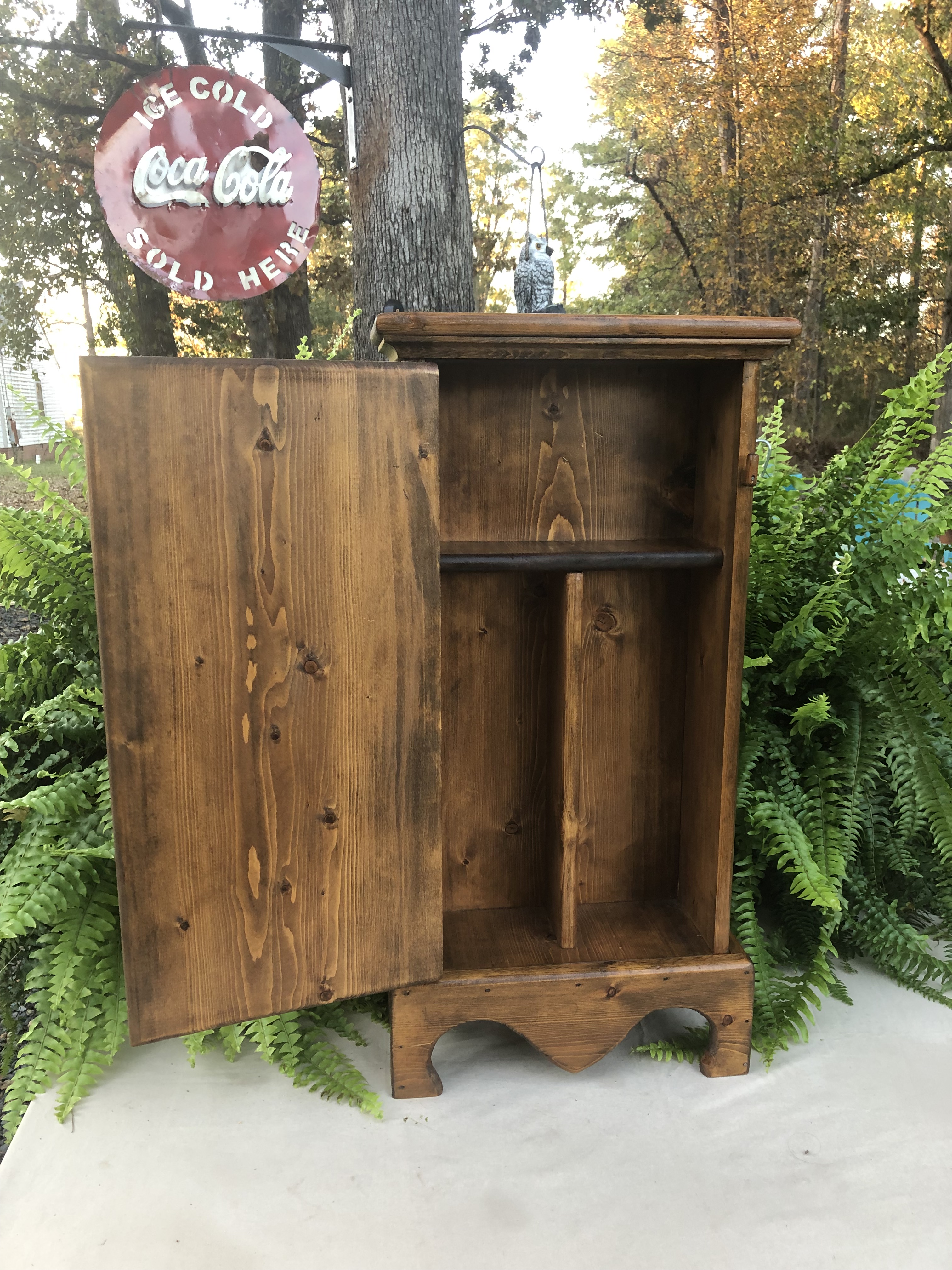 Unique handmade display cabinet designed to hold those smaller items around the house. Cabinet was built using one horizontal shelf and two vertical spaces for storage. Cabinet has a wood latch single door with the wheat design carved into the door. Cabinet is made from spruce pine with a walnut finish.