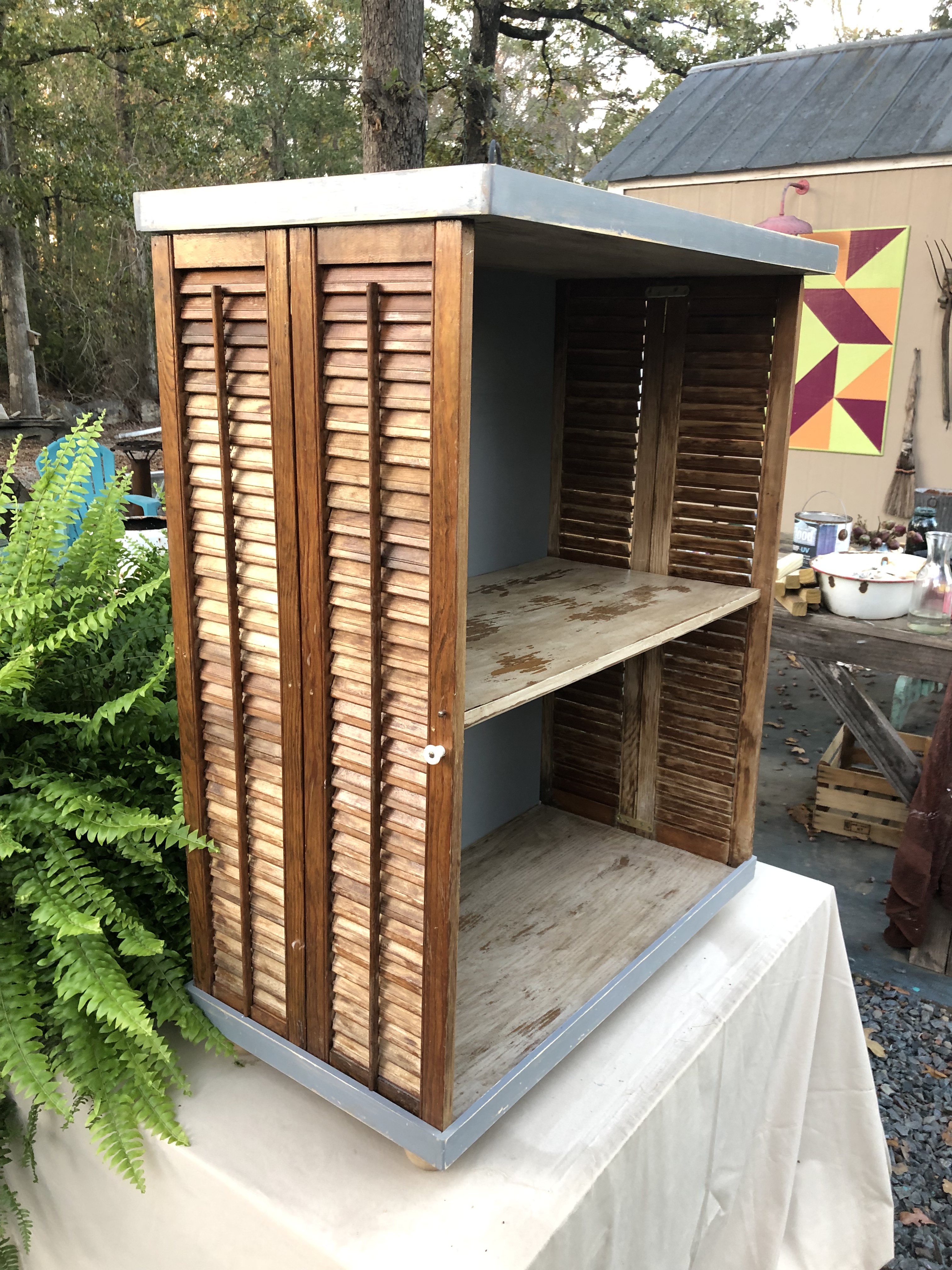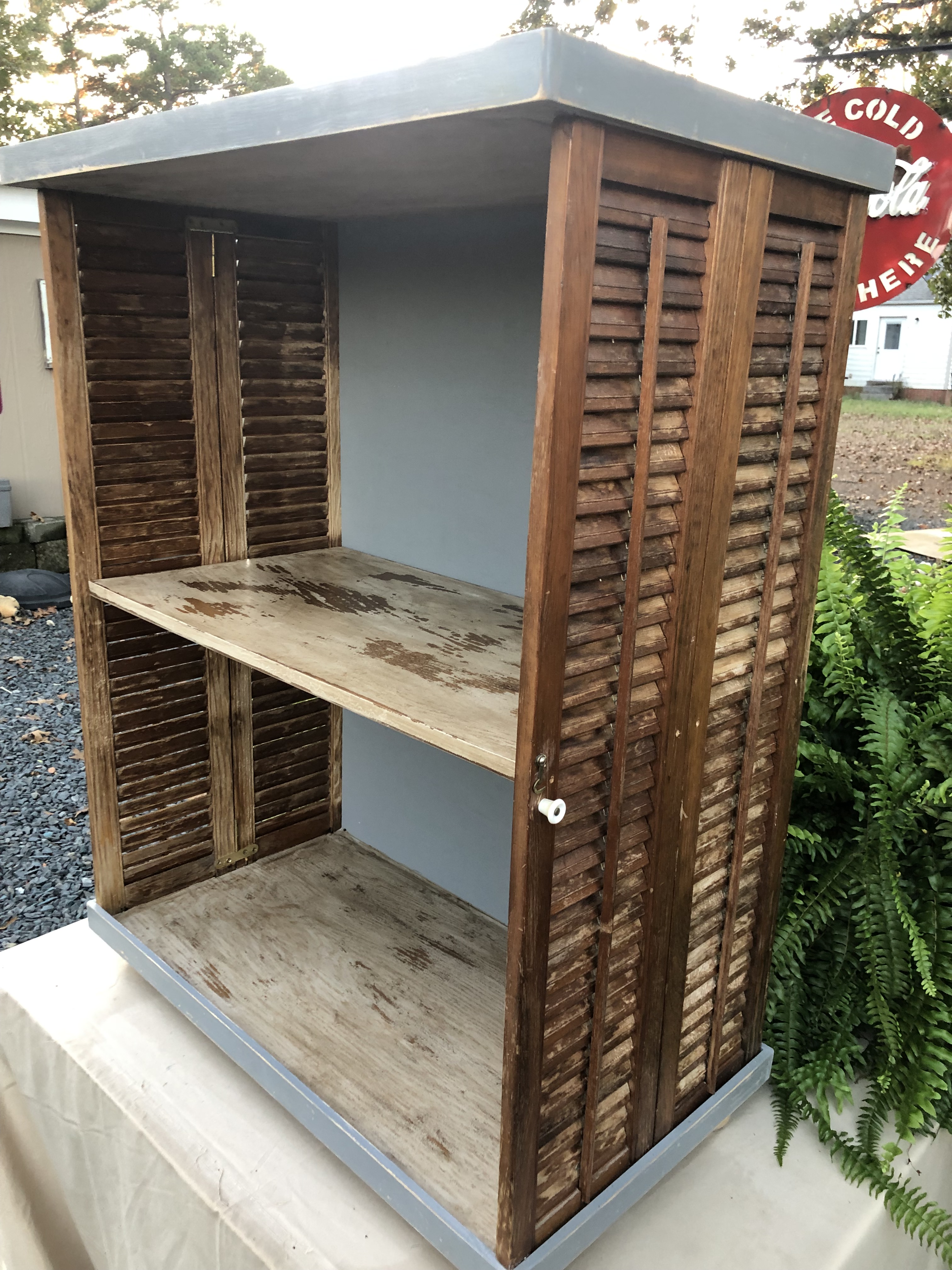 We have taken two old window shutters, added a base, shelf and top to create this usable cabinet to store a variety of items. Bottom, top, and shelf are chalk painted in white, distressed, and sealed with dark wax. Back and top and bottom rims are chalk painted blue. Shutters were left unfinished. Short legs were installed under the unit to raise it off the floor.