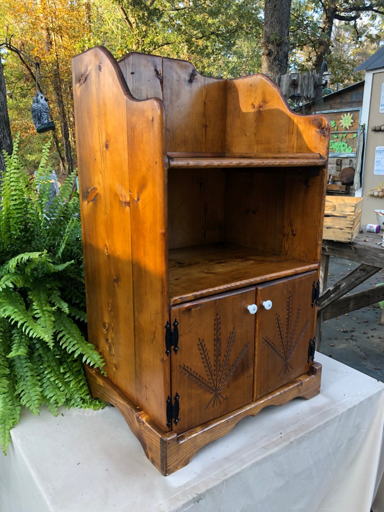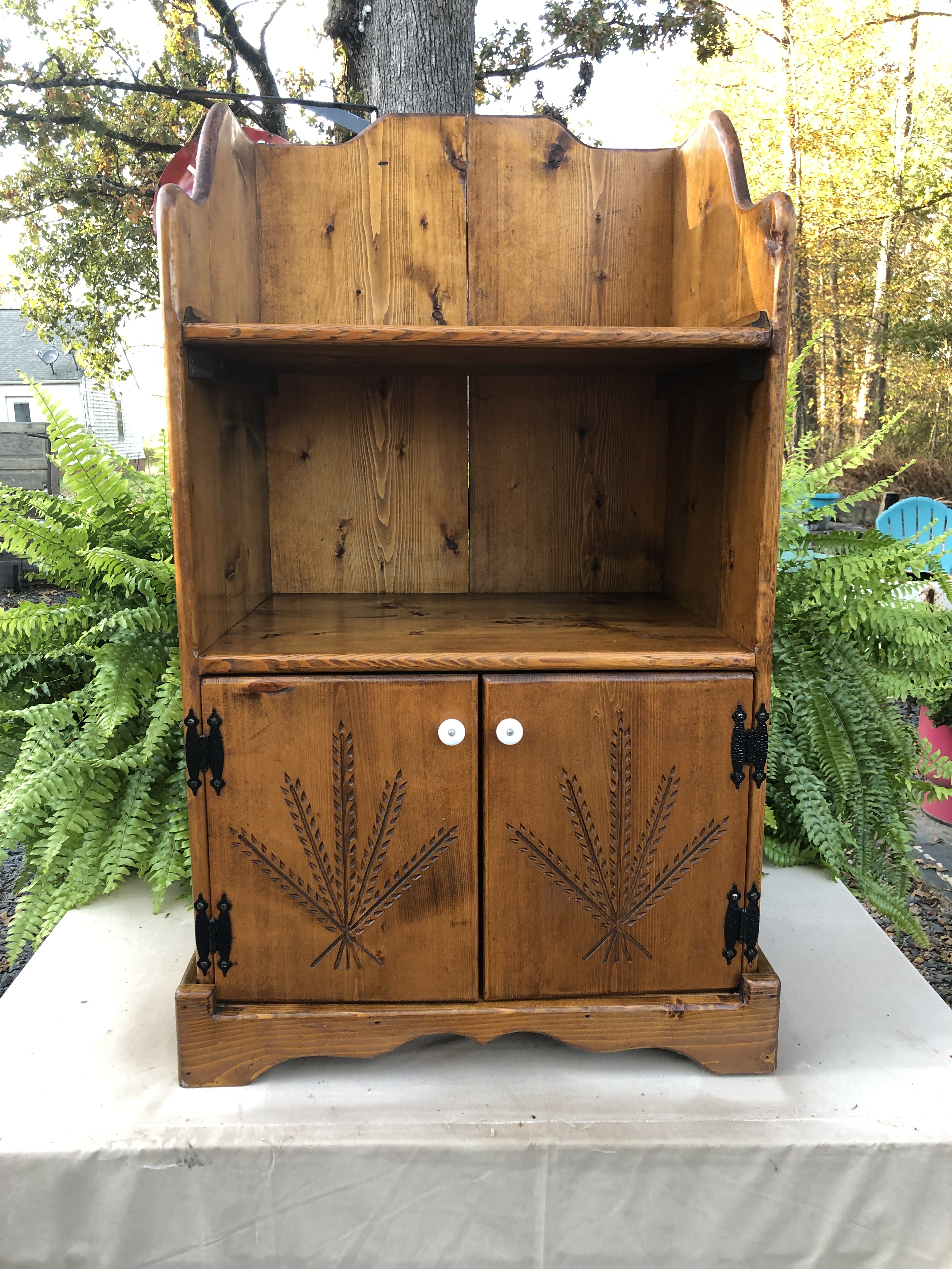 Handmade cabinet was originally built to house a stereo system. Cabinet is made from spruce pine with a walnut stain finish. Cabinet incorporates two shelves and a storage space underneath – behind the two doors. A unique wheat design was cut into both doors. Cabinet can be used for a multitude of options.