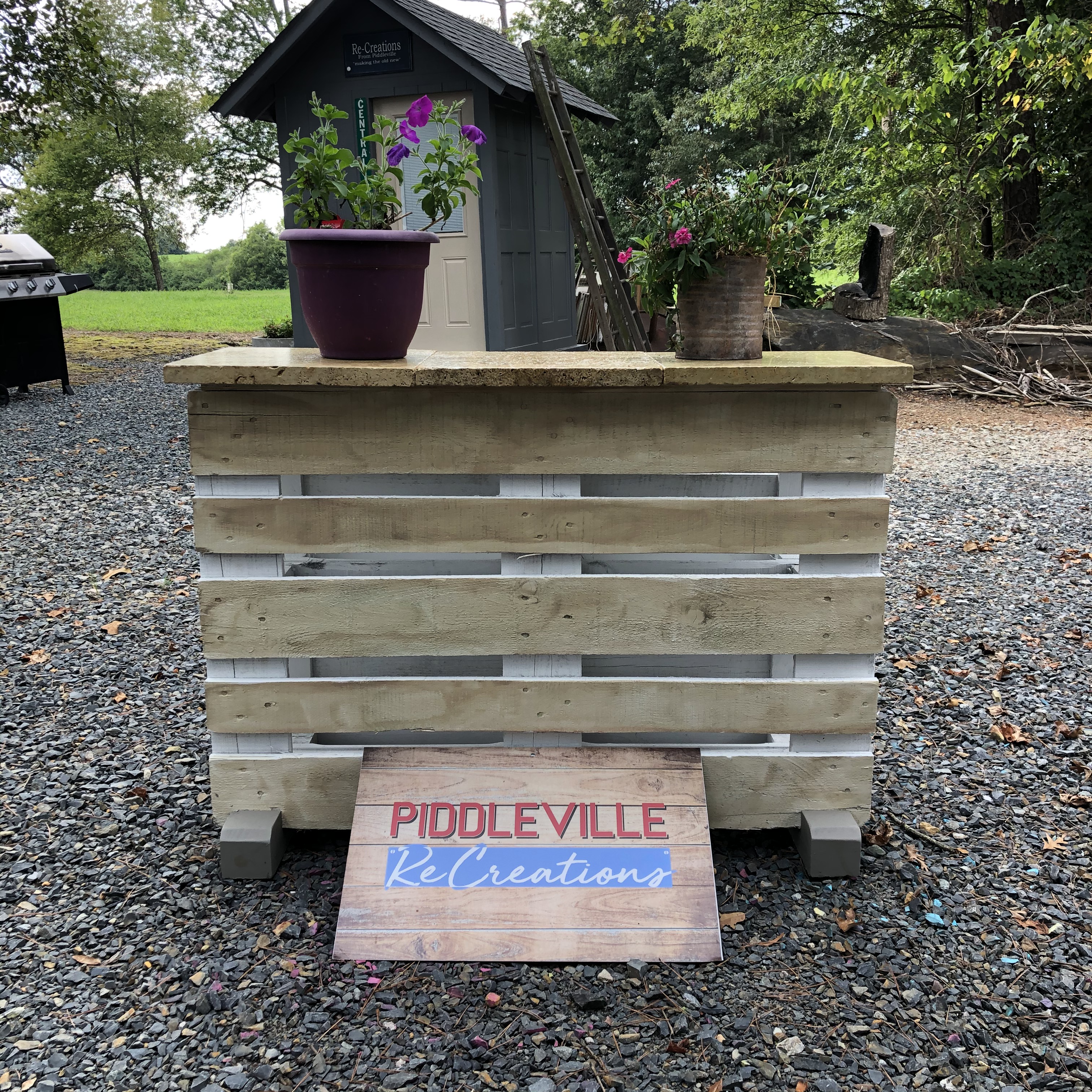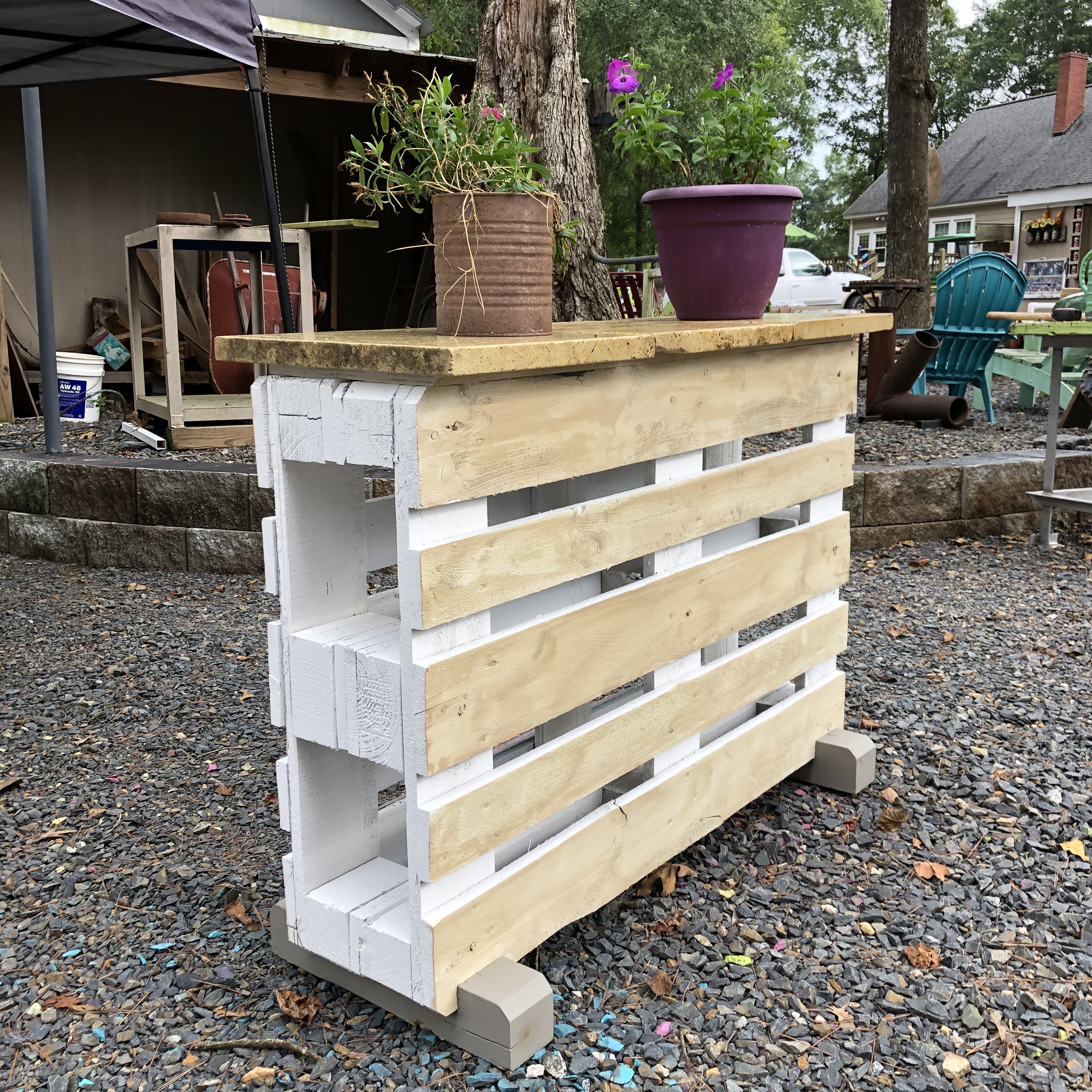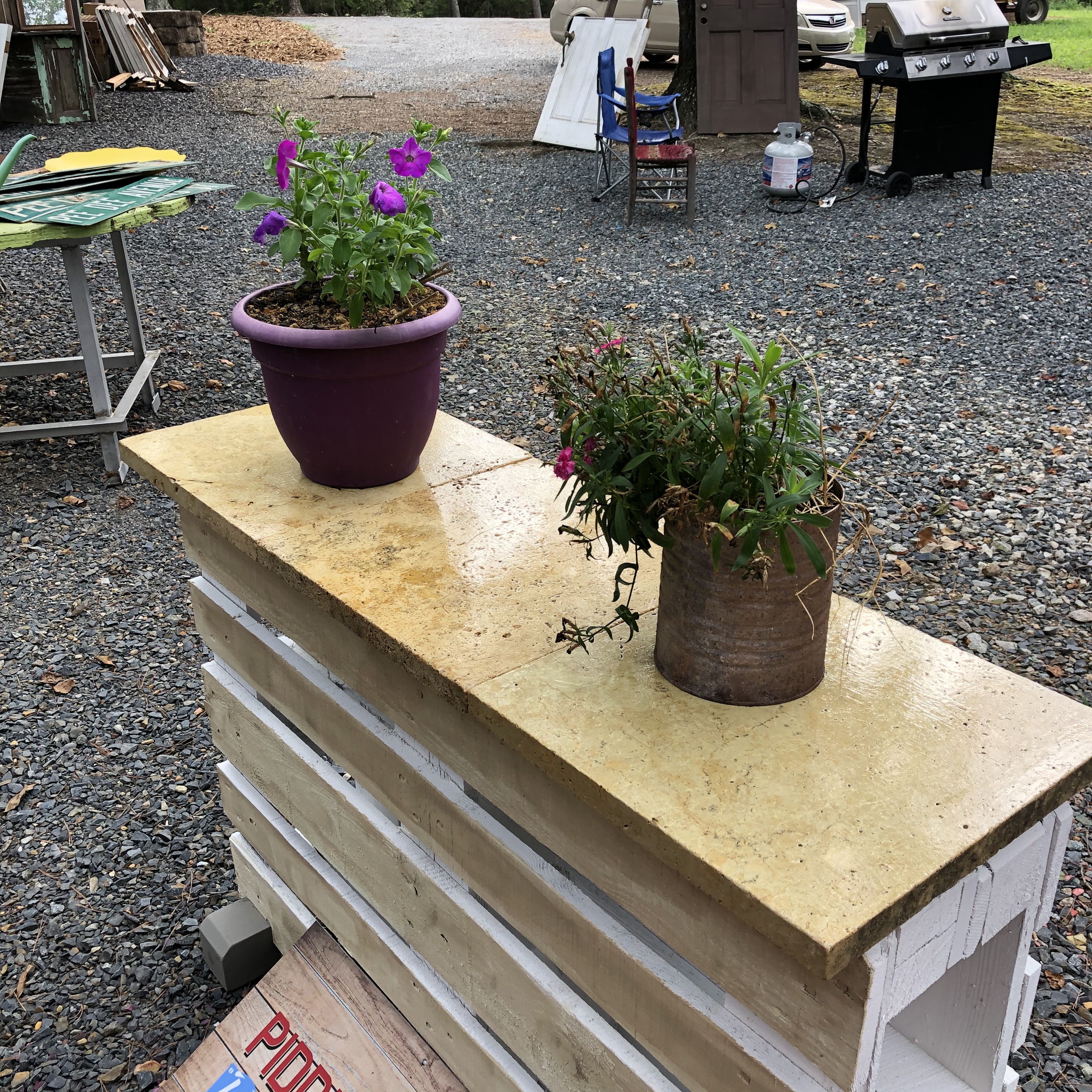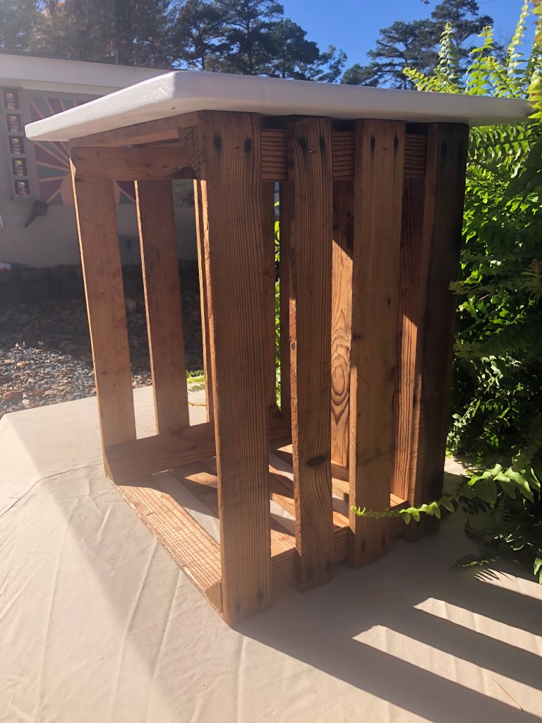 Looking for the heavy industrial look around your pool or deck? We have incorporated these items in this pool/deck pallet table. We combined (2) heavy industrial wooden pallets, added treated lumber supports to hold the unit upright, and then topped it off with 16″ x 16″ granite landscape pavers. Pallets were painted white inside and out and then accented with a light tan pain to give it a weathered look. Granite landscape pavers were sealed with high gloss polyurethane. Pallet table will make a perfect addition to your grilling area as a place for plates, utensils, drinks, etc or can also be a perfect display table for outdoor plants or other items would wish to display.