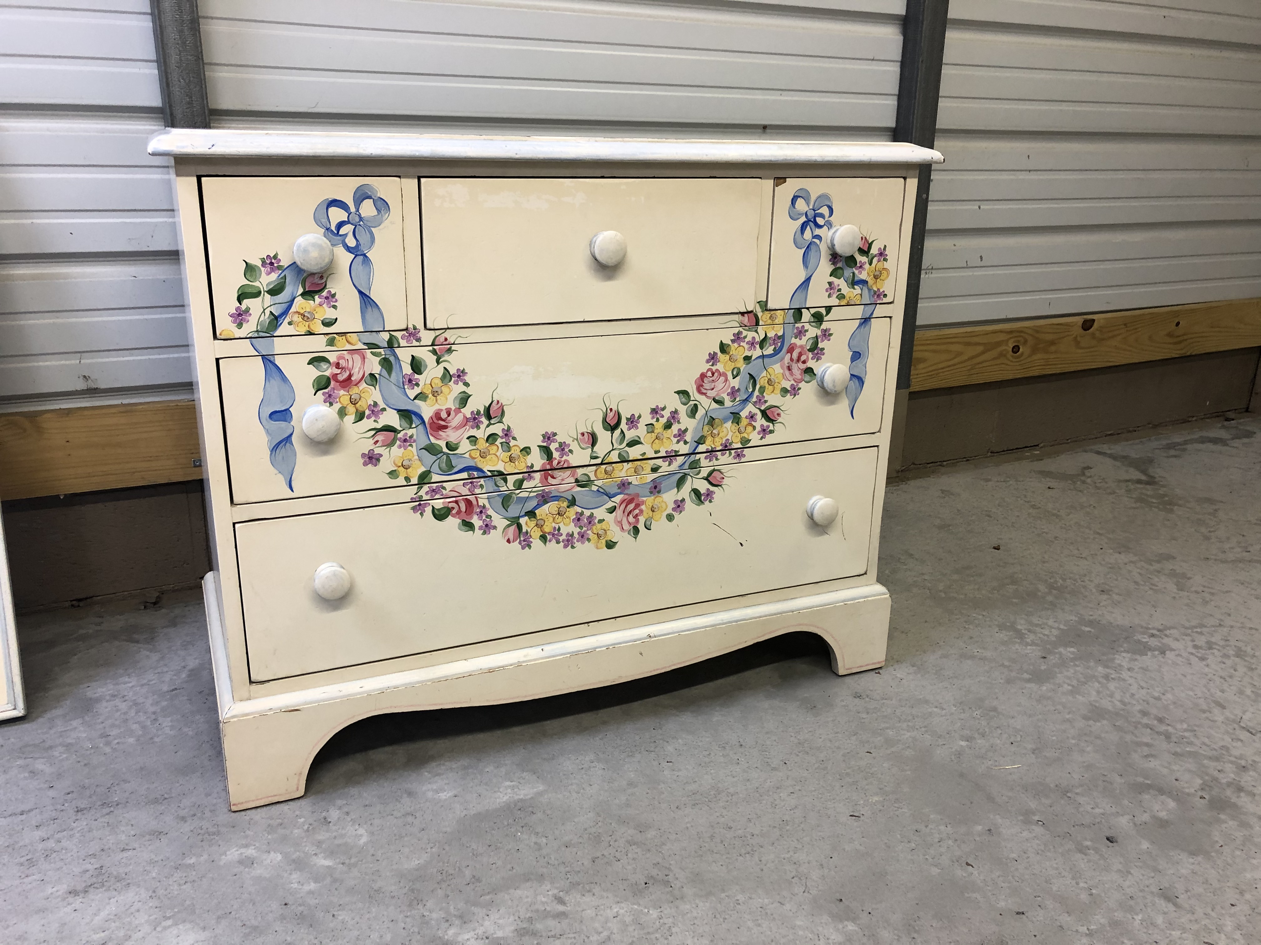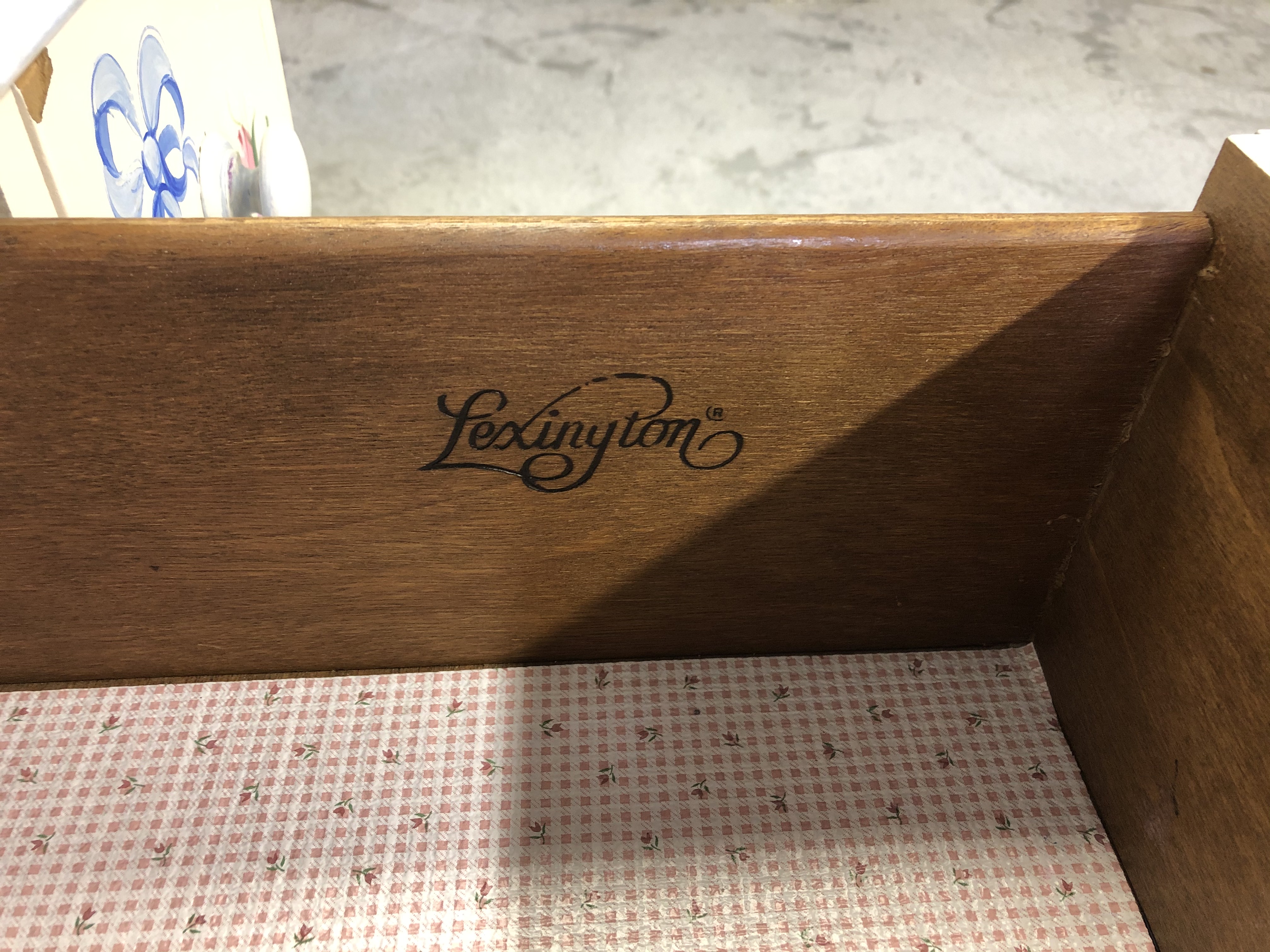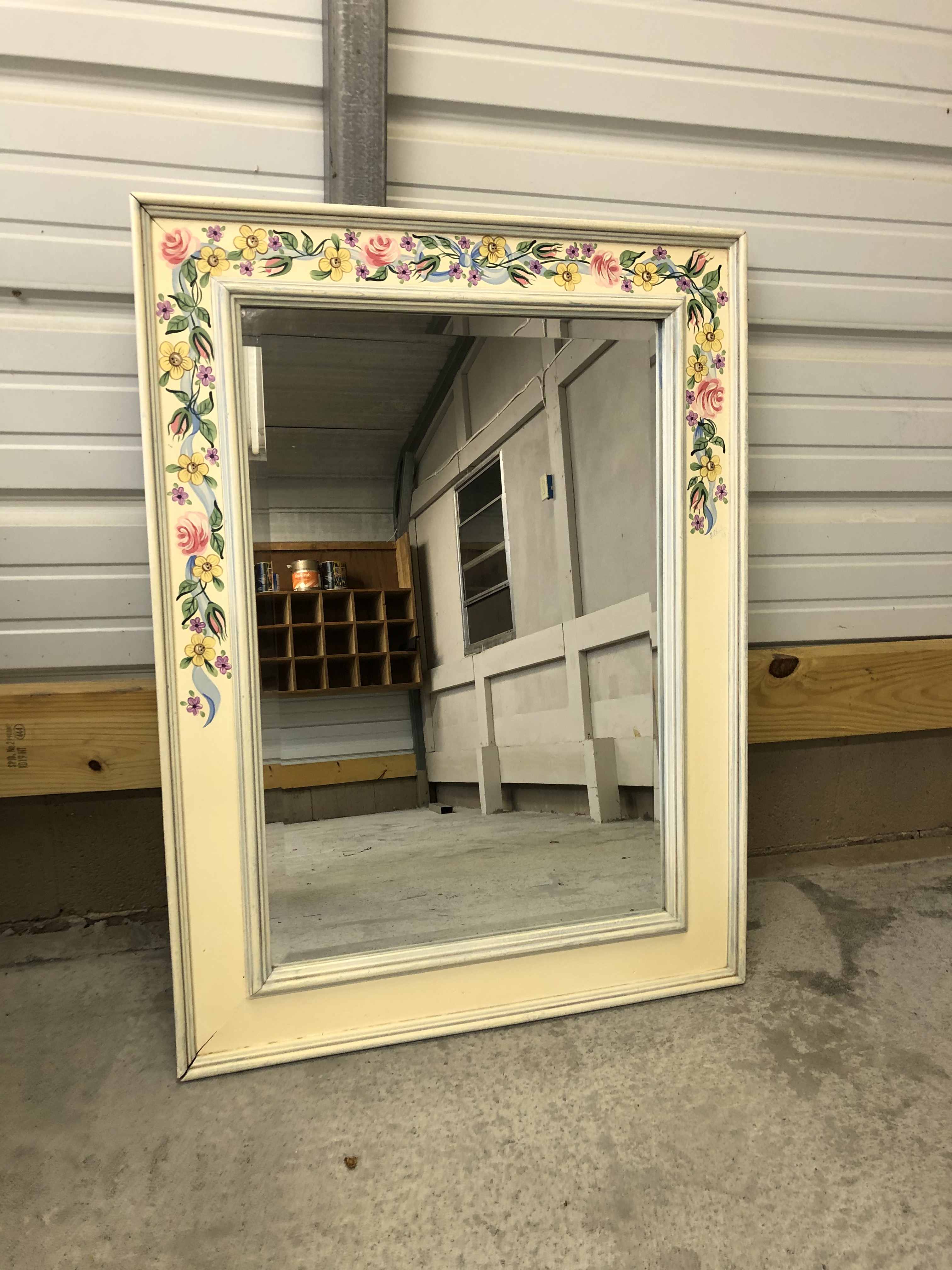 We have picked up a beautiful used dresser and large mirror made by Lexington. The unique floral pattern is incorporated throughout both the dresser and mirror. Could be used in a child’s room, office space or display area. Dresser has five drawers. Mirror is designed to hand on the wall.