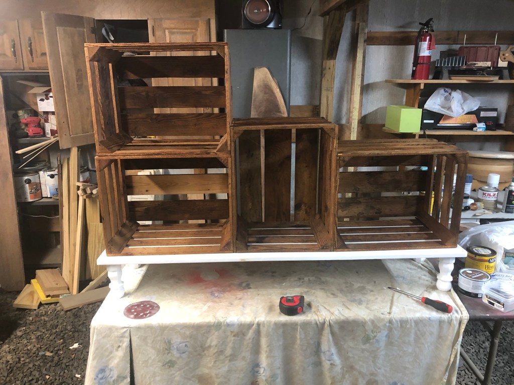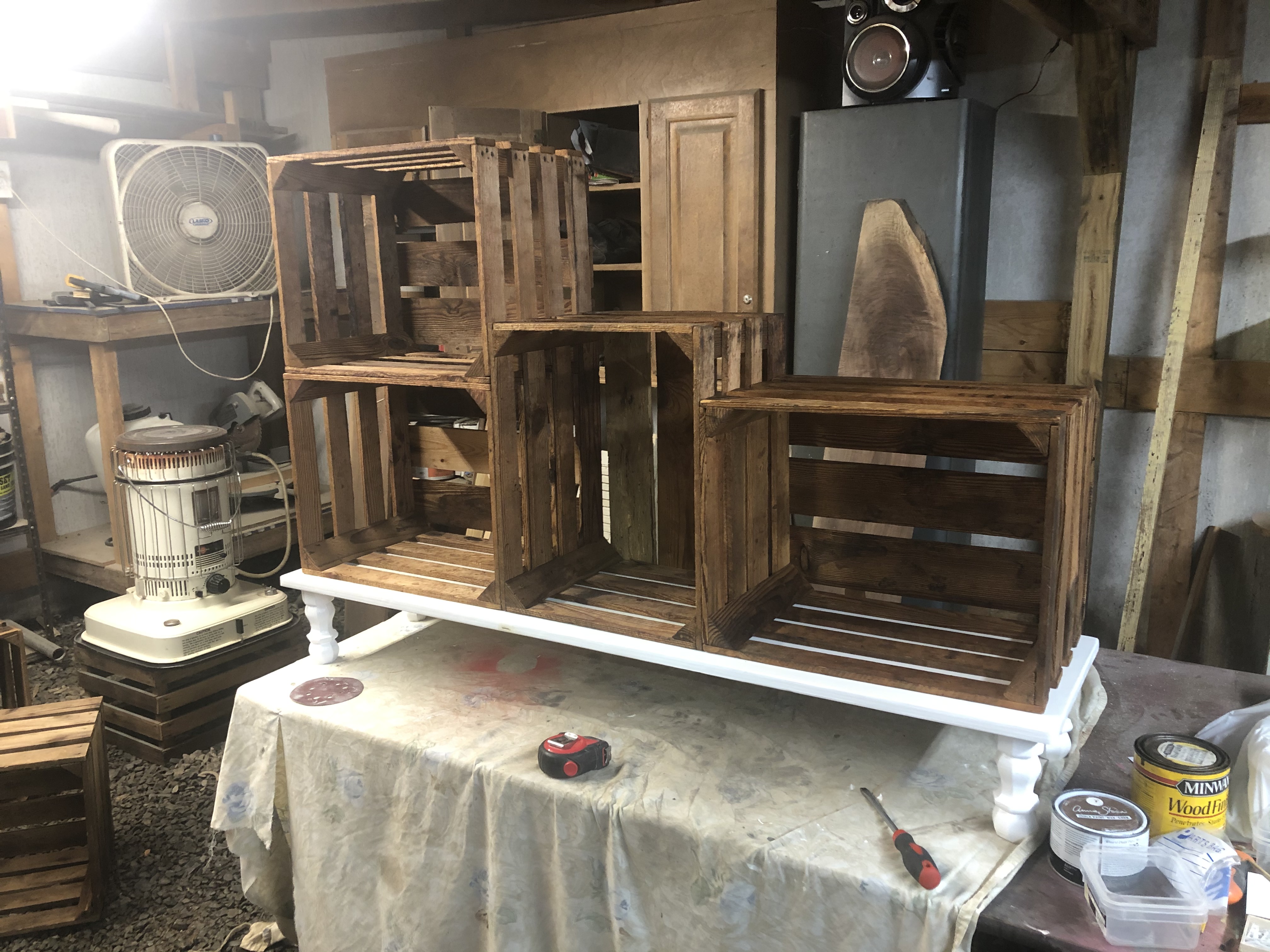 Perfect for a mudroom, entrance way, child’s room or anywhere in the house that you need additional storage. Four crates have been connected and attached to a plywood base to prevent movement while you fill with shoes, toys, etc. Base is raised off the floor with 6″ legs to allow for cleanup around the unit. Base and legs are painted white while crates were oiled to bring out their natural finish.