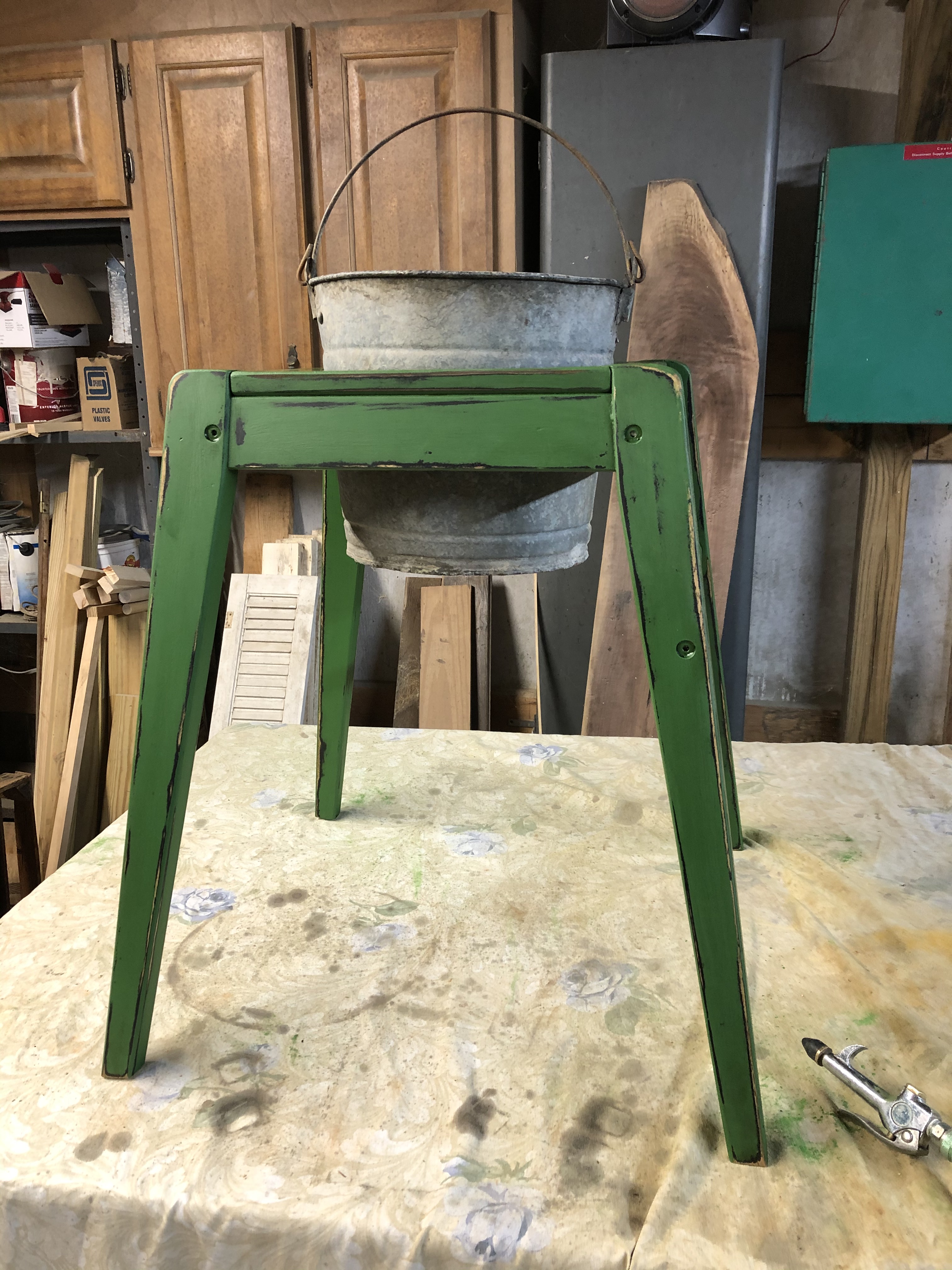 We took an old high chair, cut off the back and then cut a hole in the seat. A galvanized bucket was added to form a unique planter that can be used inside or out. We painted it green and then distressed it back to the wood. Perfect for a deck, porch or garden area by just adding plants or flowers to the bucket.