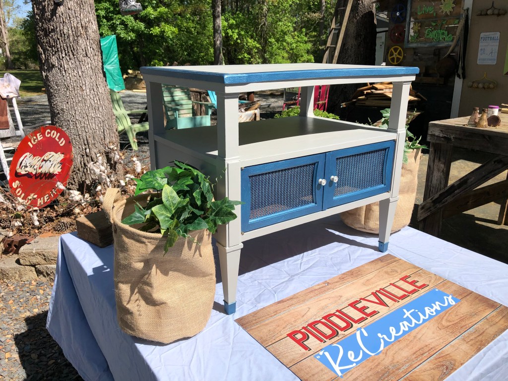 We have taken this small cabinet and restored it with new Driftwood Grey color paint along with a new metallic blue accent. Cabinet could be used for a variety of purposes including small TV stand, computer desk, storage, or possibly a small dining room hutch. Two center doors open to provide additional storage.