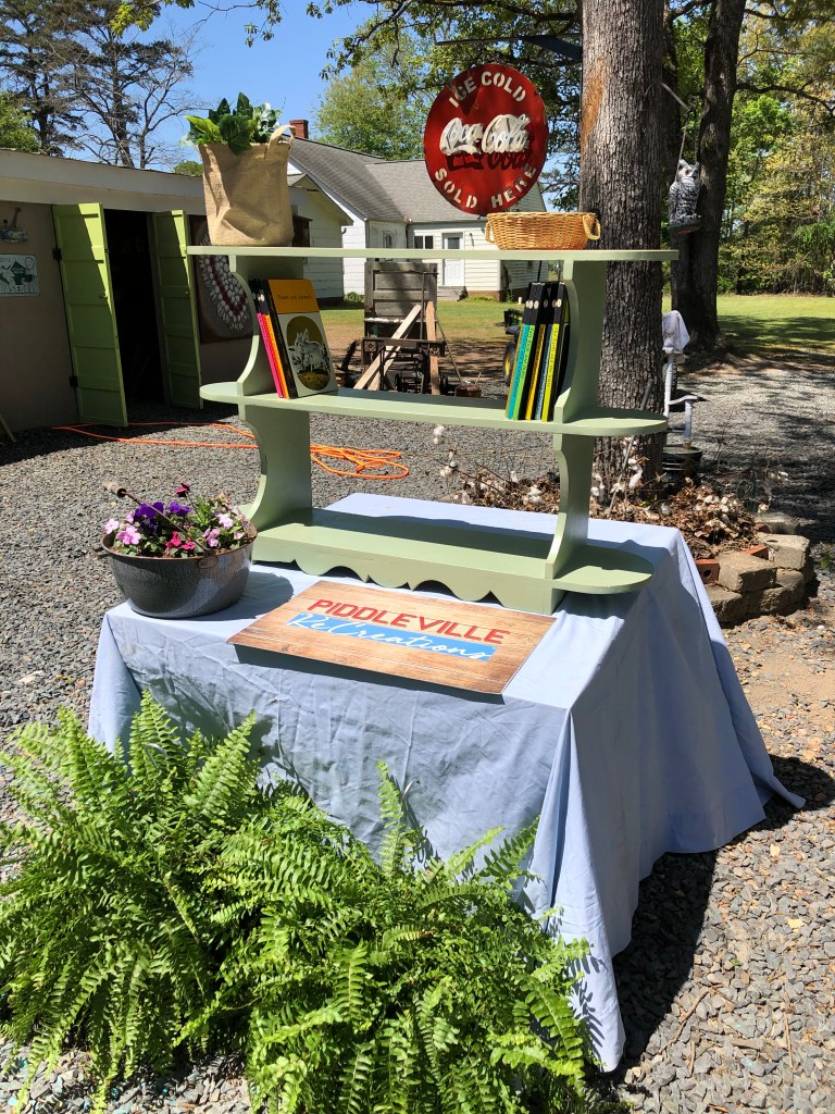 If you are looking for a small piece of history and you ever attended Mission Baptist Church, you might remember these three shelf bookcases that were located in every Sunday School classroom throughout the church. They held our Sunday School books, Bibles, and the offering baskets. Over the years they were discarded or damaged beyond repair. We rescued this one from the dumpster during the recent classroom upgrades at the church and added a light green distressed paint look. Three shelves provide a lot of shelf space for books, keepsakes, lamp, etc.