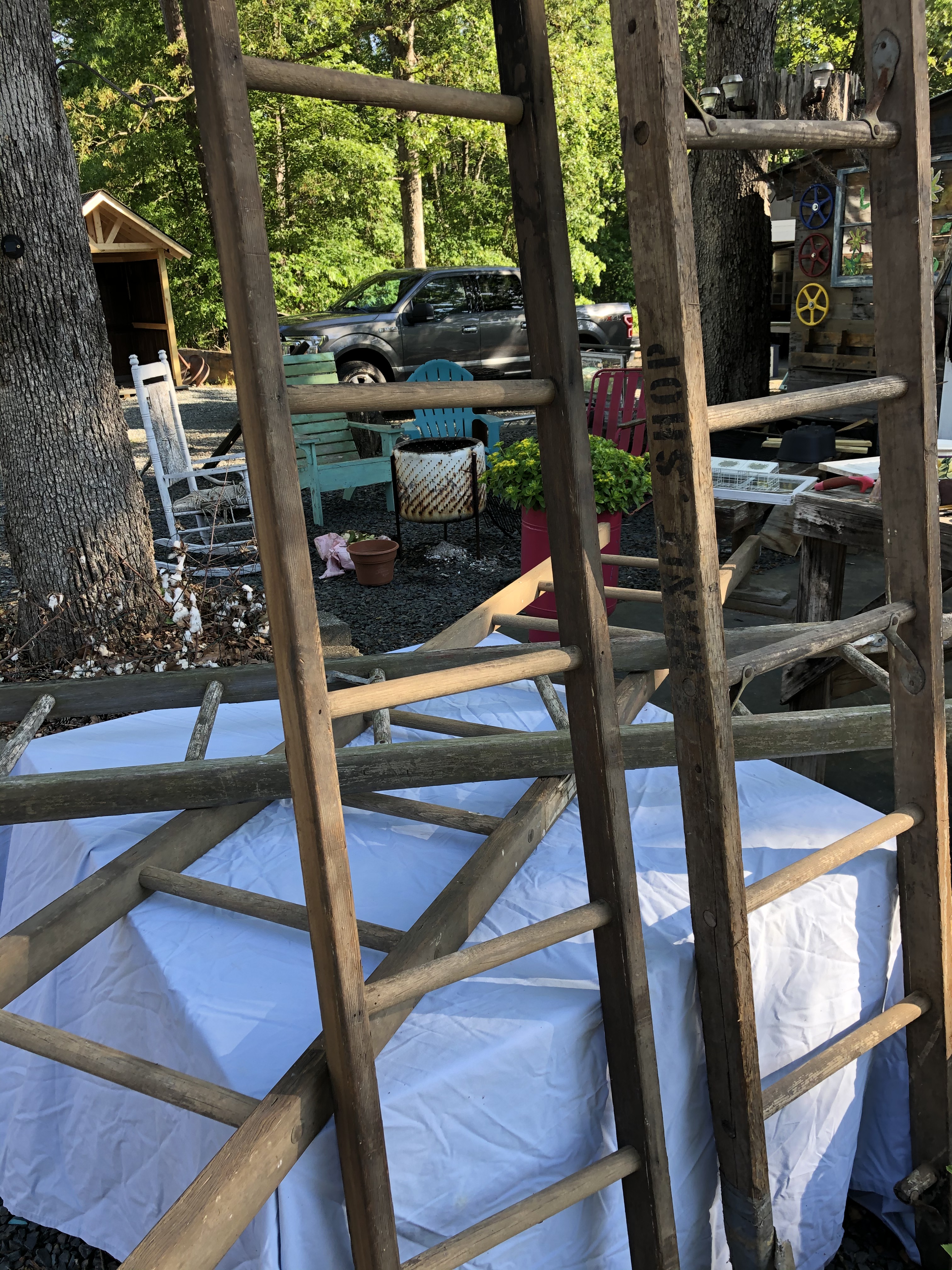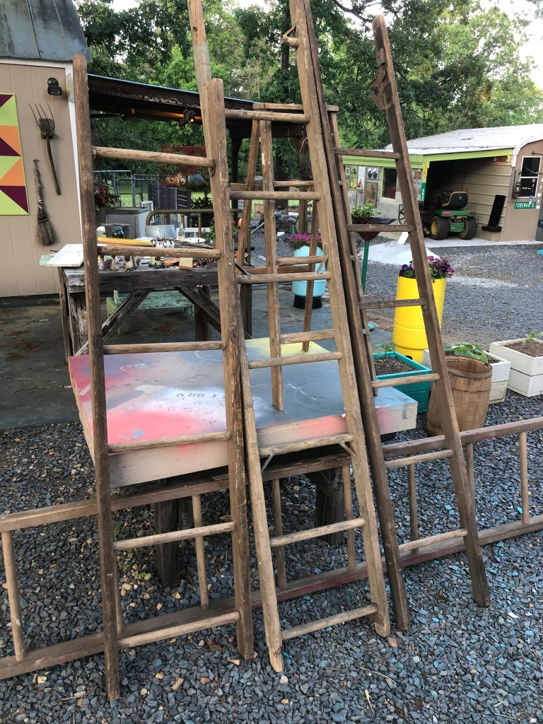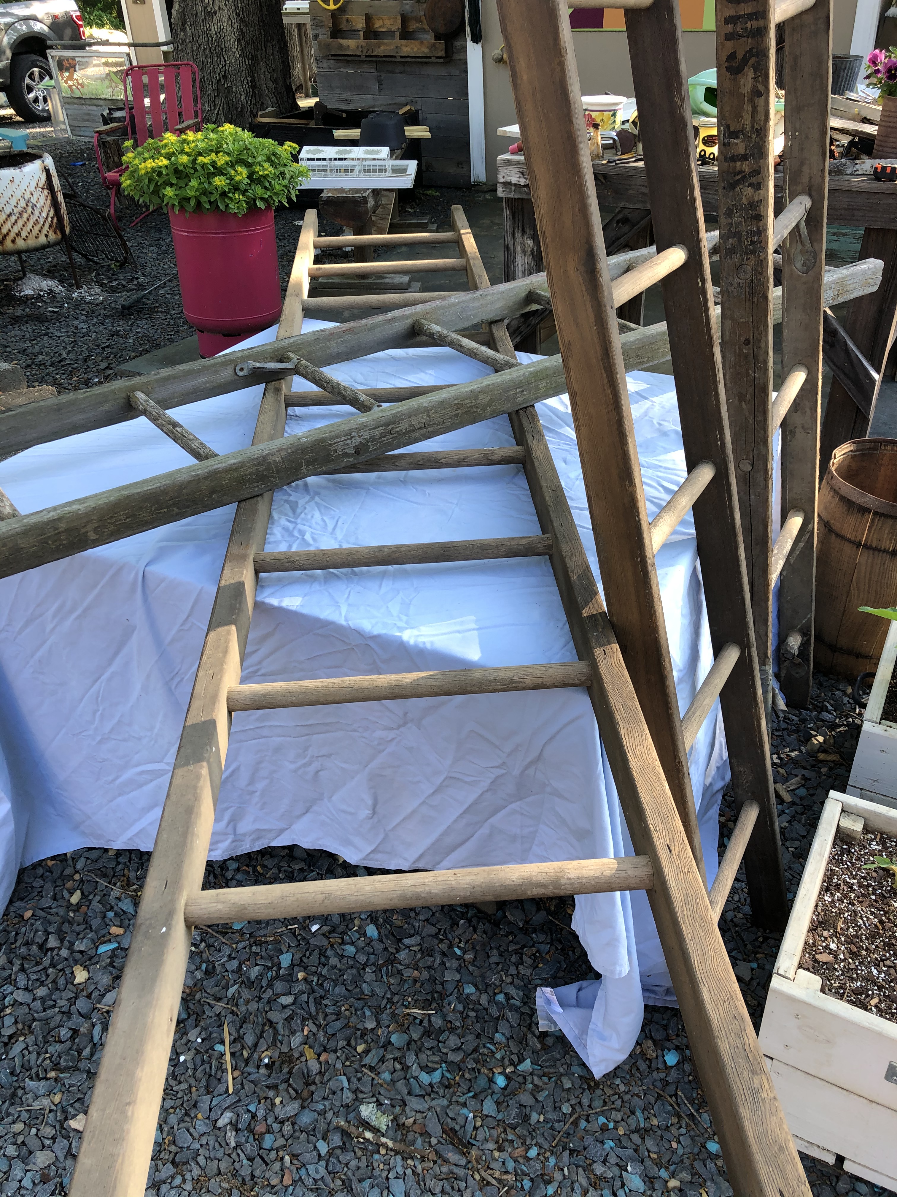 These wooden ladders were purchased at an auction over 30 years ago. They have been stored inside a barn out of the weather since that time. Ladders were used at the time of the auction so we have no idea of their age. They make great decorative items for weddings, social events, gardens, etc. There are various lengths and some could be cut to a desired length. There are more ladders than what you see pictured.