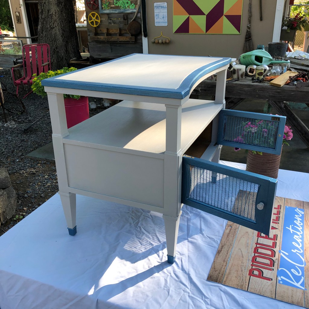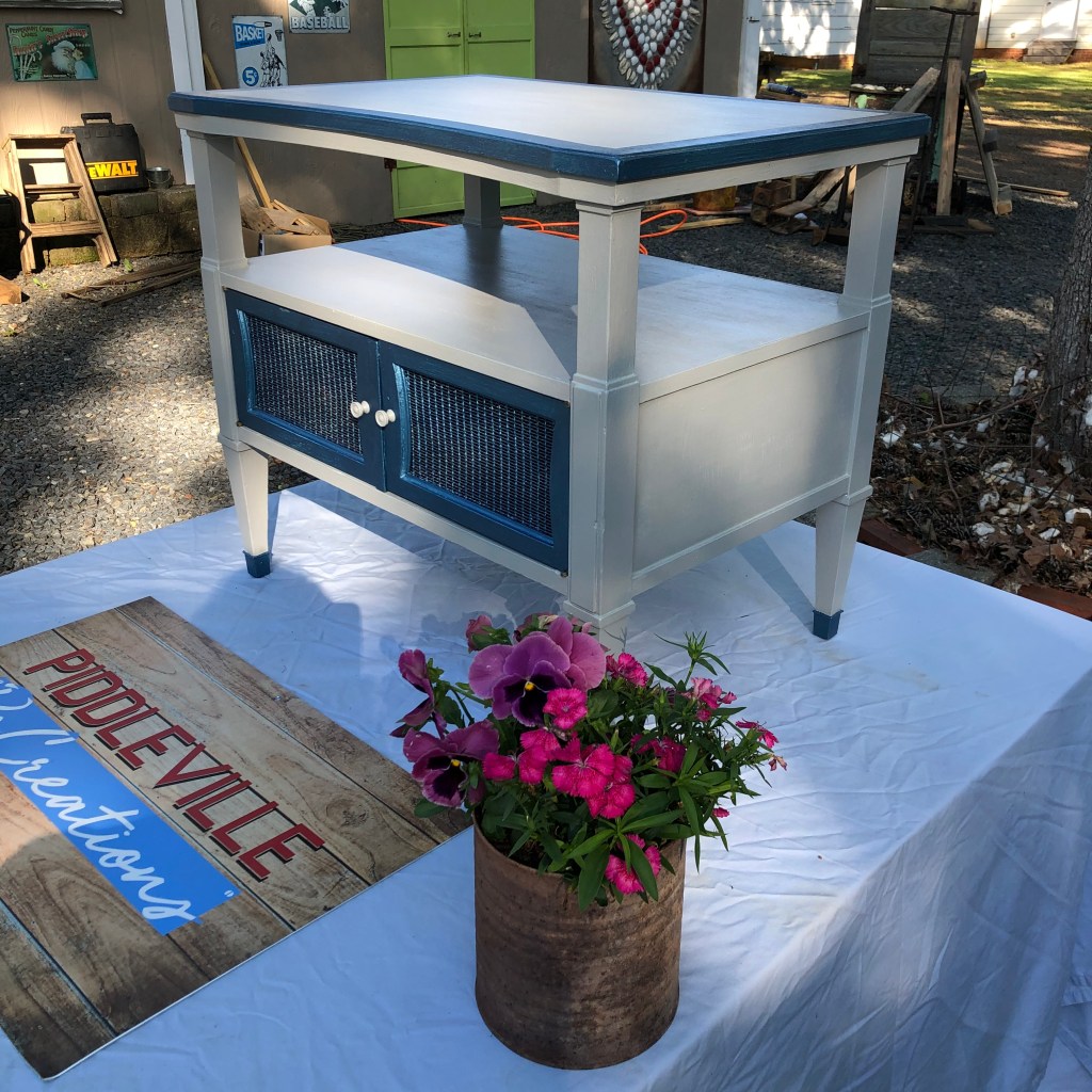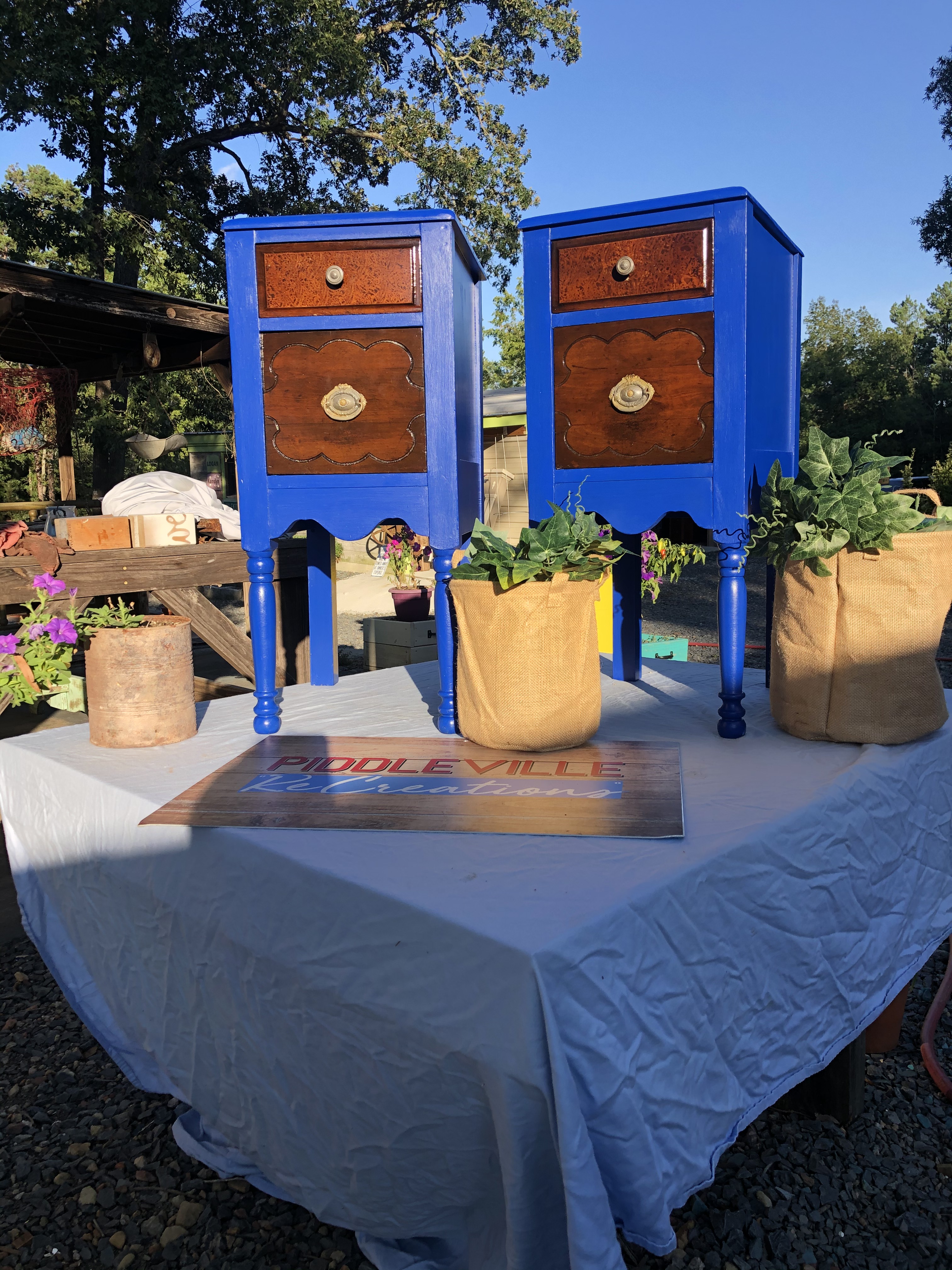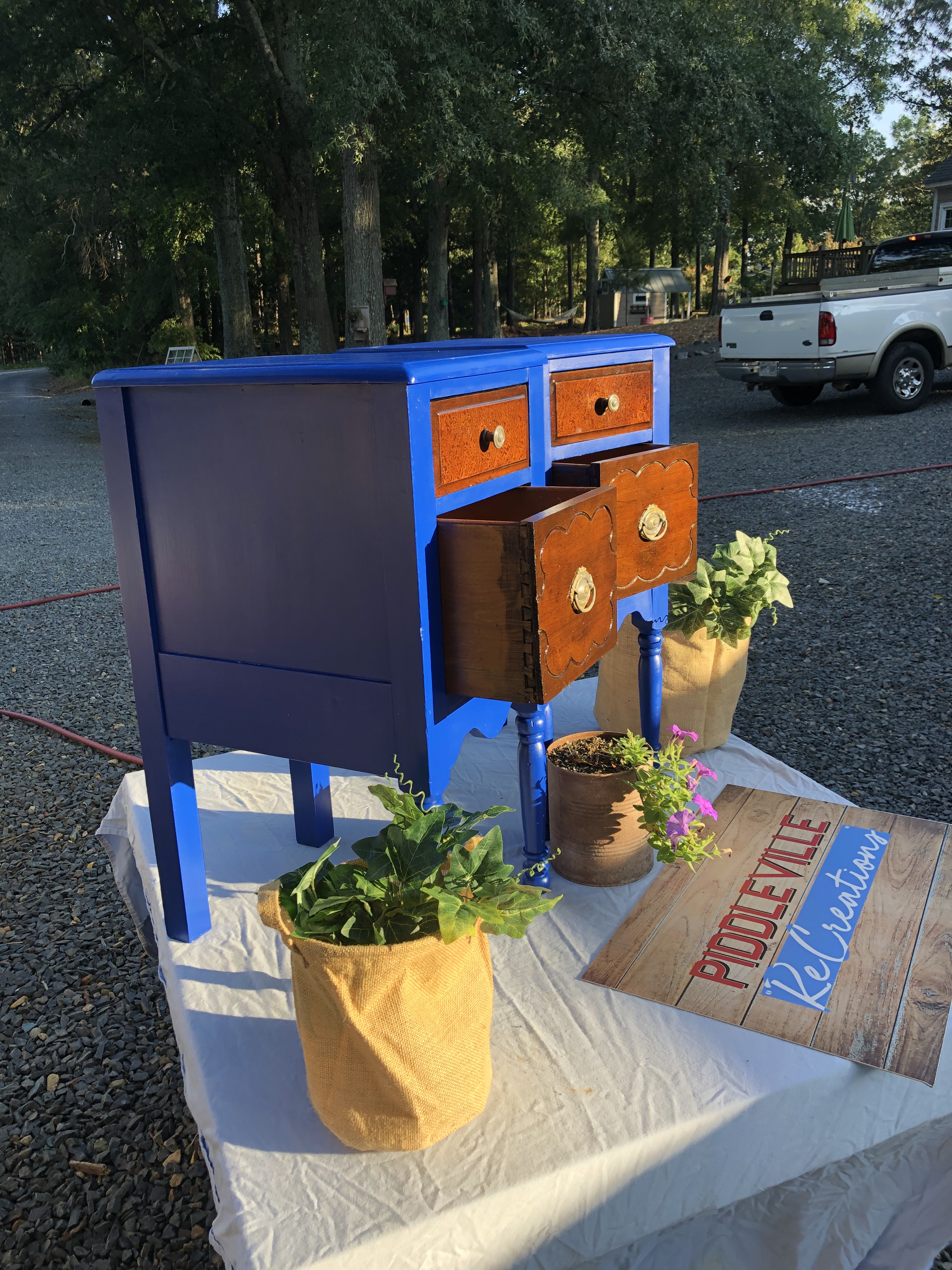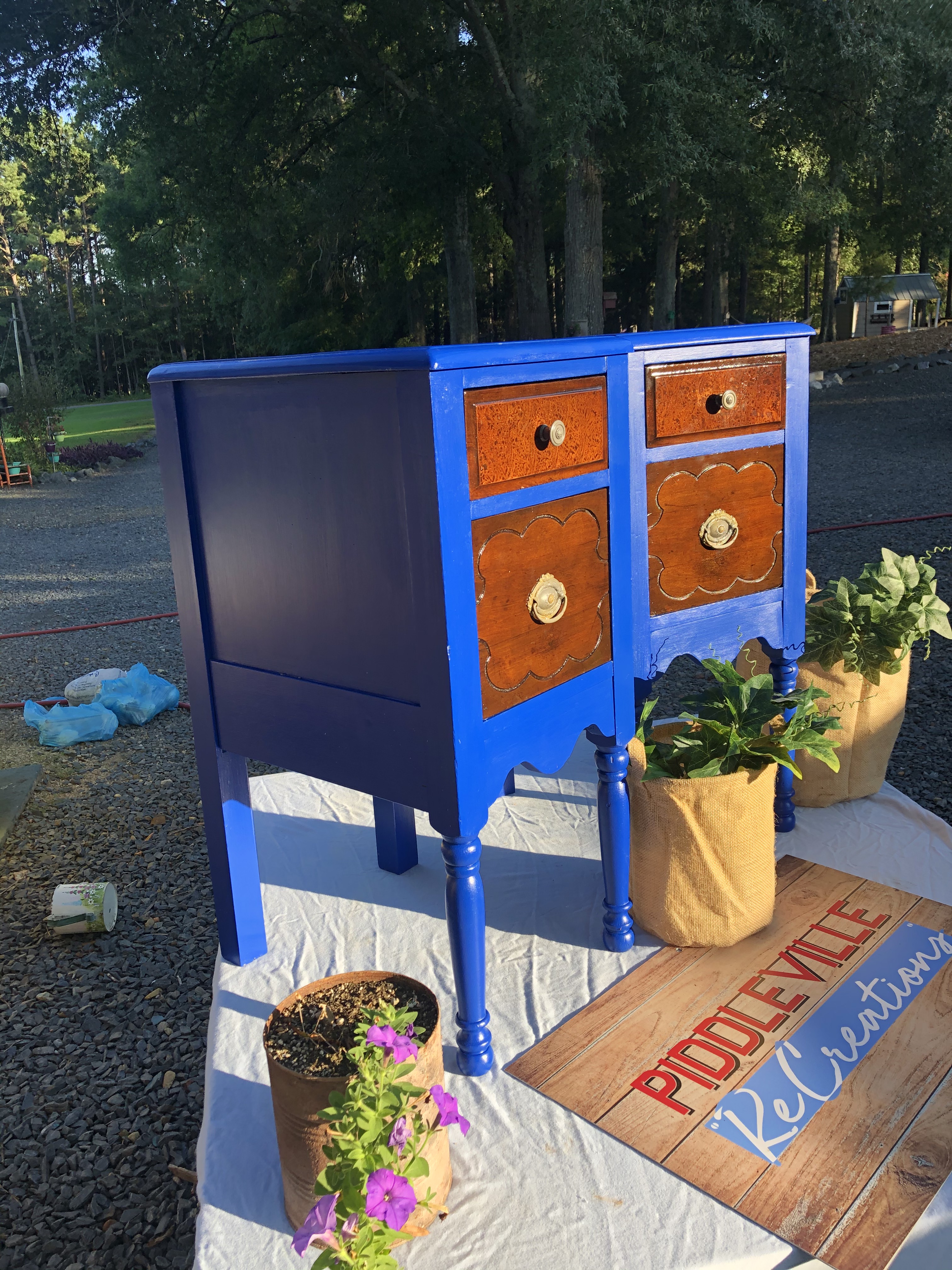 With blue being the color of the year for 2020, we decided to take an old dresser and saw out the center section thus leaving us two twin end tables. We reworked the tops and then painted the end table frames and tops cobalt blue. To help really accent the blue, we left the drawer facings their original natural color. To keep with the vintage look, we cleaned and reused the drawer pulls that originally came with the dresser. We completed the units by coating the entire units with satin poly. Tables are perfect for a lamp and storage in a wide variety of rooms within the house.