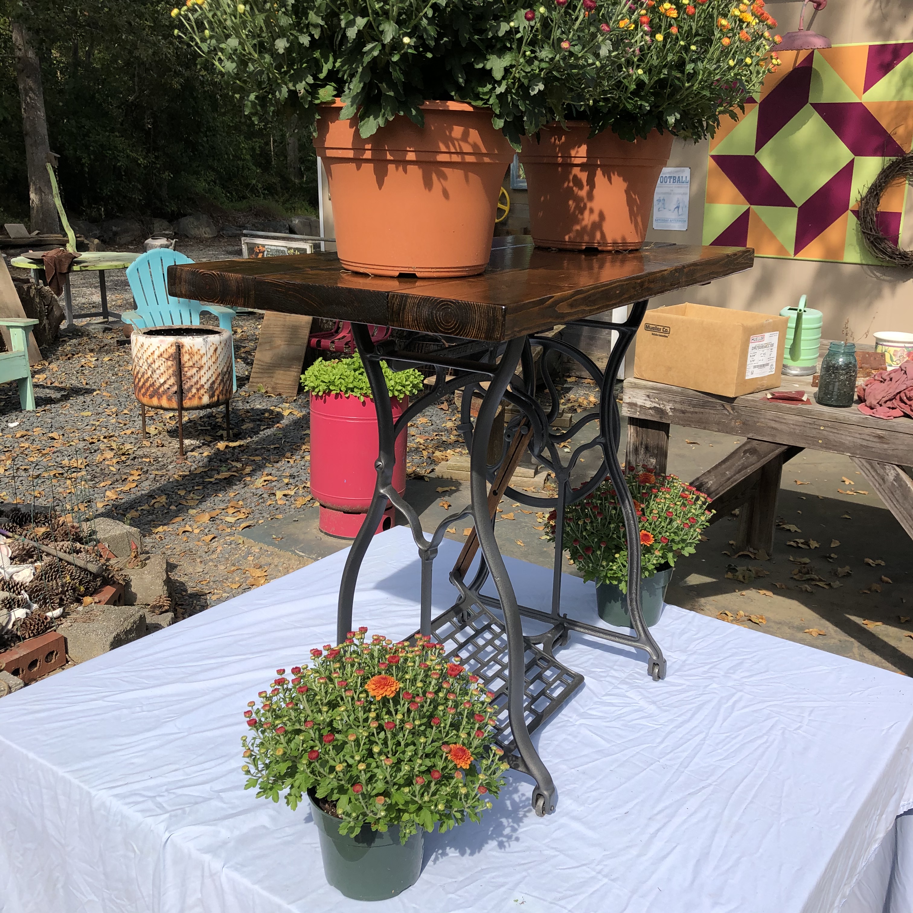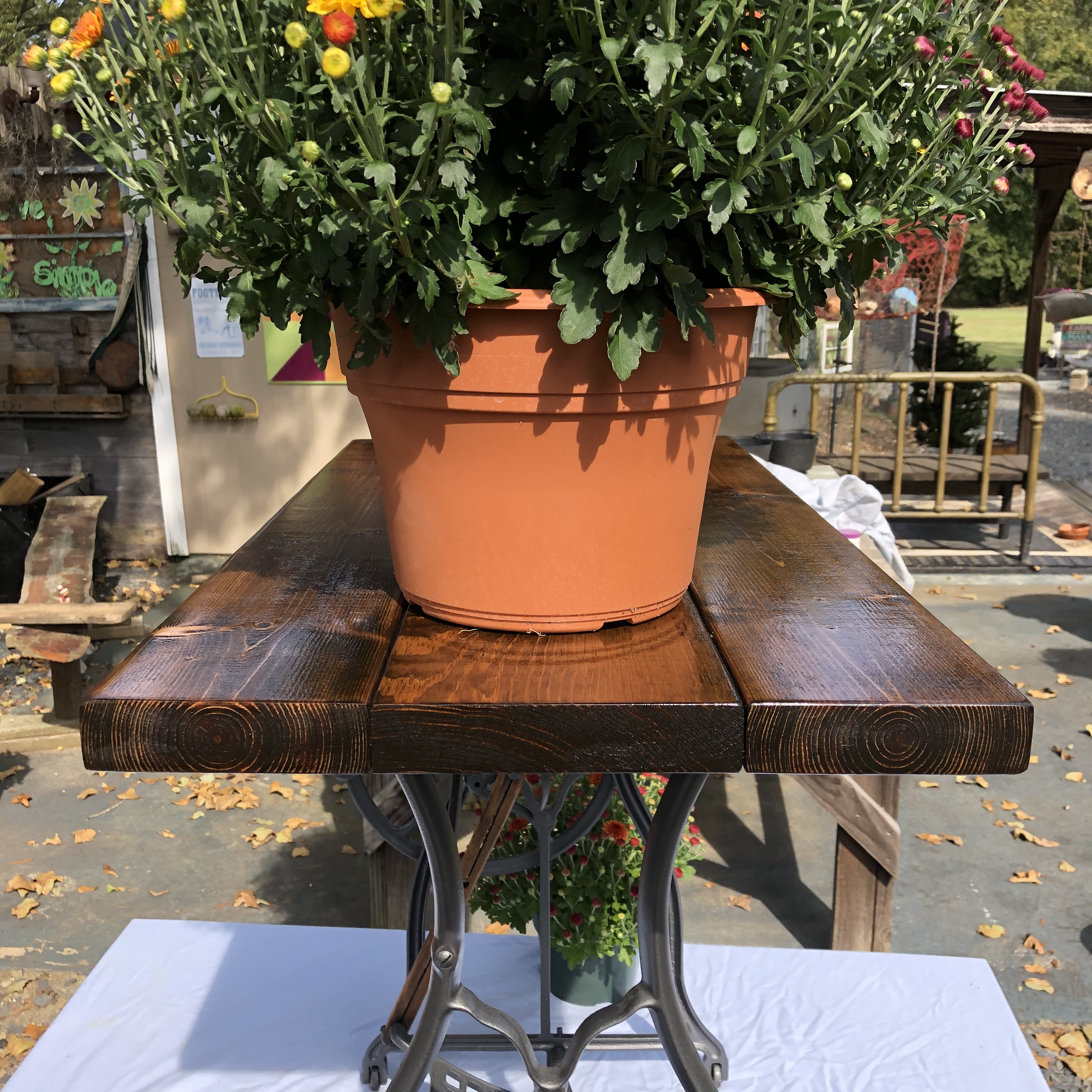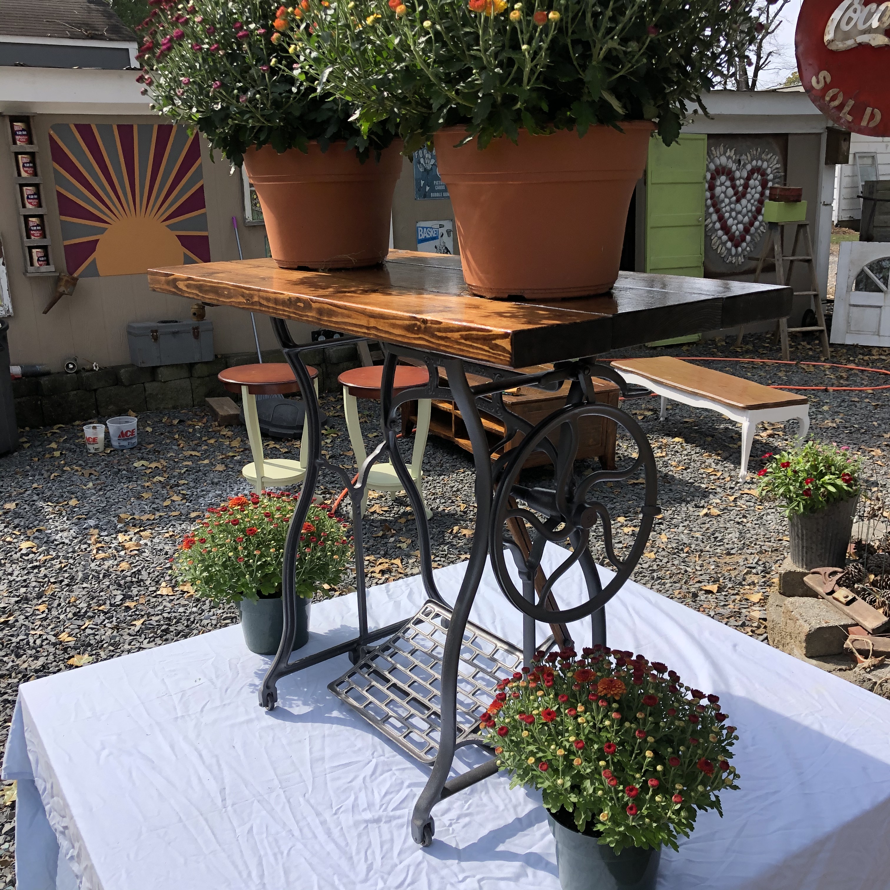 This unique display table combines an old Wheeler and Wilson cast iron sewing machine base and a new wooden top. Base was sandblasted and painted matte hammered black while the top was sealed with clear gloss polyurethane. The base still has the wooden pitman arm from the pedal to the flywheel. Perfect for displaying your keepsakes throughout the house.