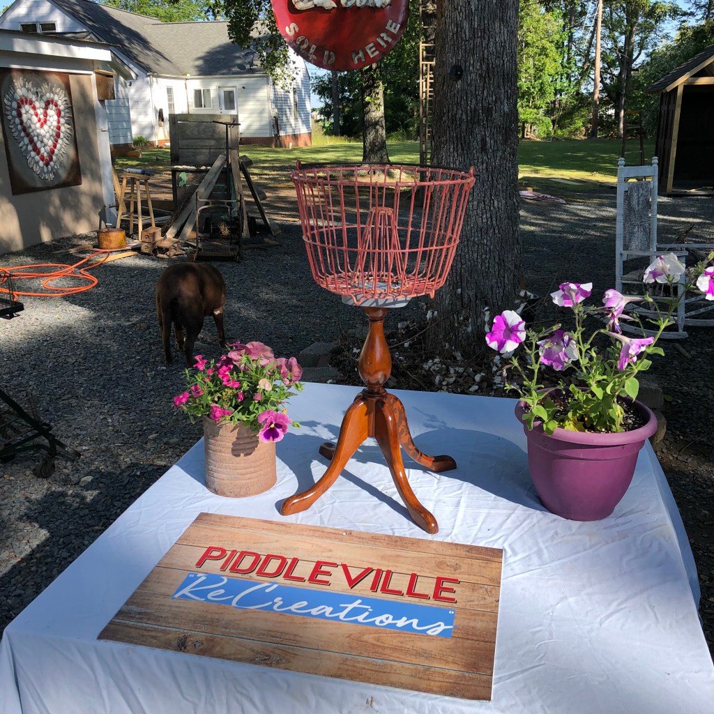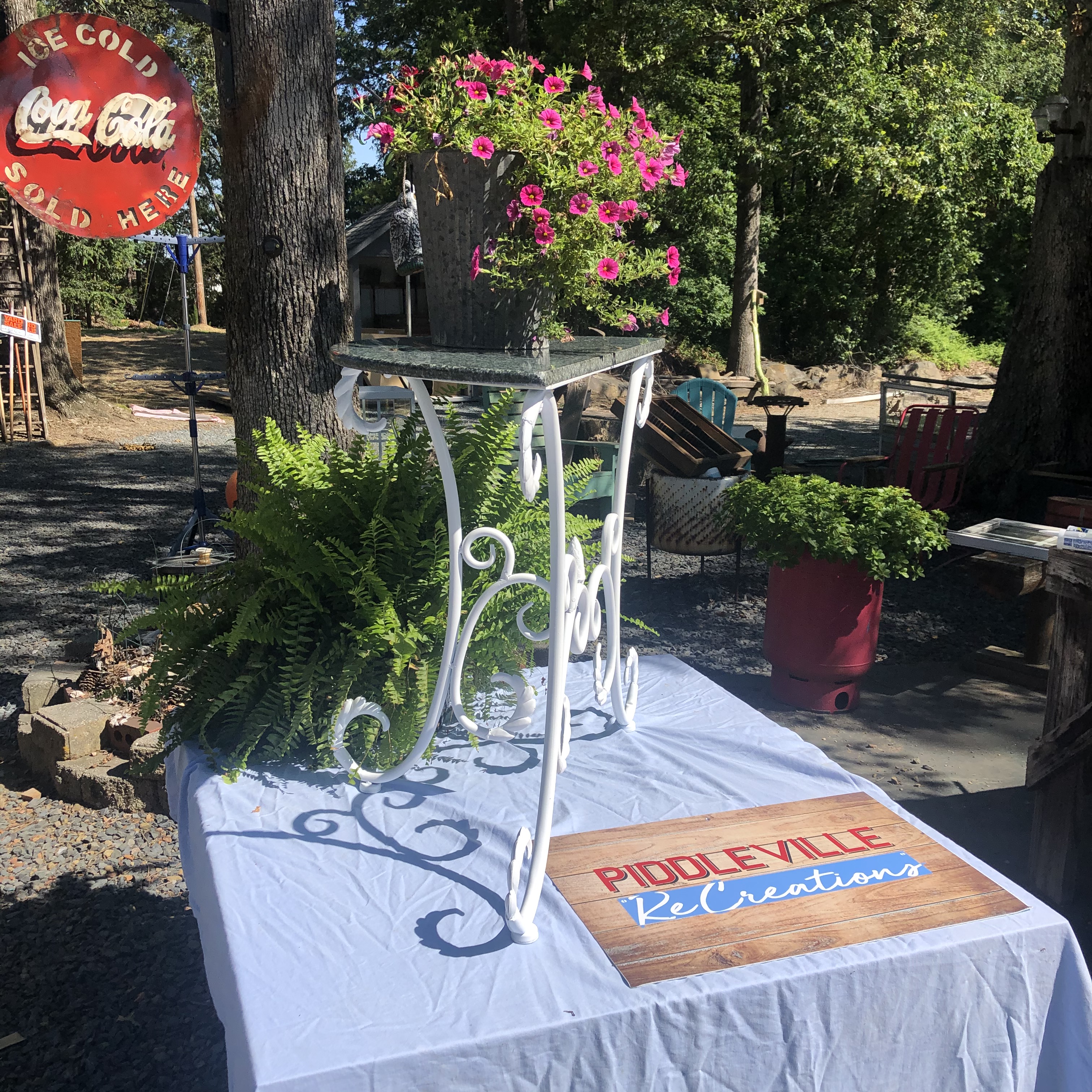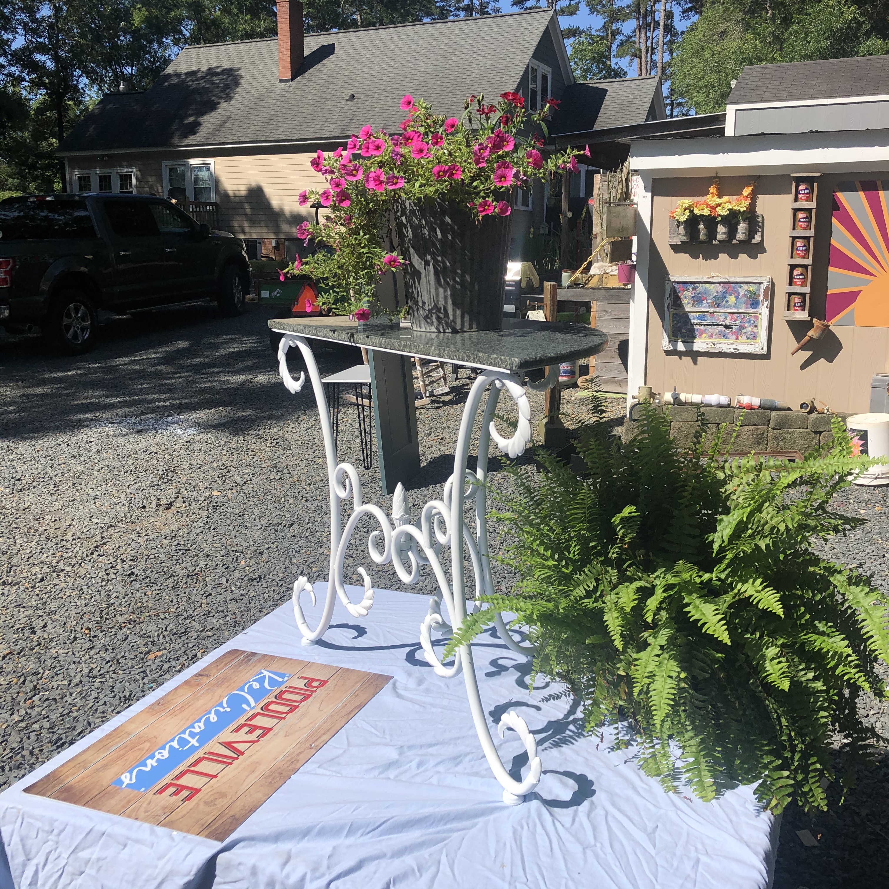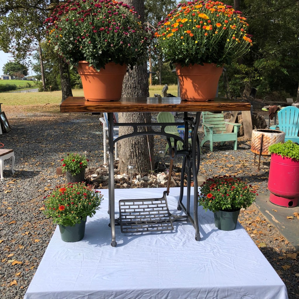 This unique display table combines an old Wheeler and Wilson cast iron sewing machine base and a new wooden top. Base was sandblasted and painted matte hammered black while the top was sealed with clear gloss polyurethane. The base still has the wooden pitman arm from the pedal to the flywheel. Perfect for displaying your keepsakes throughout the house.