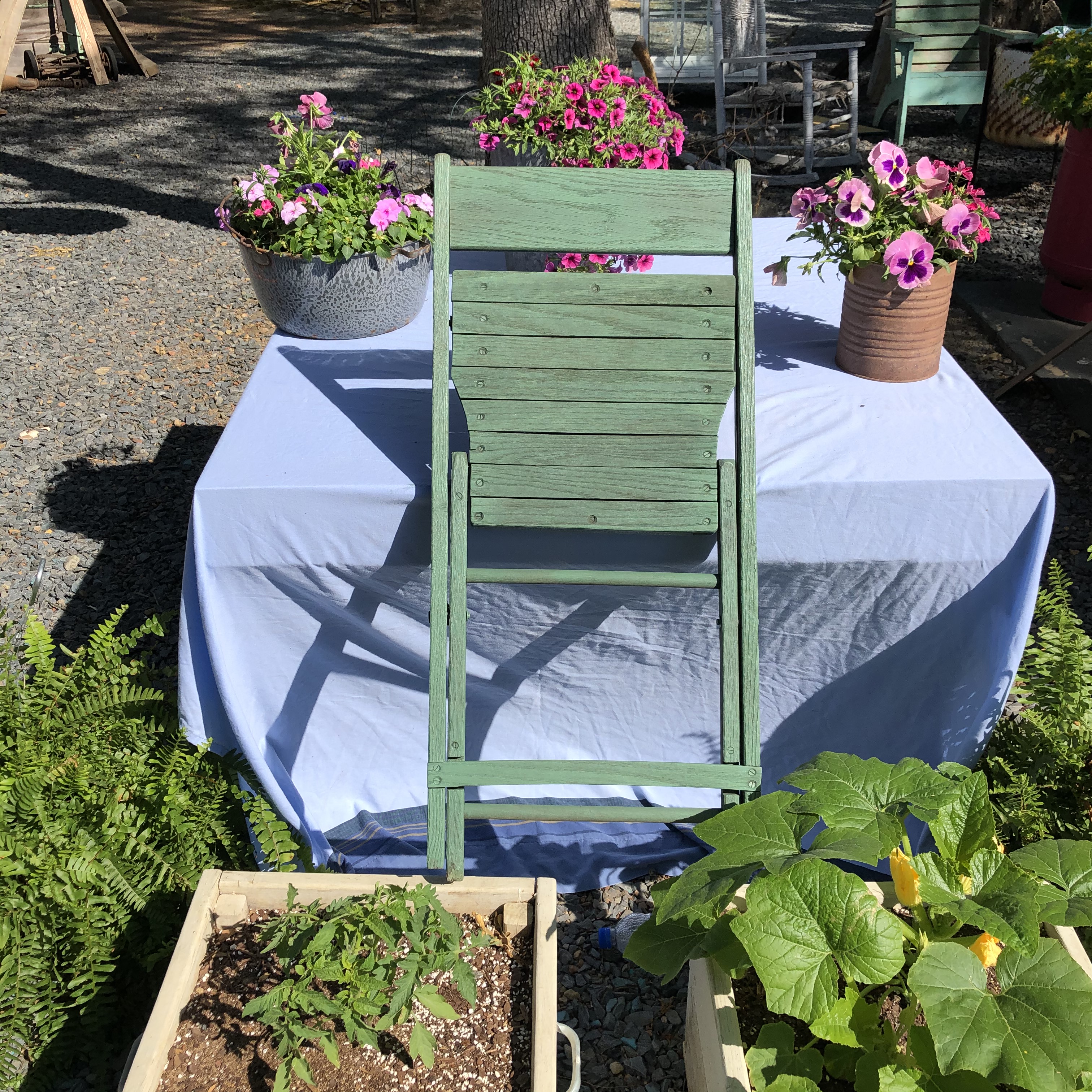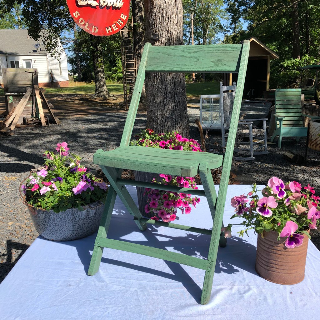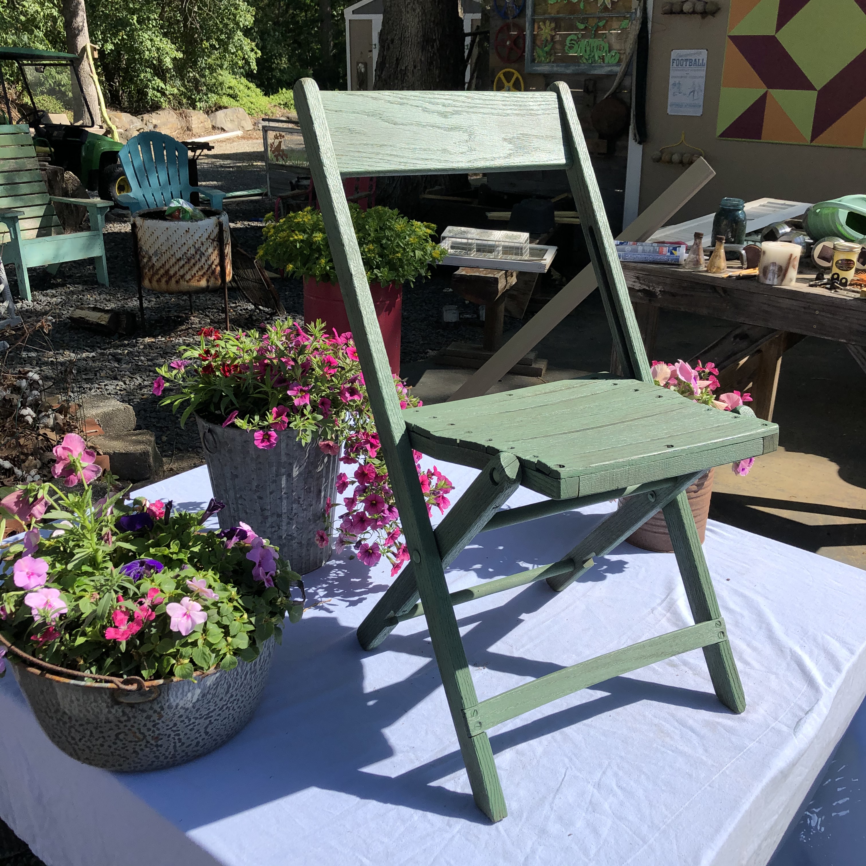 Before we all became accustomed to our small aluminum ballpark chairs, this vintage wooden folding chair would have been seen at the ballpark, picnics, or family gatherings. Chair is in remarkably good condition and still folds up as intended. We have added a light green chalk pain for accent of years gone by.