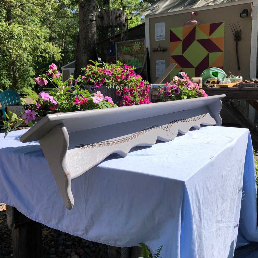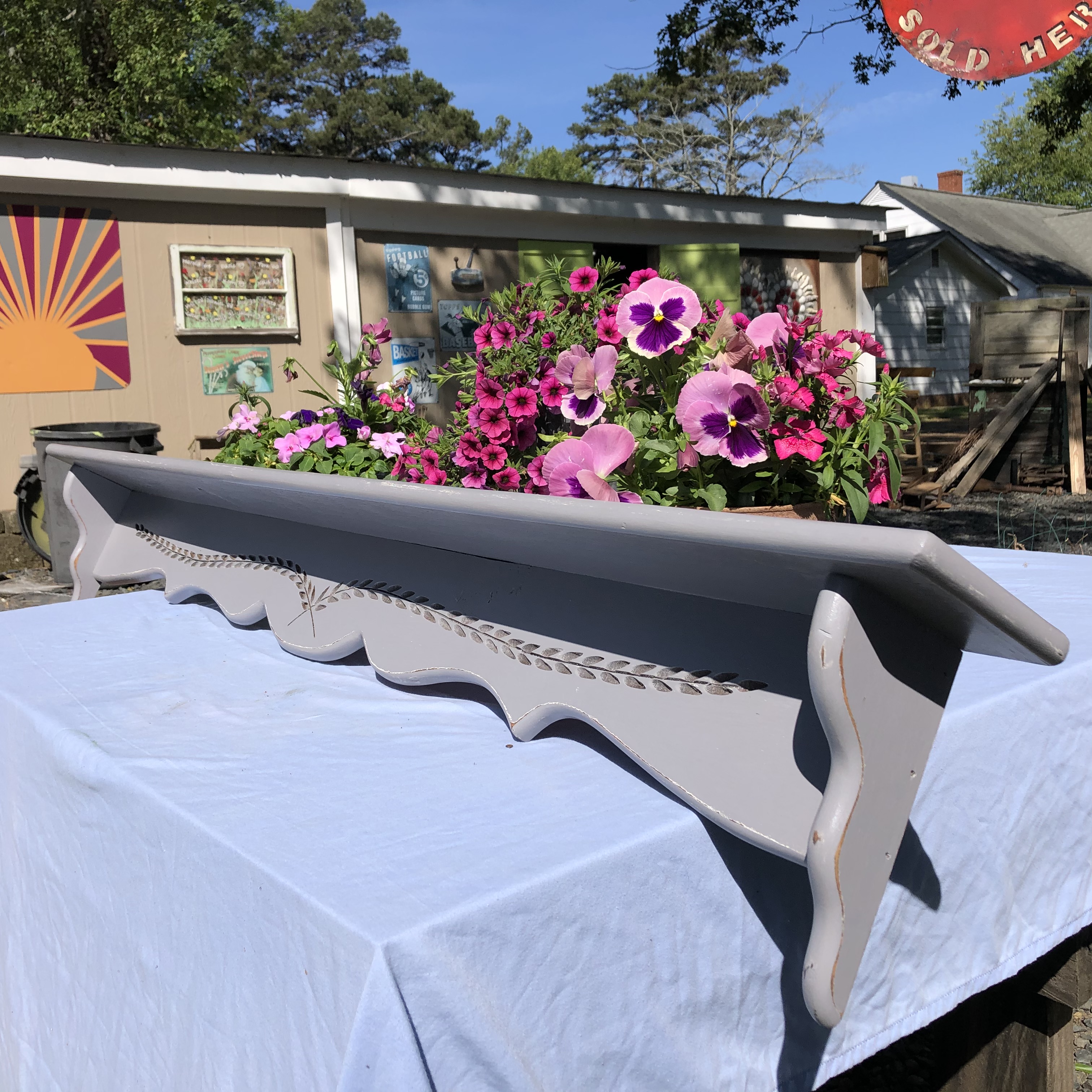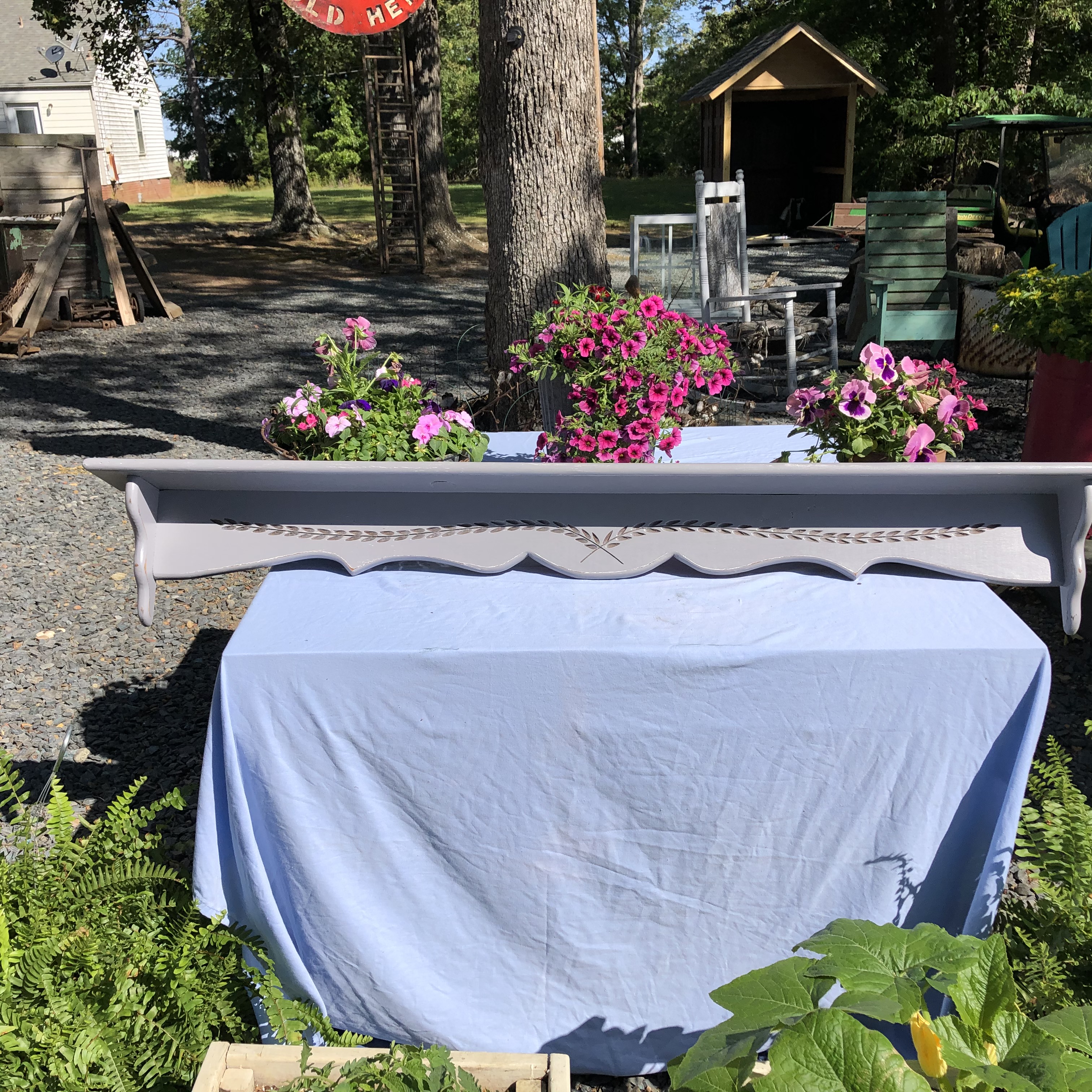 An original Habersham Furniture Company piece, this long shelf would fill any vacant wall space you might have. Shelf has been slotted along the top to display dishes allowing them to stand upright without risk of falling. The original Habersham wheat design is cut along the entire front of the shelf. Originally stained a walnut color, we have painted the shelf a beautiful gray and distressed it back.