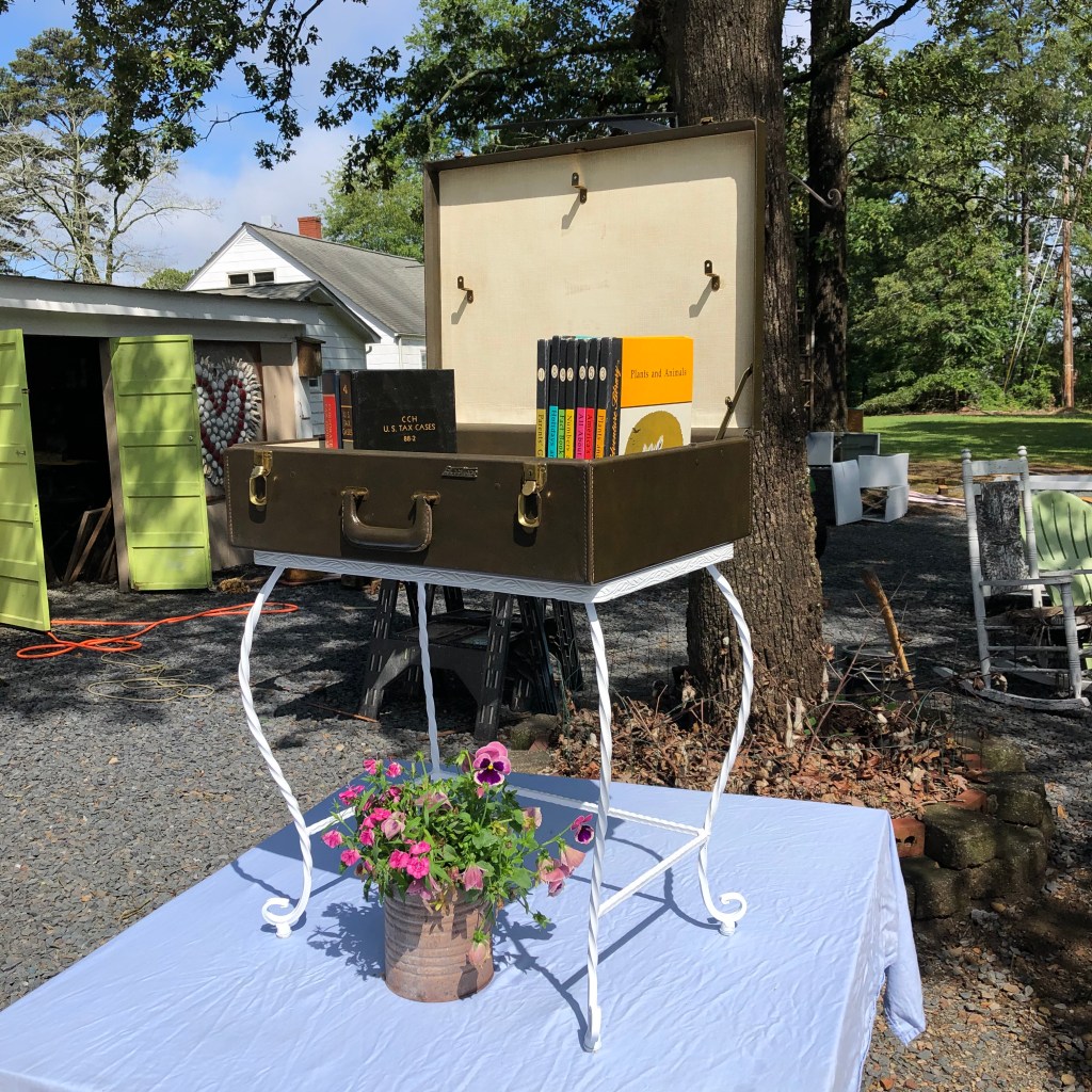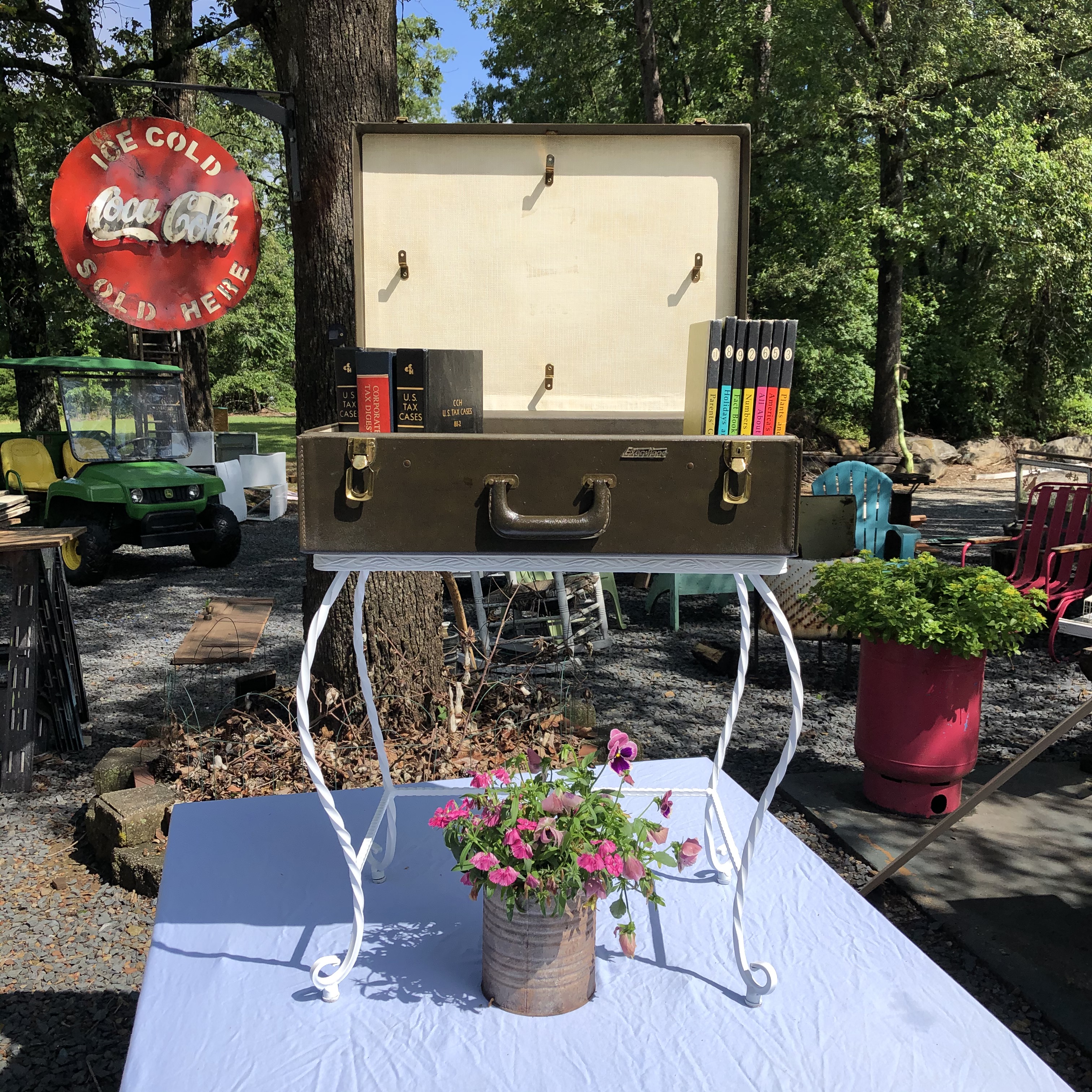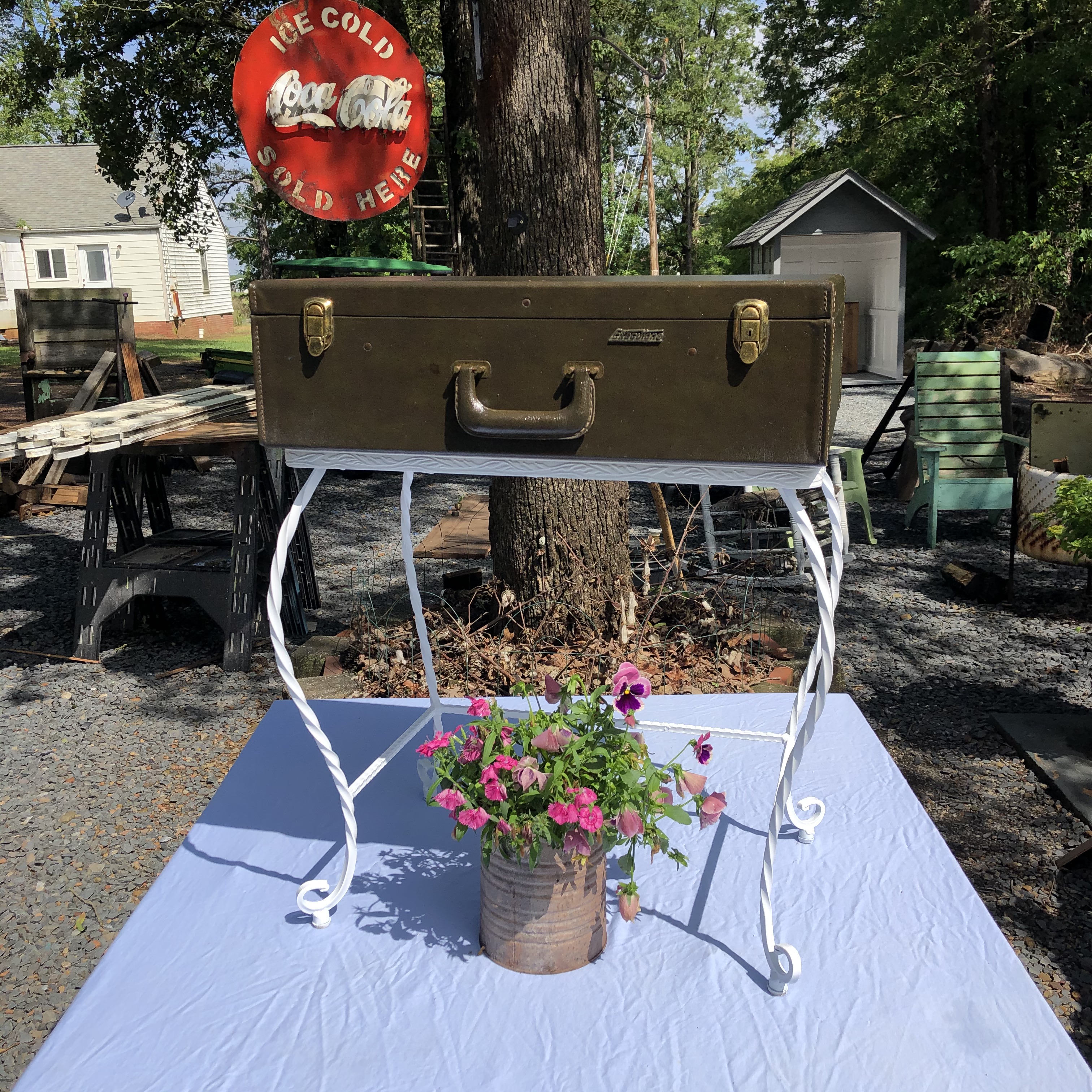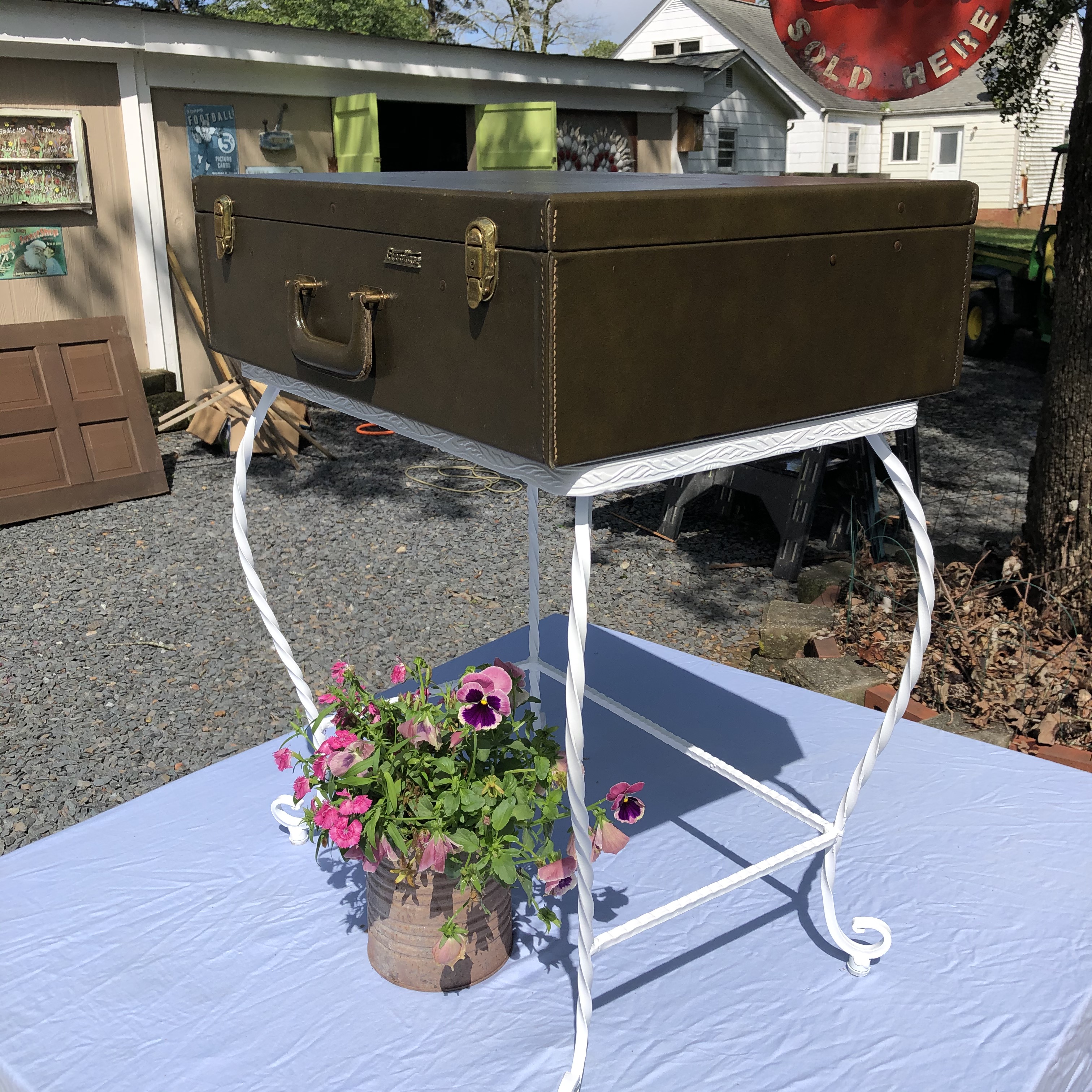 For those who are looking for something unique to provide display and storage in the house, we have married an old hardback Executone Suitcase to a metal plant stand base to provide a real conversation piece for your home. Metal base was painted white while the suitcase was left in the original color. Suitcase can be left open for books, a lamp, or any items you would like to display. Suitcase may be closed if needed for storage only. The original brass closures and hinges complete the unit.