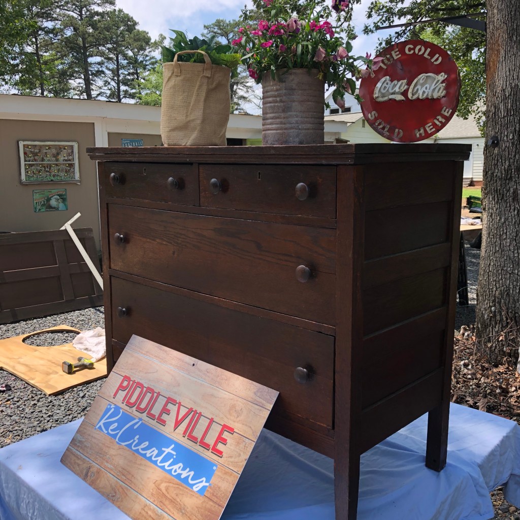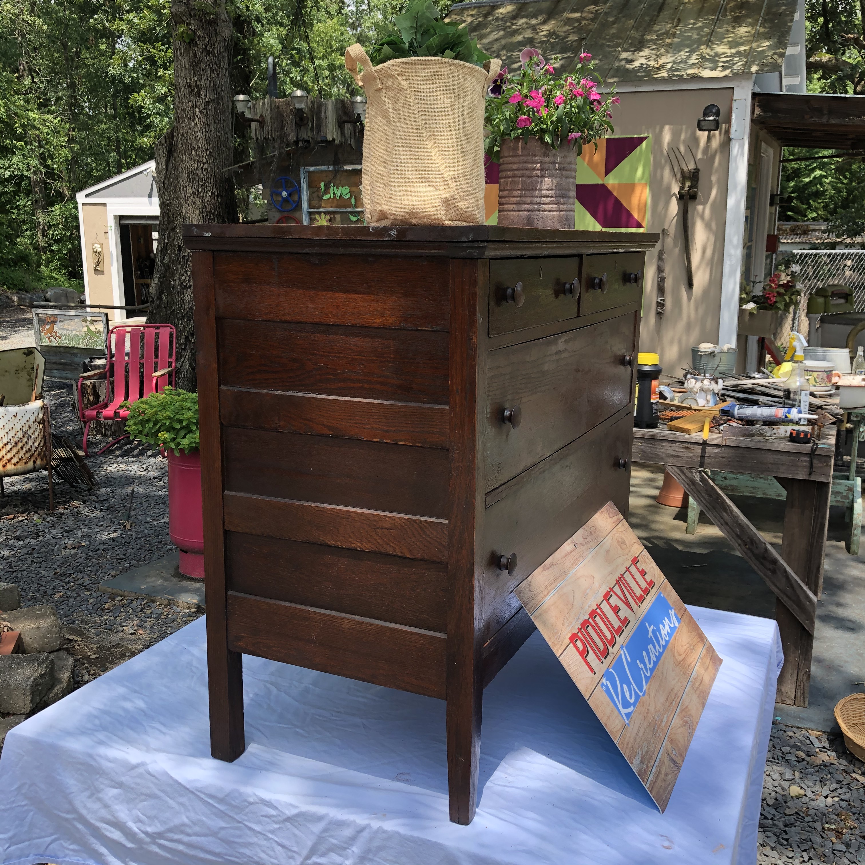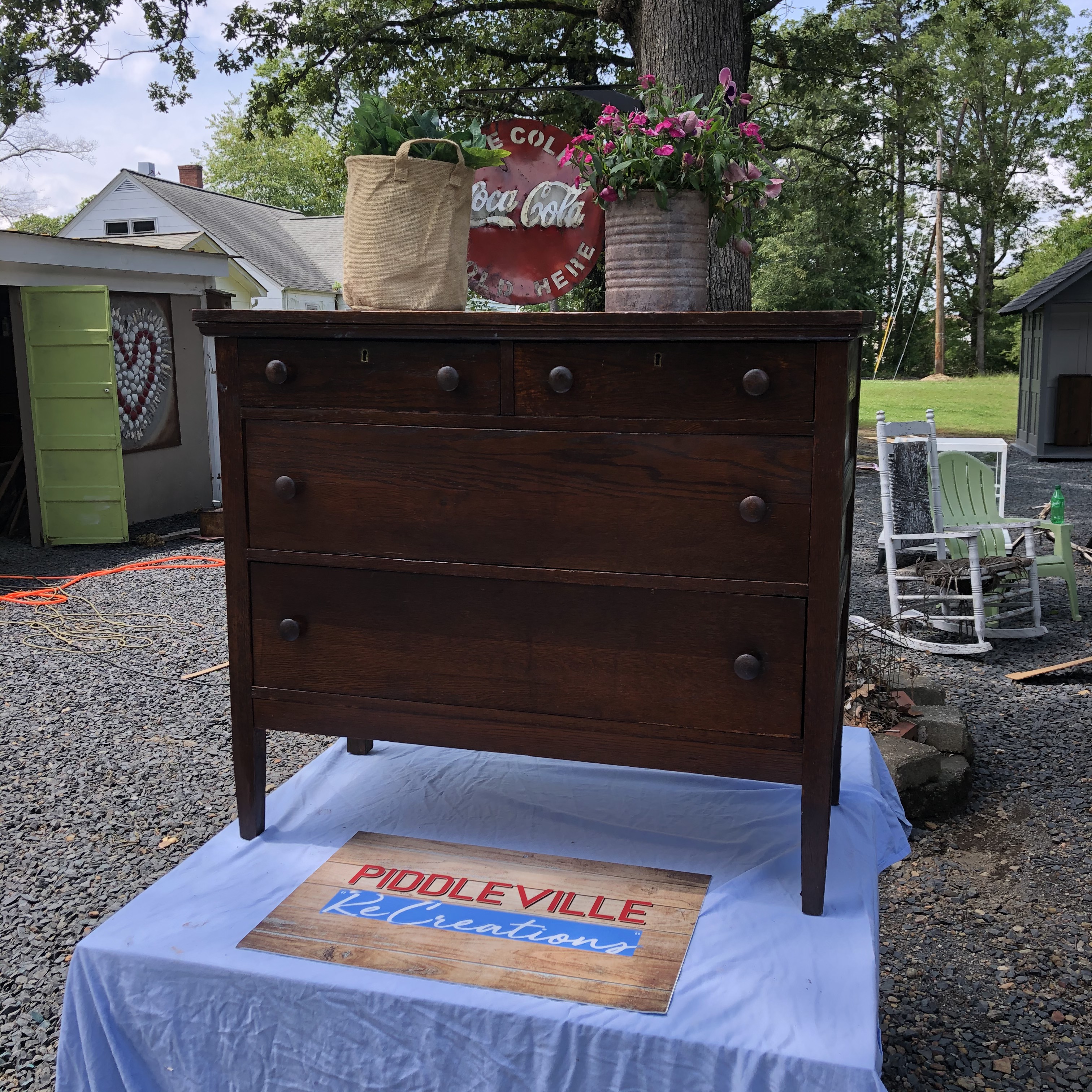Old vintage wooden dresser is a perfect size to be used as a display piece in an office, hallway, living room, or foyer. Dresser has two small drawers and two larger drawers for storage as needed. We have not refinished dresser other than cleaning and applying lemon oil to retain the original stain color.