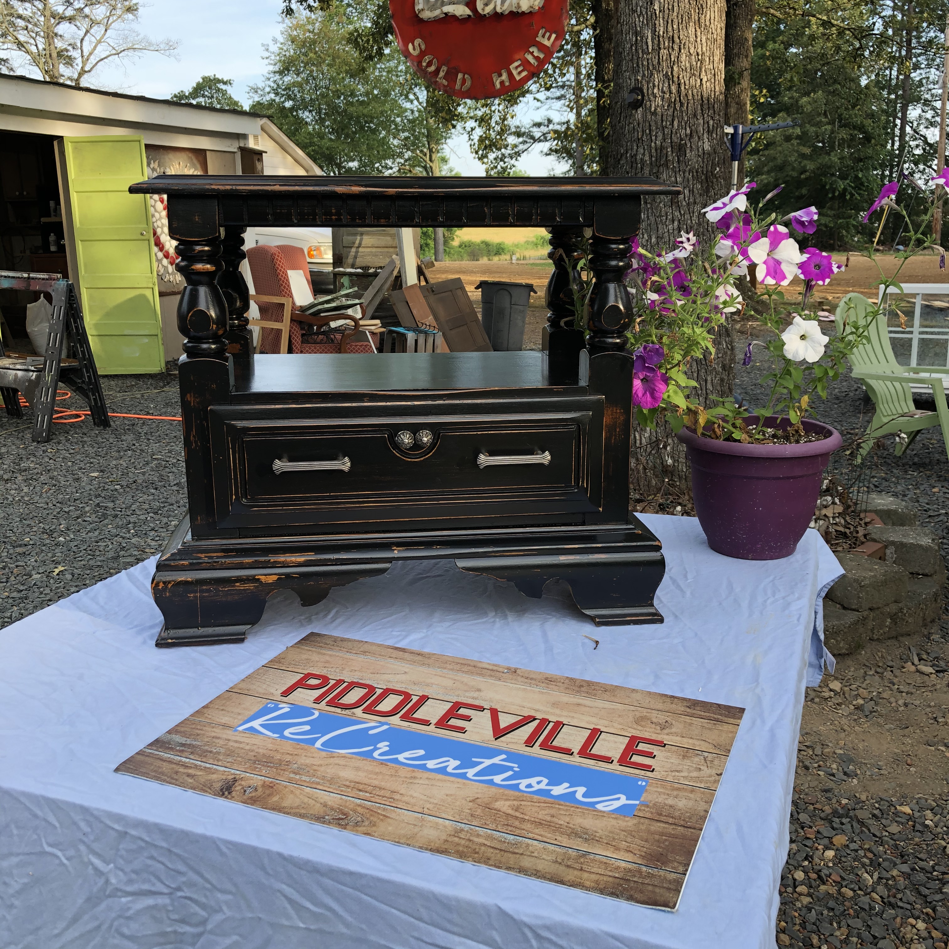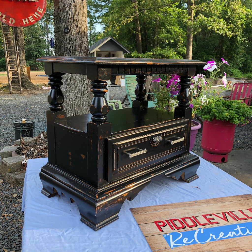 This end table relays the look of strength with its sturdy crafted columns and wide base. We have distressed the black pain back to wood in areas and added a deep satin polyacrylic finish to complete the look. End table does have a single drawer under the open area that is complimented with silver pulls and silver woven wire knobs. Height of this unit is very suitable for a large table lamp. Perfect addition to any office or home space.
