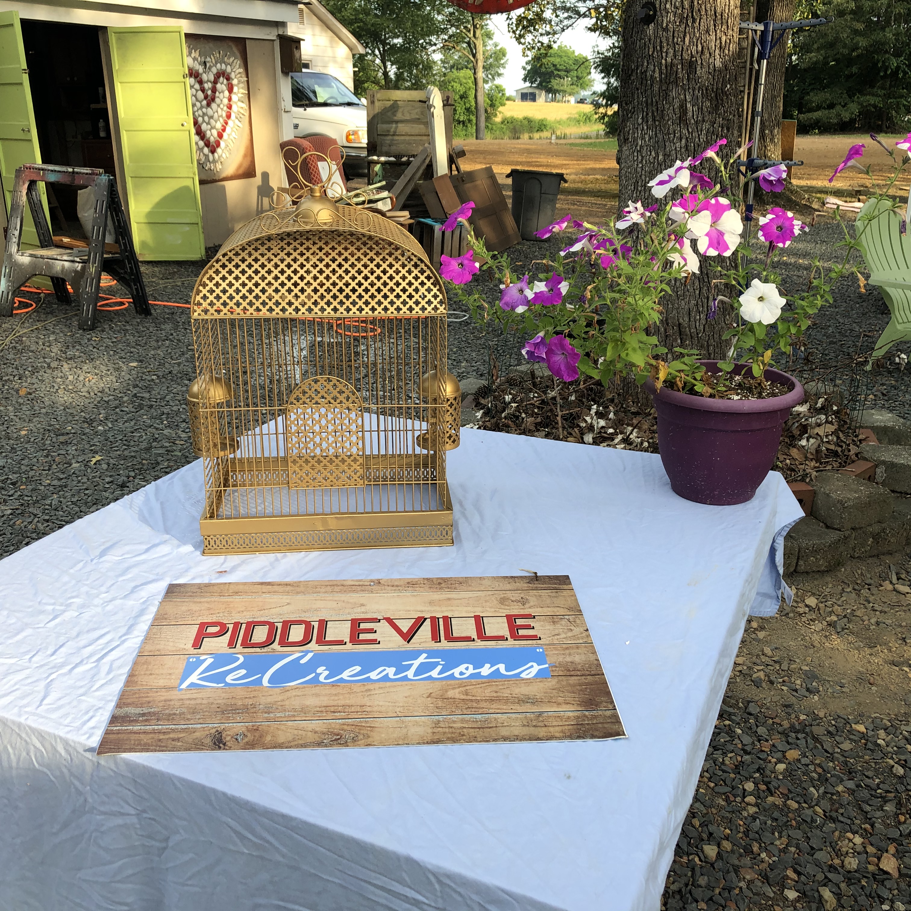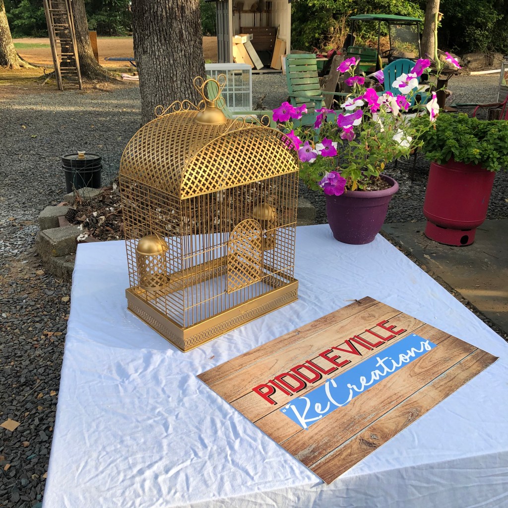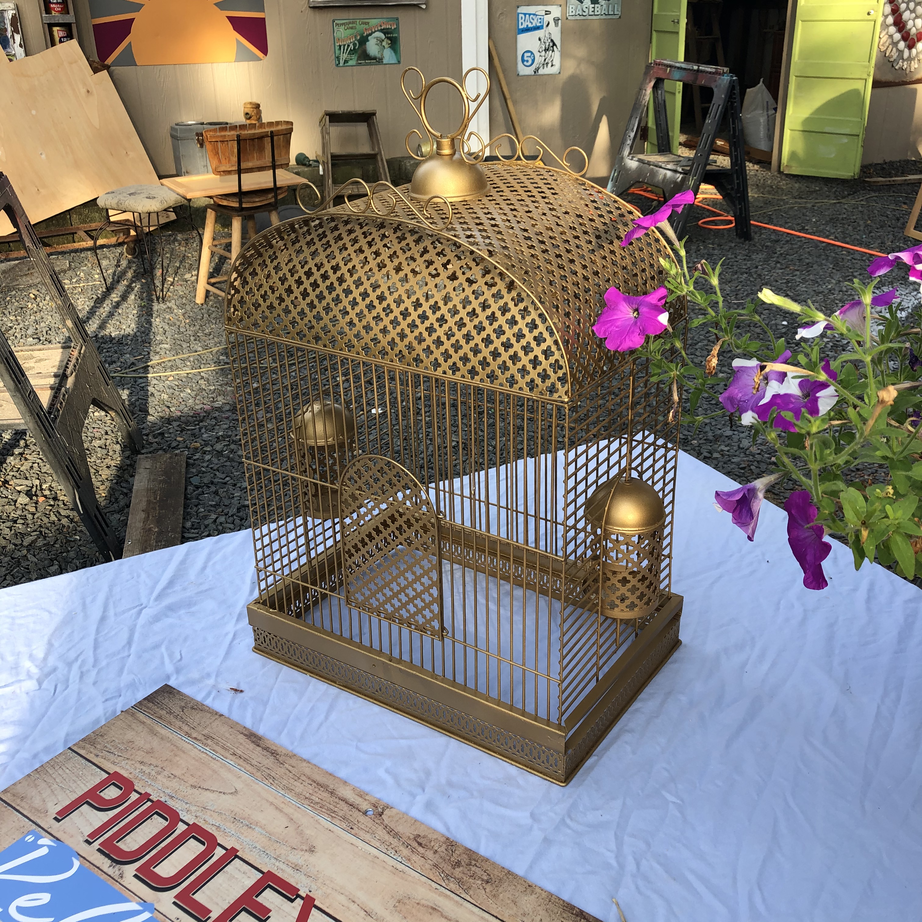 Large vintage bird cage that can be used as a beautiful display piece in an office or home setting. The vintage matte gold color highlights the intricate design of the piece itself. Other than the paint the unit is in its original form. Similar items are extremely popular as a stunning display piece.