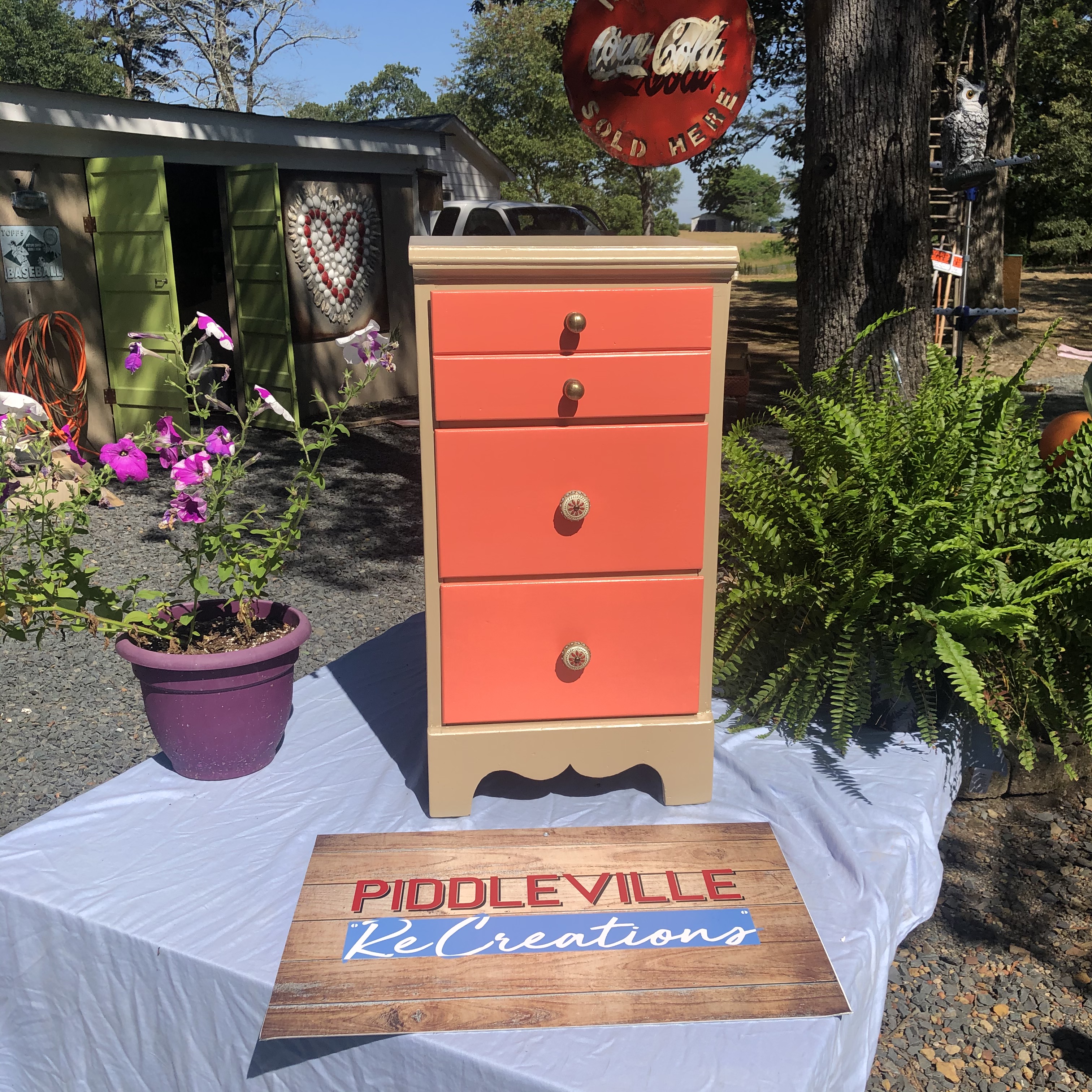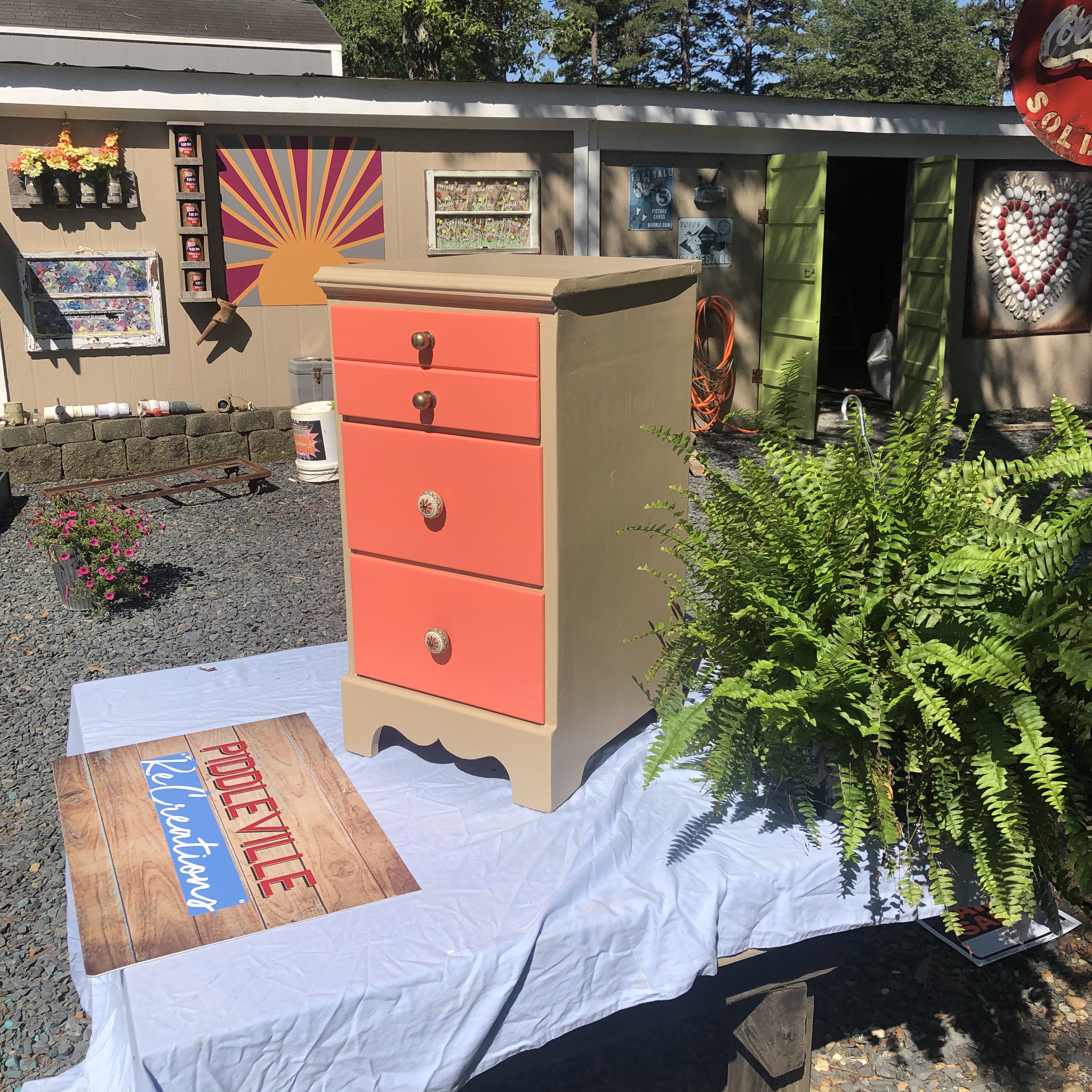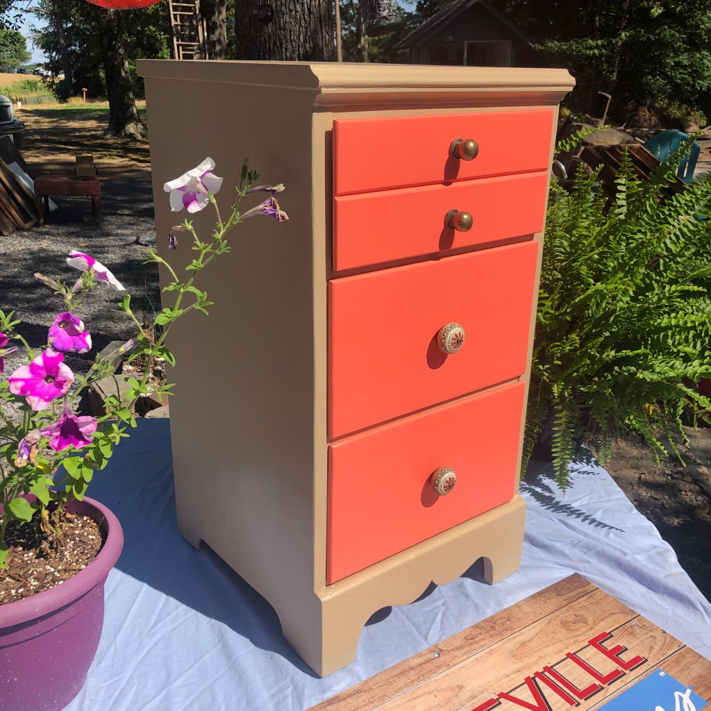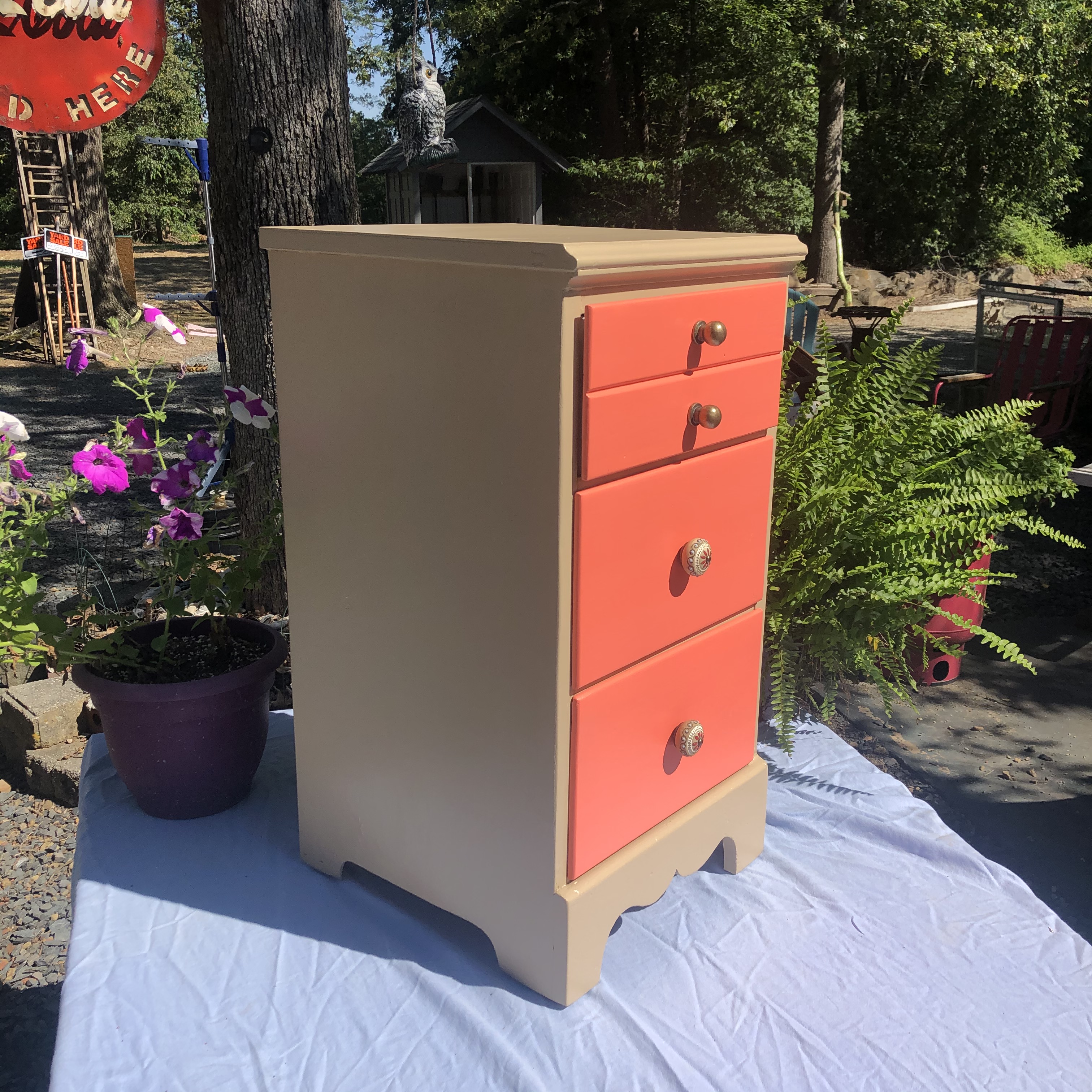 This small storage cabinet can serve a variety of needs within any room inside the house. It is a perfect size for those areas where you might need just a little more drawer space without having to take up a larger area in the room. We constructed this cabinet by cutting off the end of an old desk, reworking the top and sides, and then finishing it off with Burlap shade chalk paint while painting the drawer facings Flamingo. Appropriate pulls were added to accentuate the paint colors. Cabinet could serve as a bedroom nightstand, in a bathroom, or a child’s room to store an assortment of items.