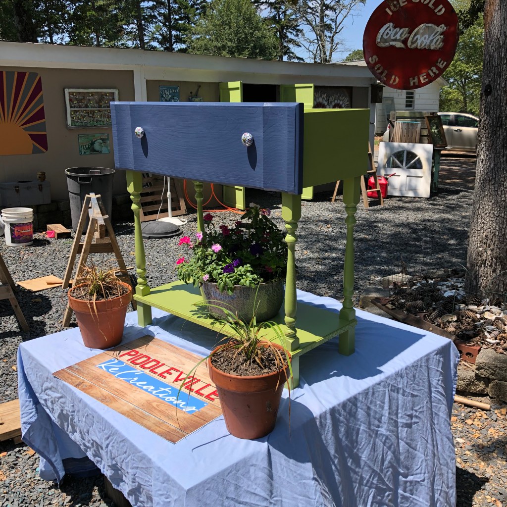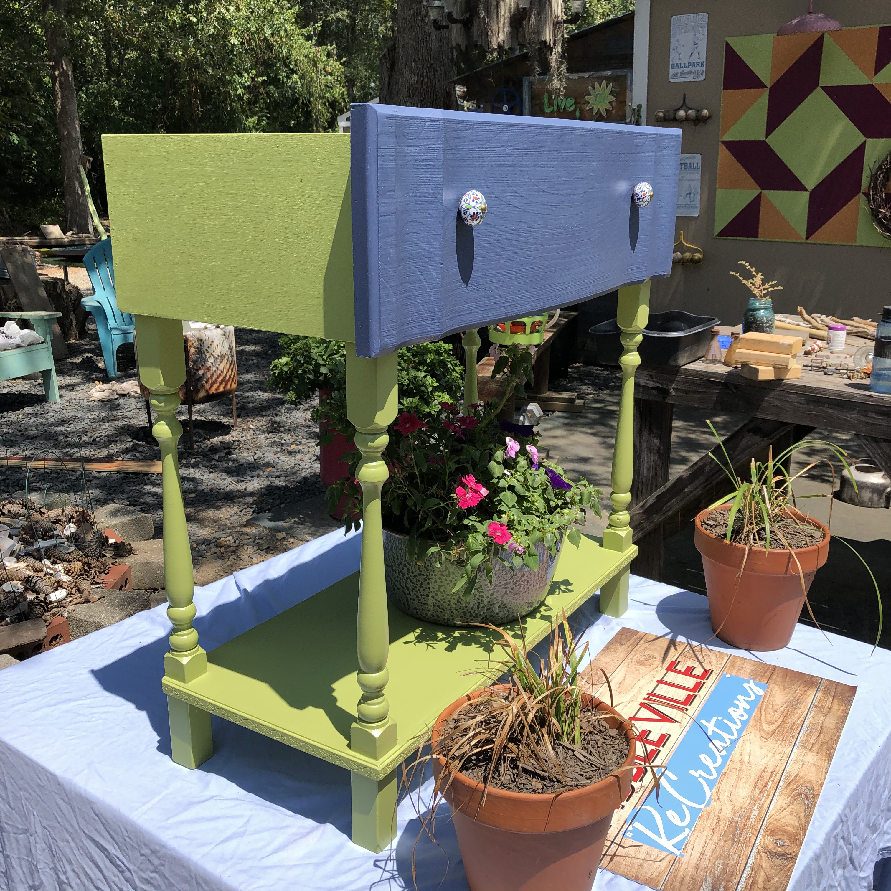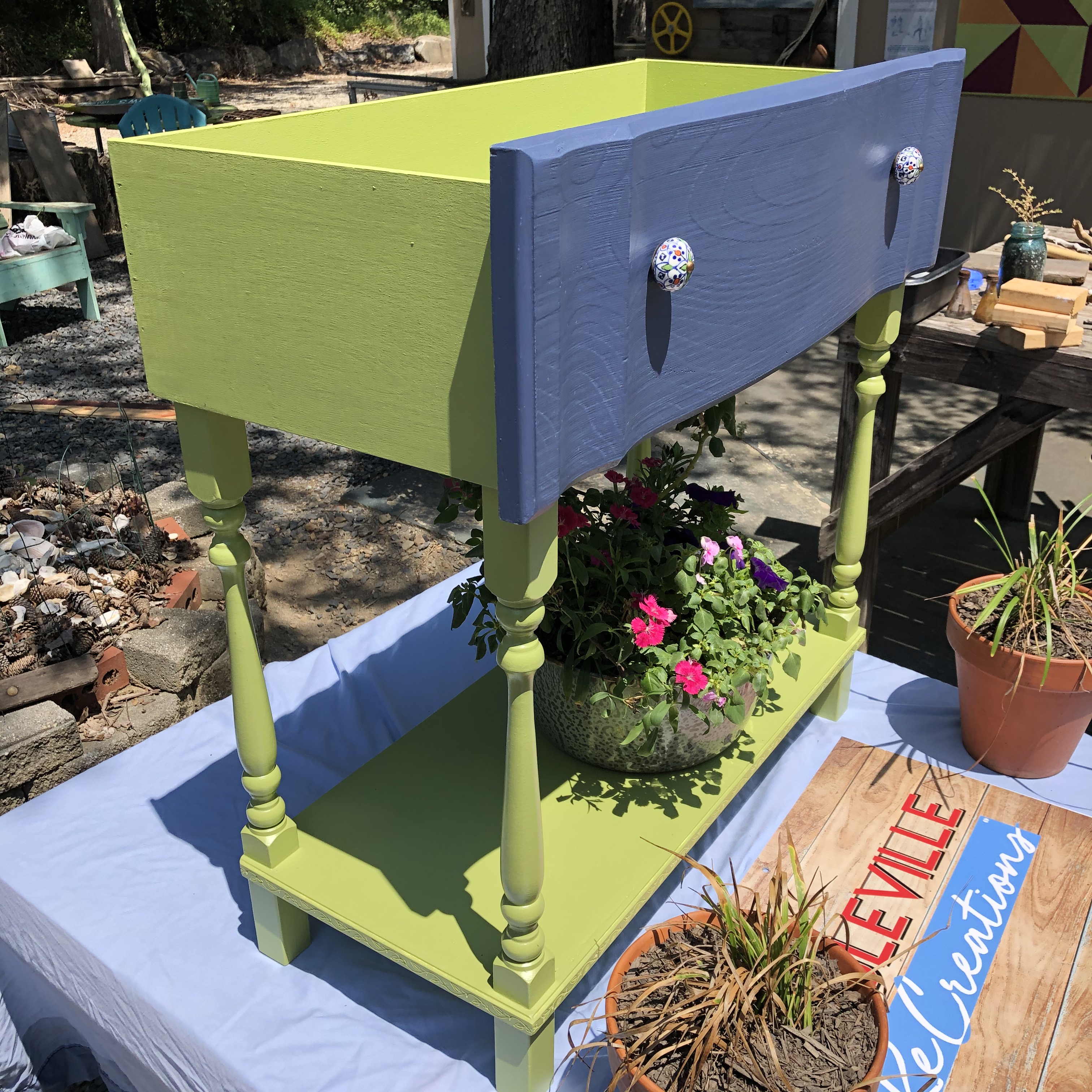 Take an old dresser drawer, (4) spindle pickets from an old stairway, a little plywood, and add a touch of color and create a perfect little planter that can be used outdoors on a port, or inside as an additional storage unit for a list of items. We took the old dresser drawer and painted the face Yankee Blue and the rest of the drawer, spindle legs, and bottom tray lime green. We replaced the old pulls with new decorative knobs to match the new colors and finished the unit in satin poly. Perfect for storing potted plants, small garden tools, or a variety of outside or inside items.