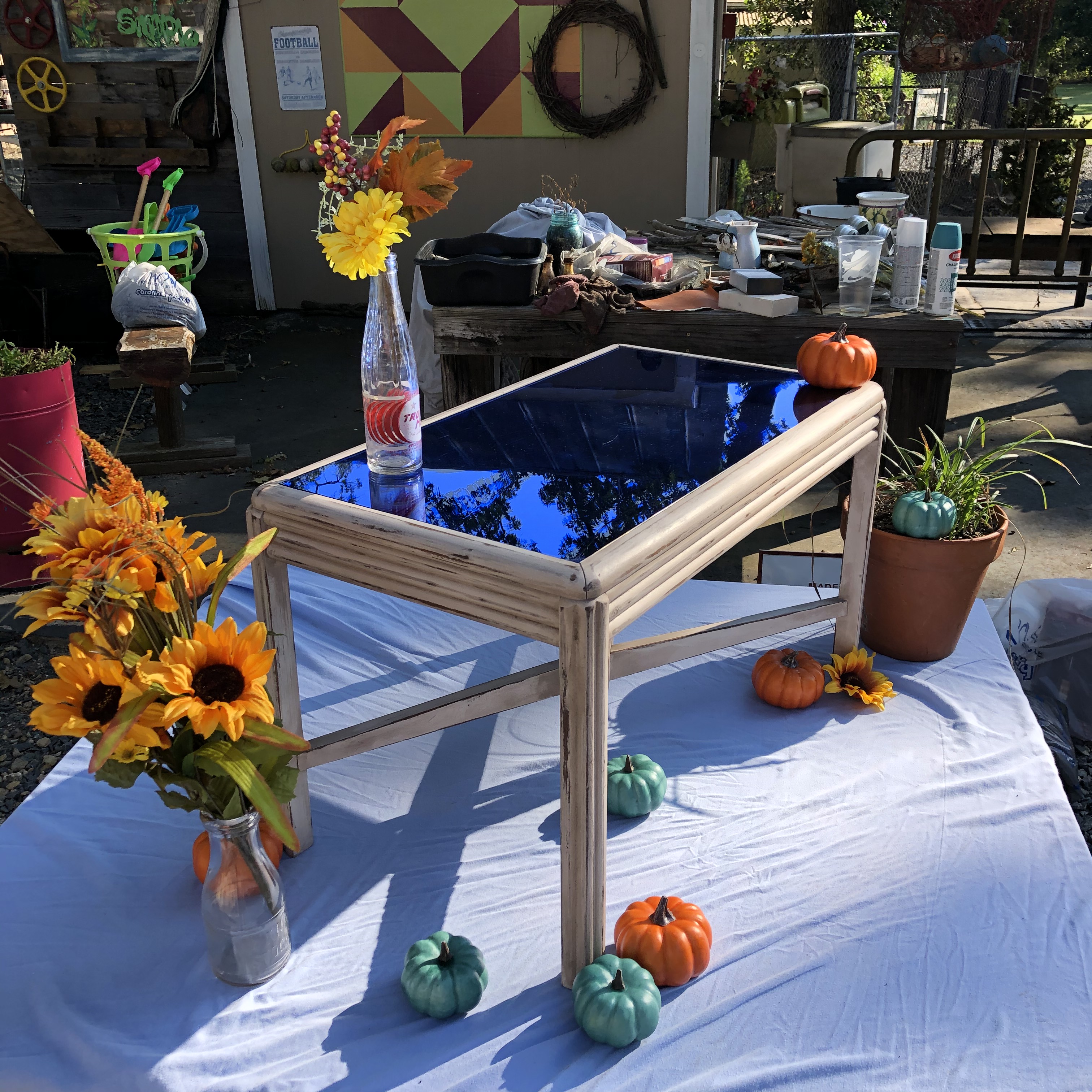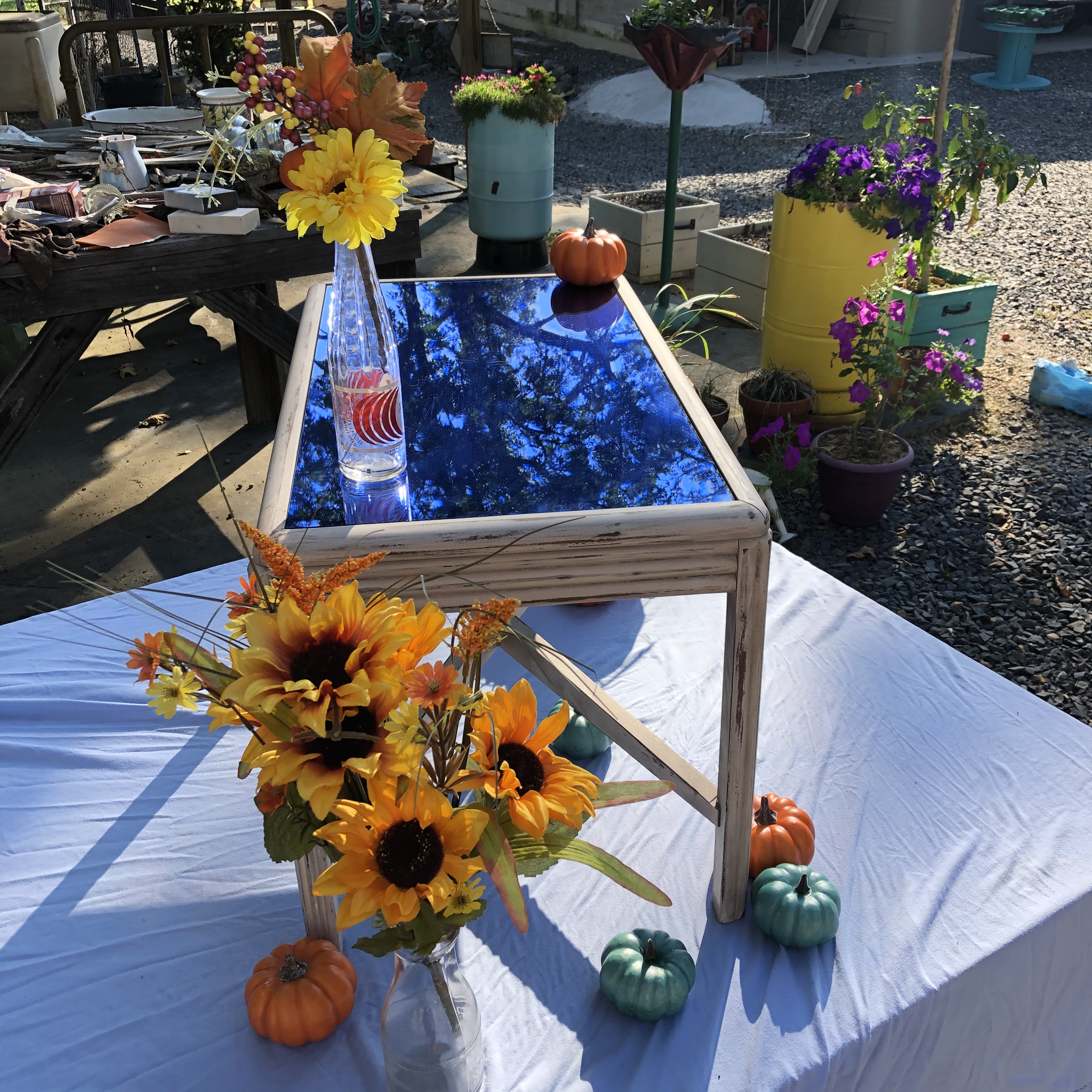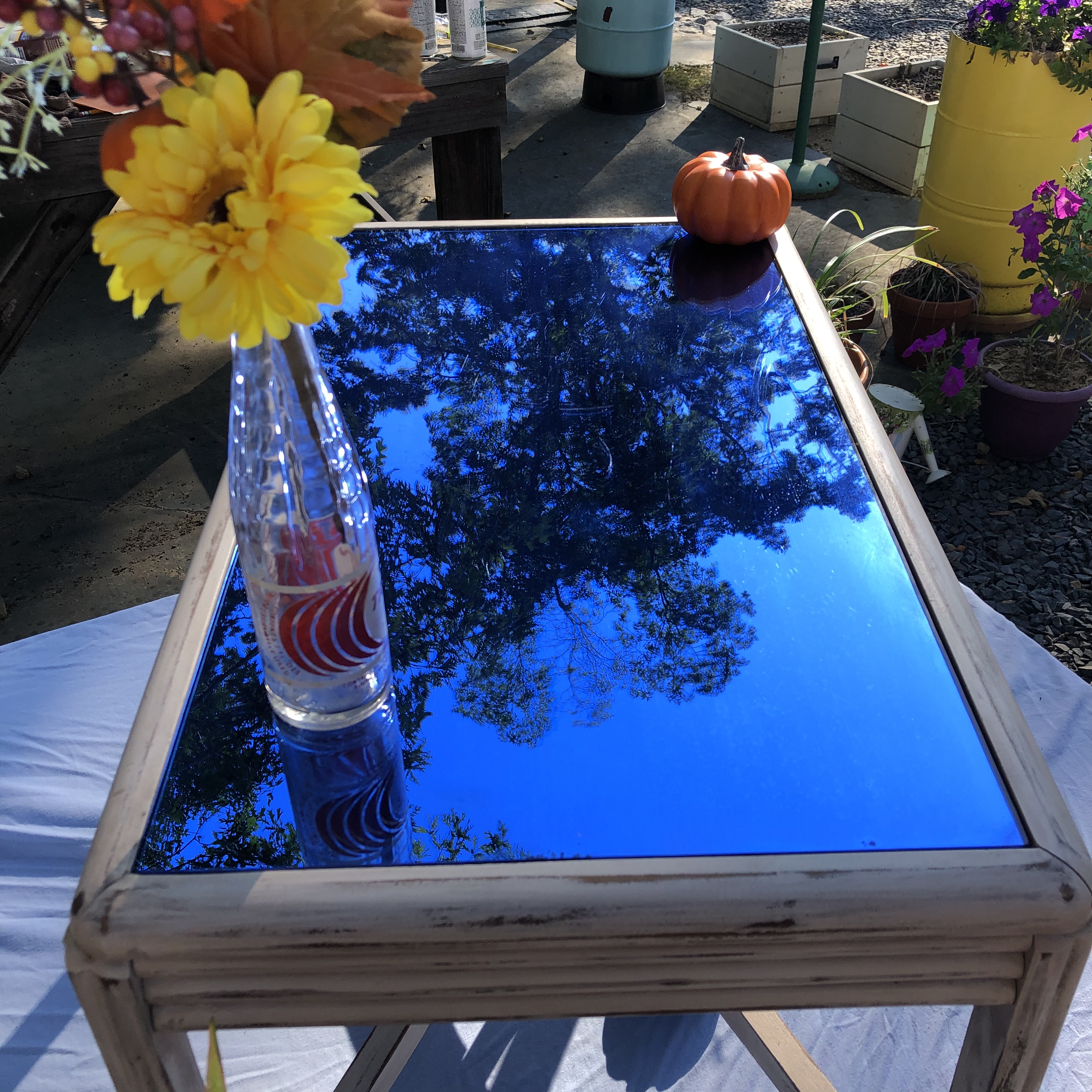 We happened to find this vintage art deco blue mirror coffee table under a pile of other older items. A little research seems to indicate that it came from the 1930s to 1940s. We can not verify that but looking at similar items online seems to confirm this. It is a very unique piece that would make a very functional accent piece for the hallway or living room. We have repainted and distressed the frame and legs on the unit. With the reflective blue mirror, we guarantee this will strike up a few conversations. Be one of few with a blue mirror coffee/accent table in your home.