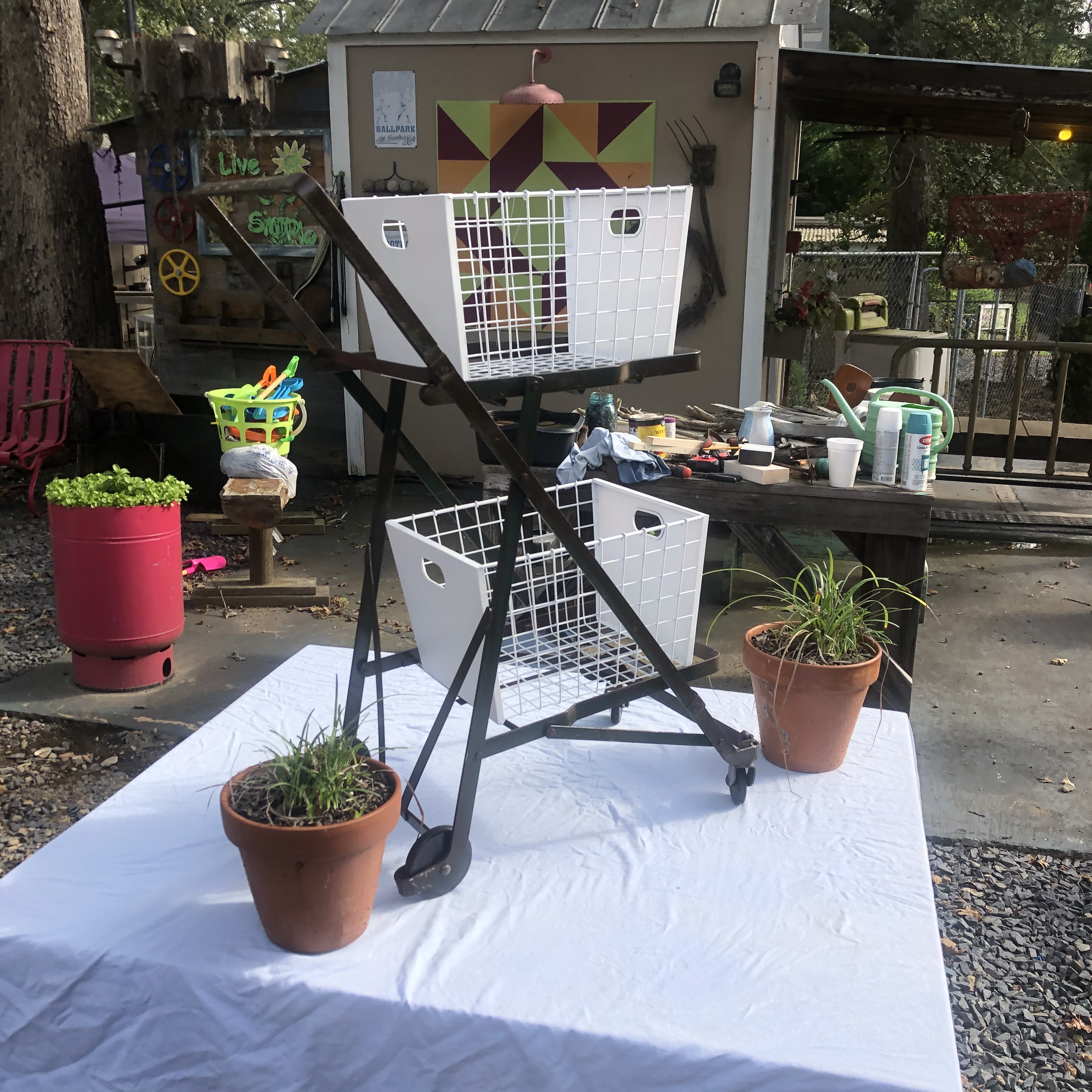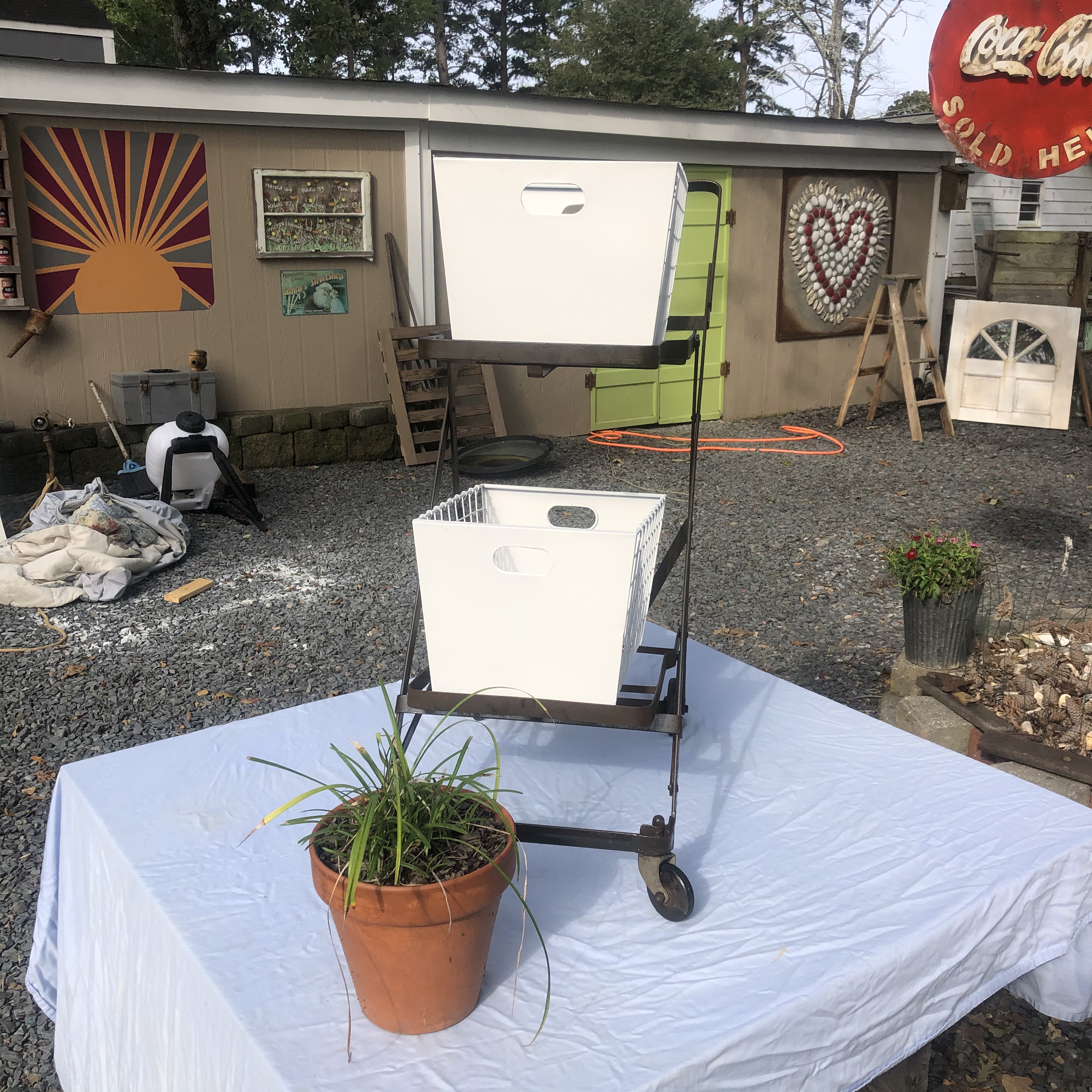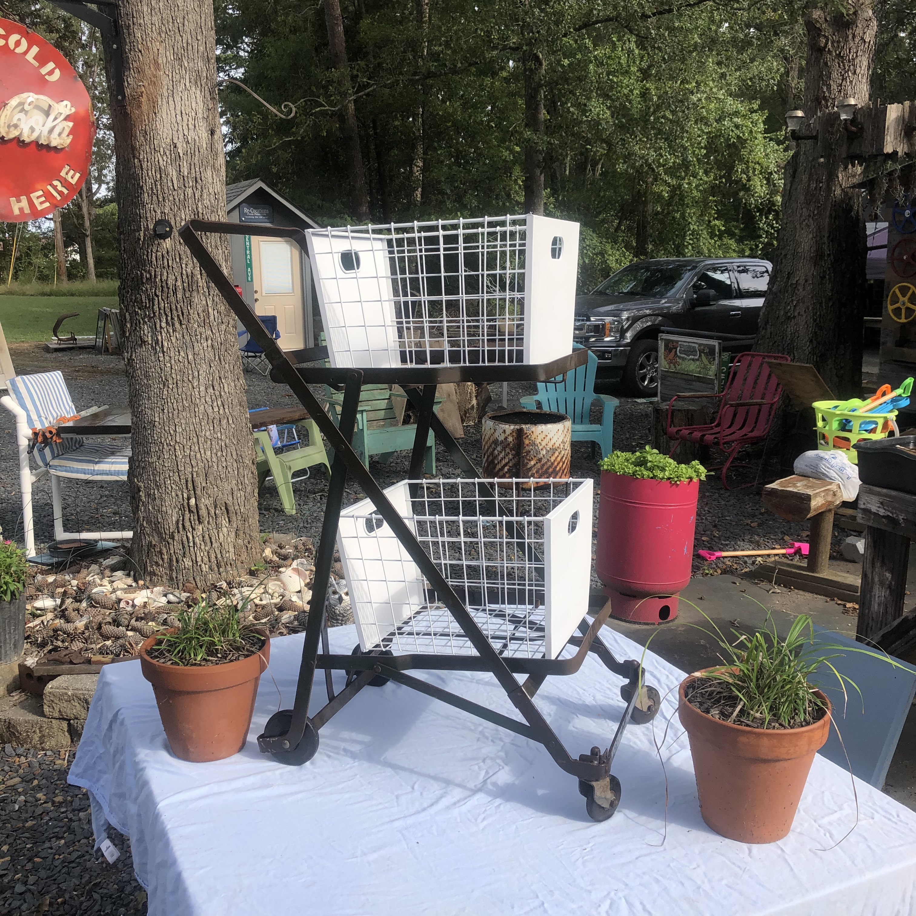 Going back to the days of full service gasoline stations, many stations displayed their car batteries on battery racks like you see here. Battery racks were on wheels that allowed them to roll them in or out at opening and closing. We found this old battery rack and then decided to add baskets where the batteries would have been located. We painted the baskets flat white to accent the rusted patina of the old battery rack. This unit has a wide variety of uses inside (storage or display) or outside (planter). Own a piece of the past before items like this are gone forever.