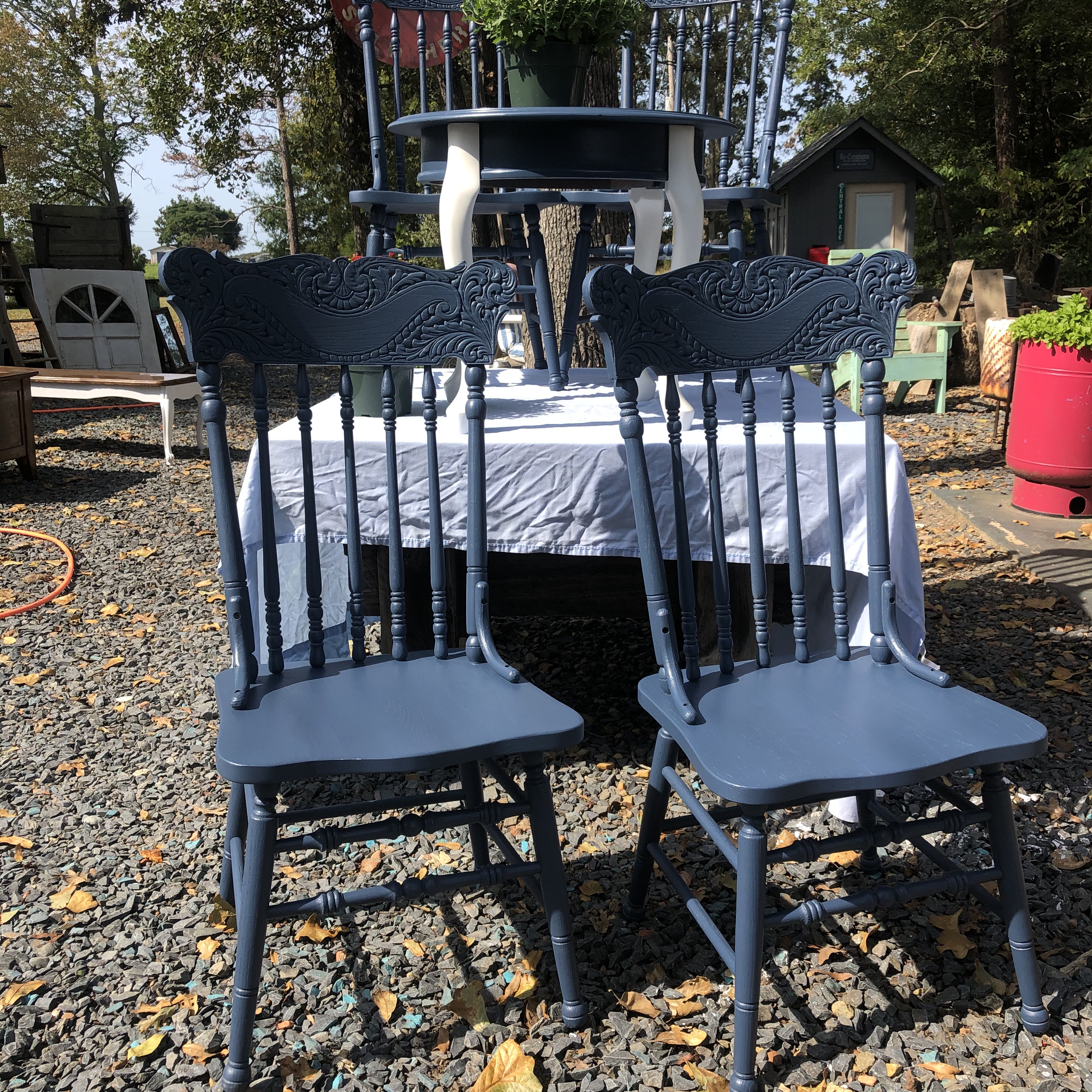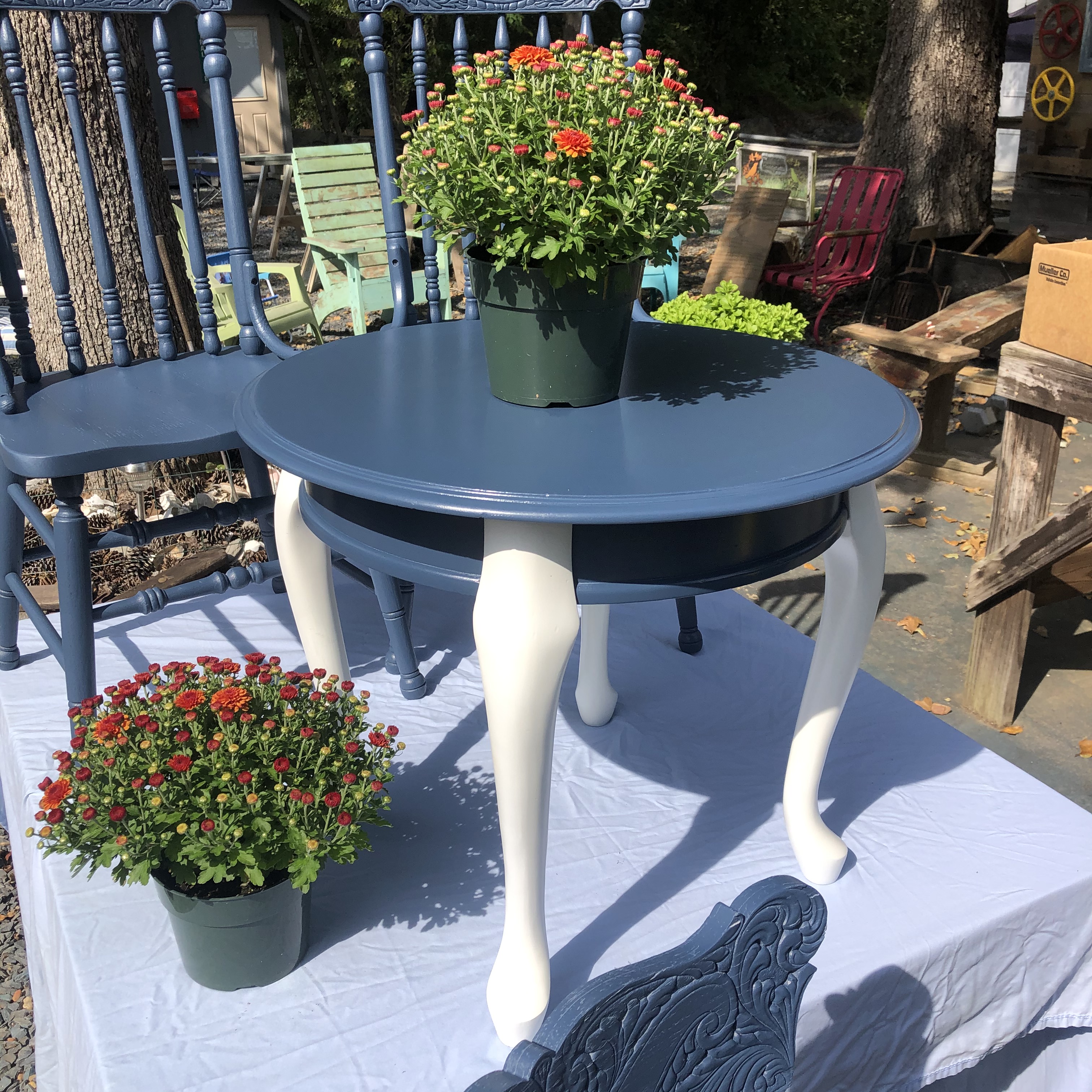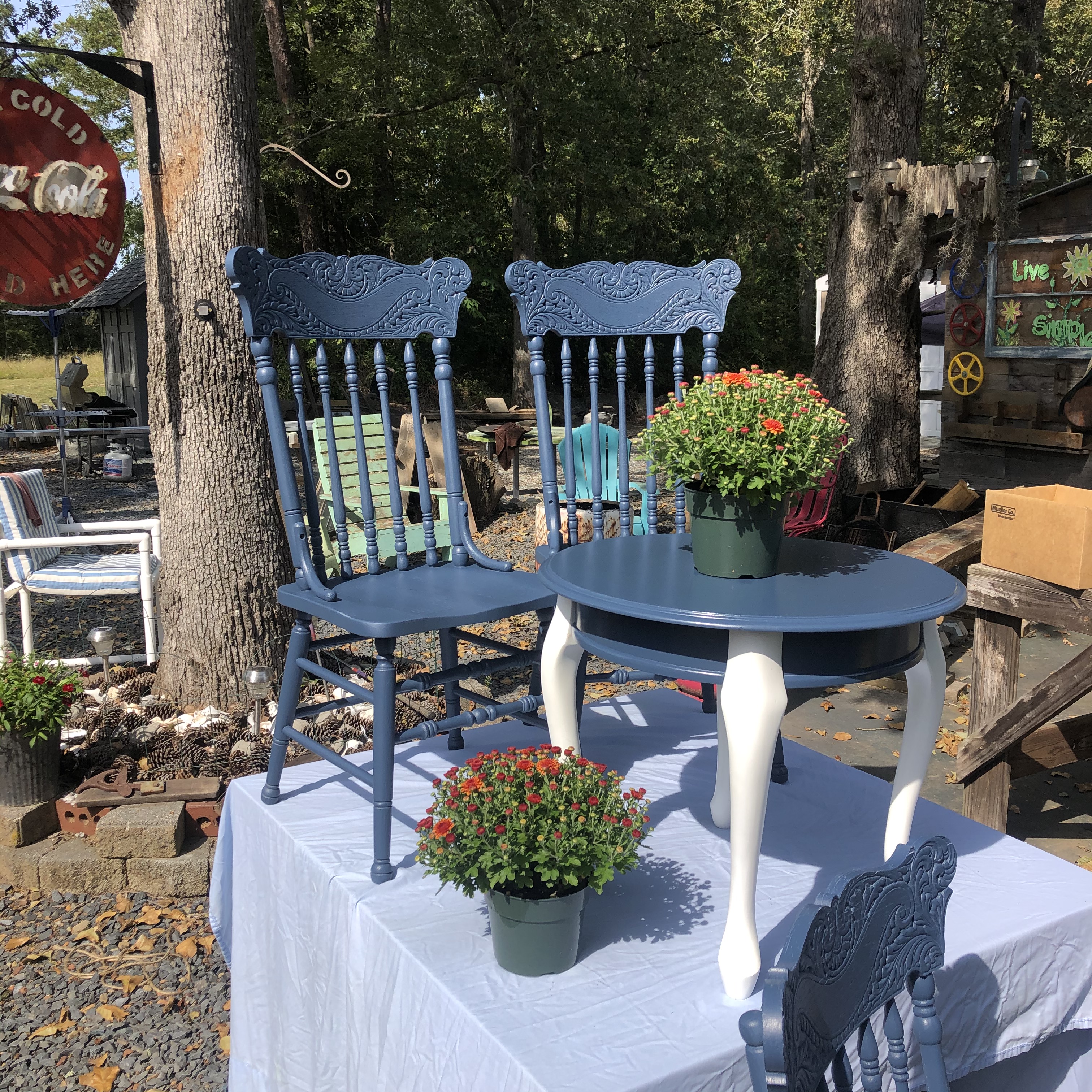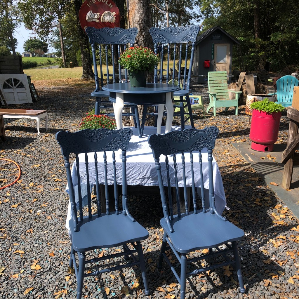 Four older vintage chairs would make a unique addition to any room within the house. These chairs have some very intricate designs in the chair backs and some beautiful spindle work from the backs through the legs. We finished the chairs and the table with Moon Shade blue while painting the table legs white. Perfect addition for a sun room, living room, or even the dining room if needed.